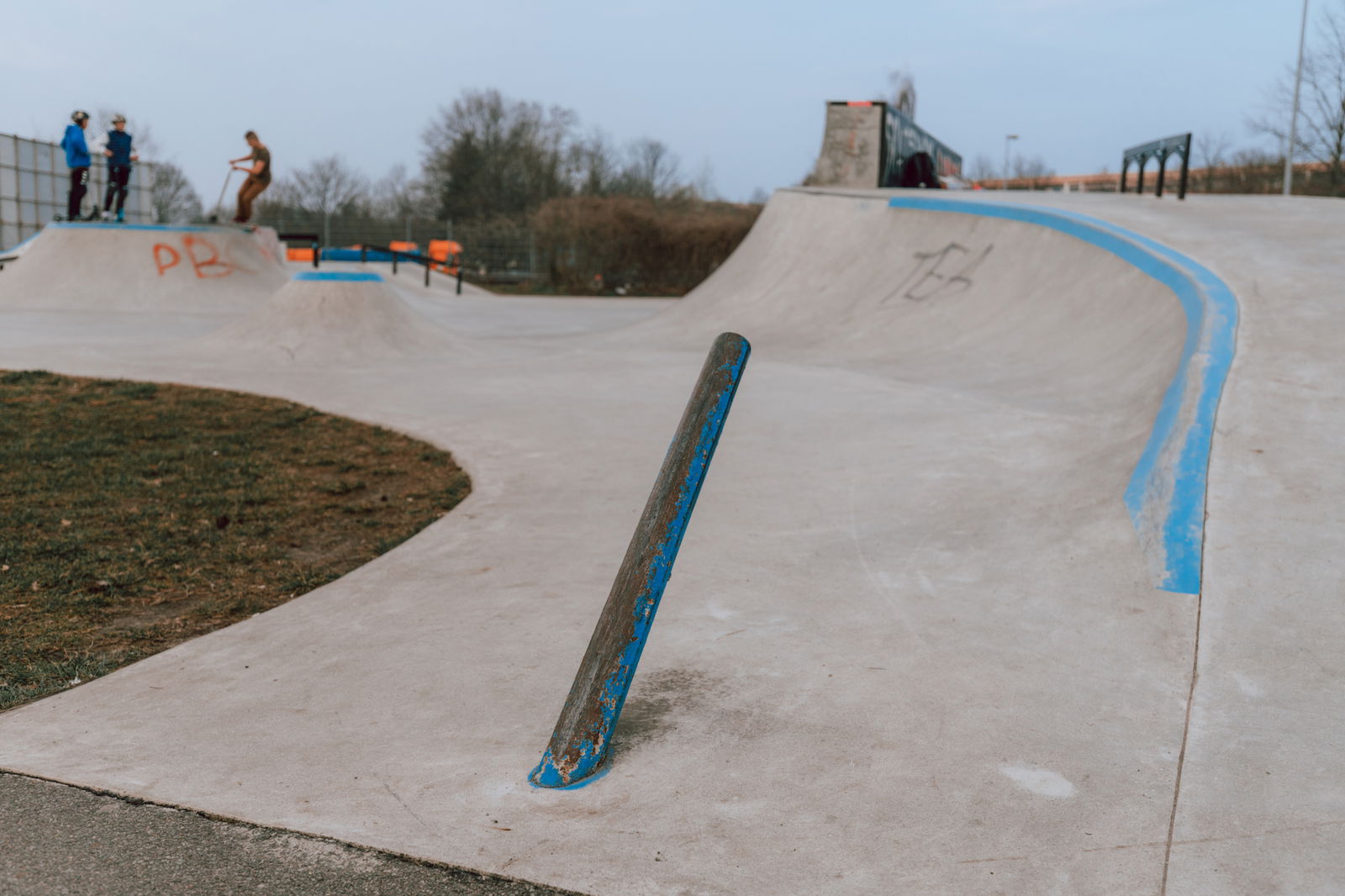 A pole jam is a short metal pole that is planted rather steeply in the ground that skaters use to grind and jump off. When you want to learn to ride a pole, rule numer one is to first find a pole that's not too steep. The steeper it is, the harder it's going to be. Get comfortable riding a board before you give poles an attempt. And the older you get, the more this rule applies.