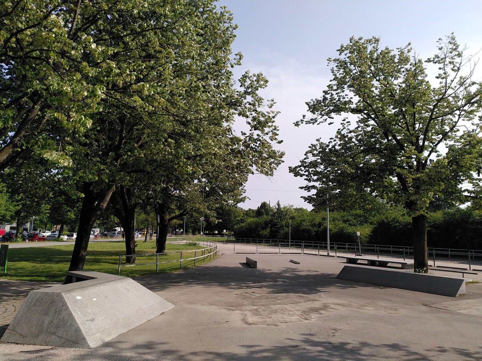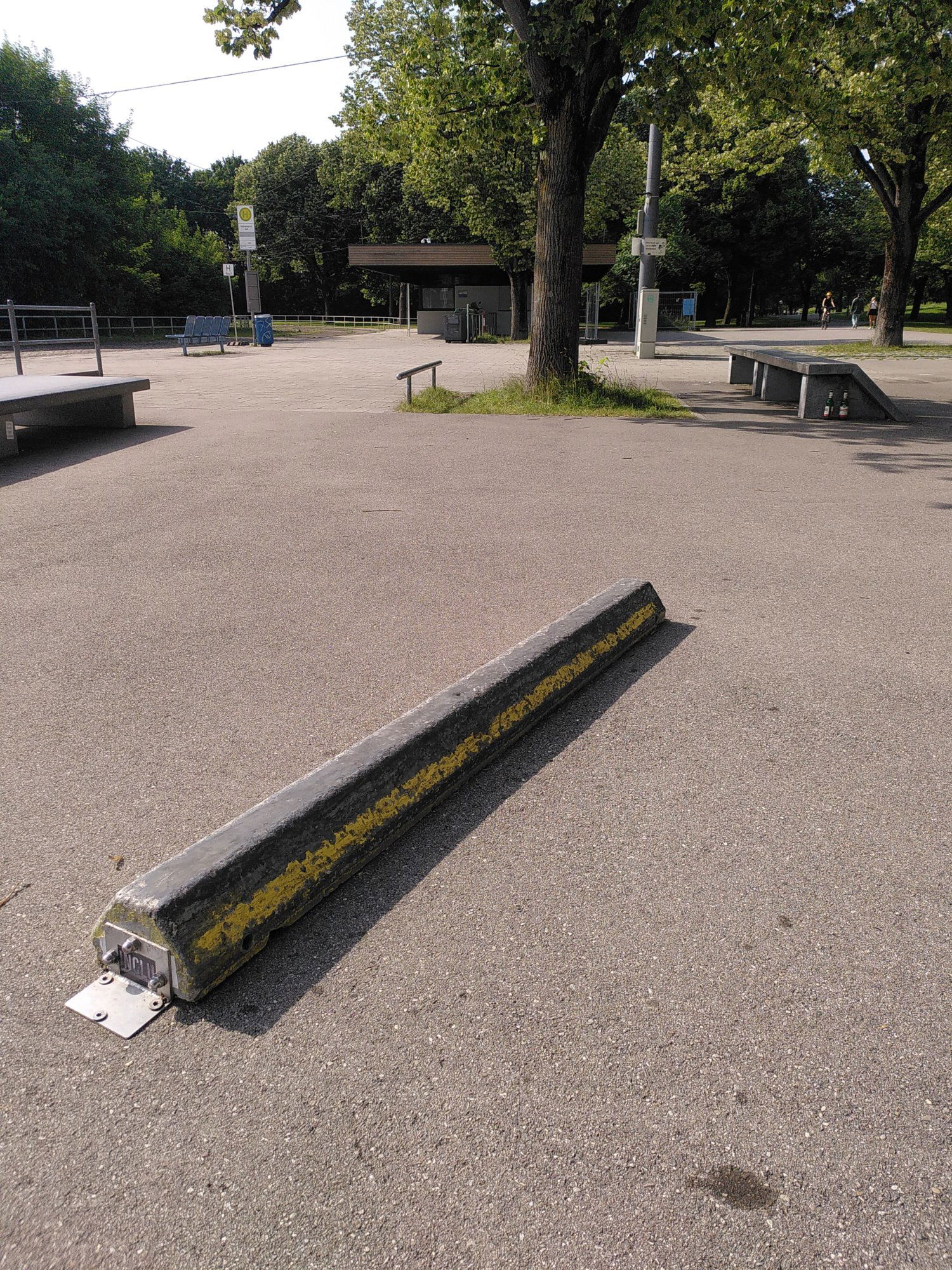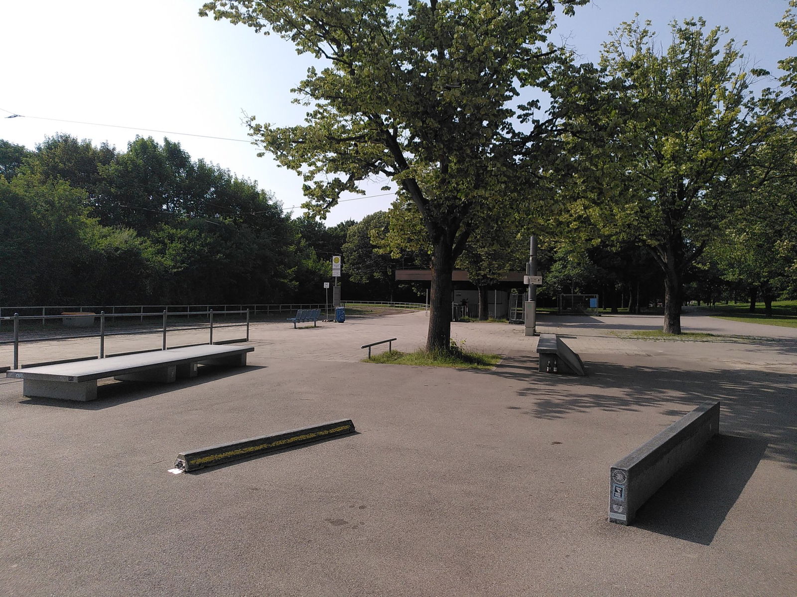 Olympia Skatepark is a ca. 200 square meters plus park surrounded with a flatground. Nice little street park with obstacles not found too often in Munich. One of the very few "slappyable" parks. It is surrounded by more "sidewalk style" flatground.