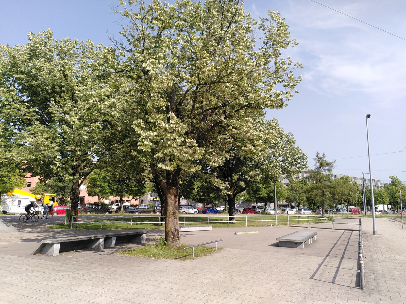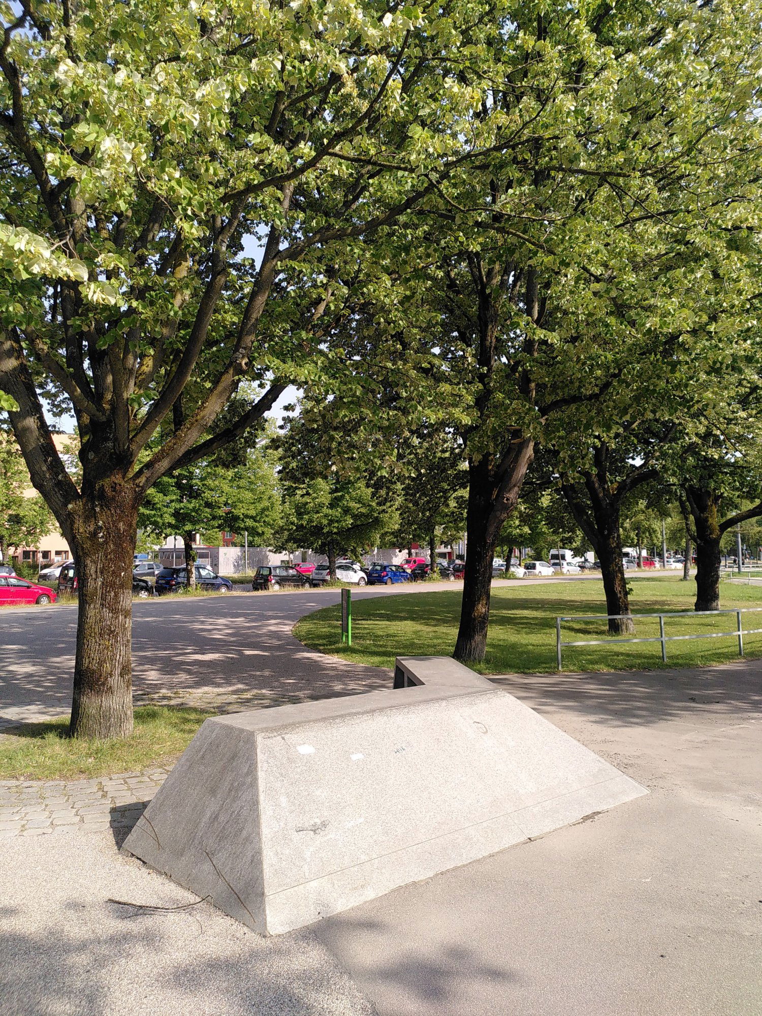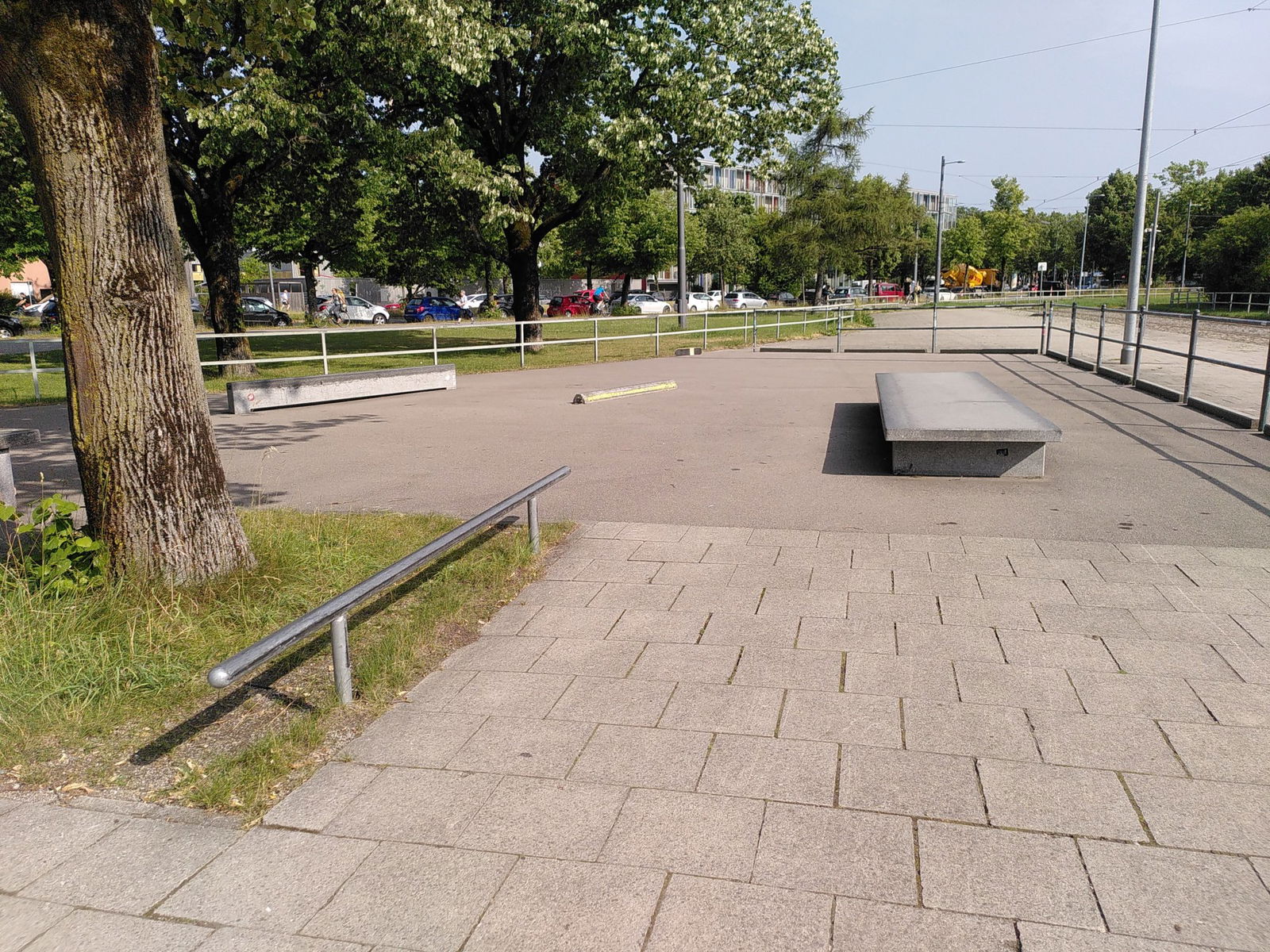 Olympia Skatepark is a ca. 200 square meters plus park surrounded with a flatground. Nice little street park with obstacles not found too often in Munich. One of the very few "slappyable" parks. It is surrounded by more "sidewalk style" flatground.