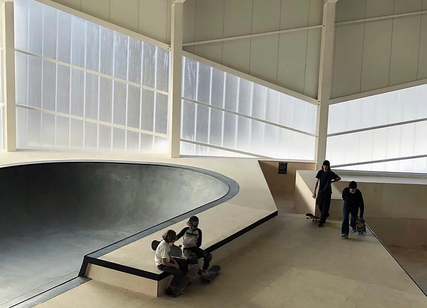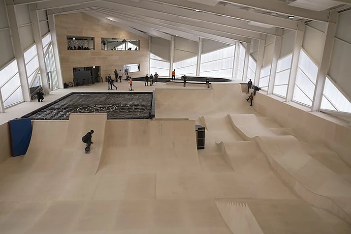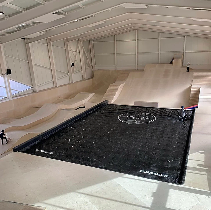 The skatepark features both indoor and outdoor areas, including a modern street plaza, a 3-level concrete bowl, a snake run, and a Big Air ramp with a soft landing into an airbag. These elements cater to athletes of all skill levels and disciplines. The indoor section of the park is especially known for its versatility, providing a mix of street and transition obstacles.