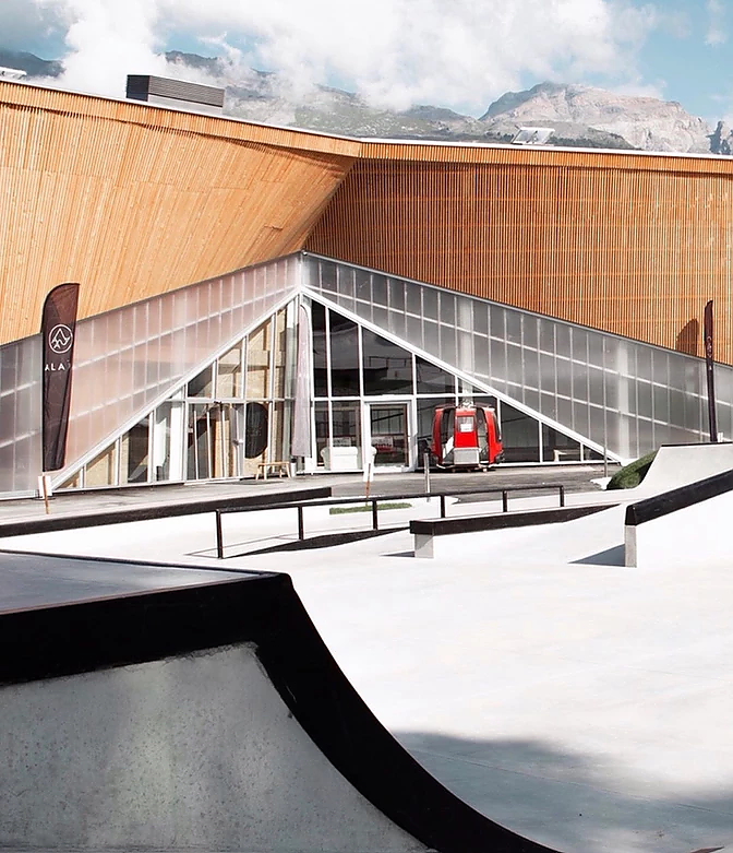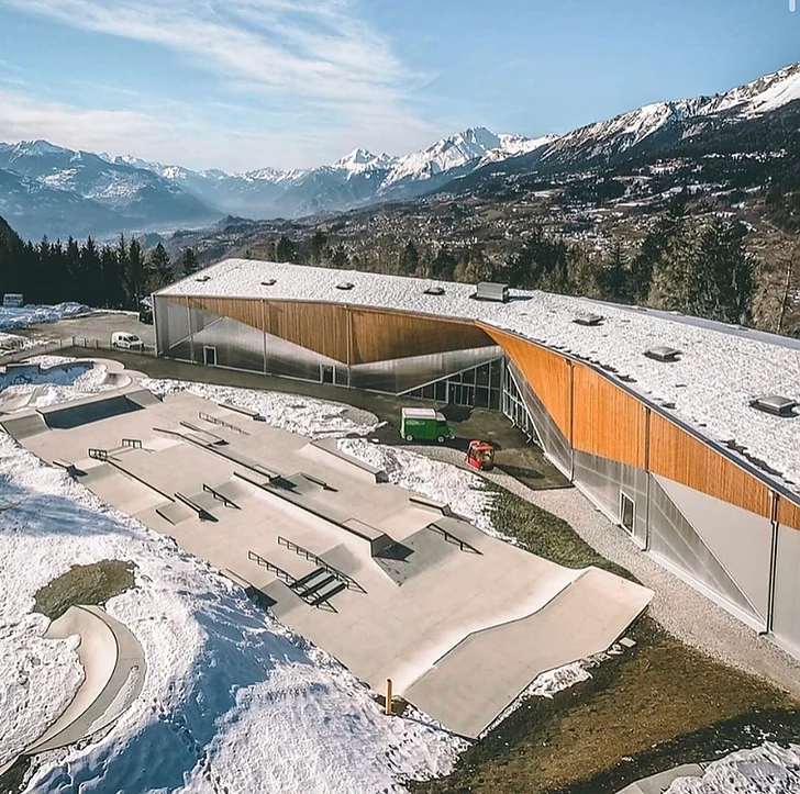 Alaïa Chalet, located near Crans-Montana, Switzerland, is the country's largest indoor and outdoor action sports center, spanning over 5,000 square meters. Opened in 2019, it was designed and built by California Skateparks, a leader in skatepark design, and offers a wide range of facilities for skateboarding, snowboarding, BMX, and freeskiing.