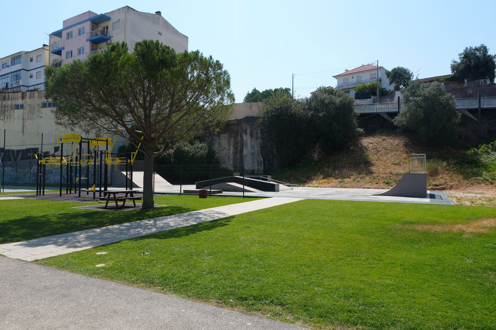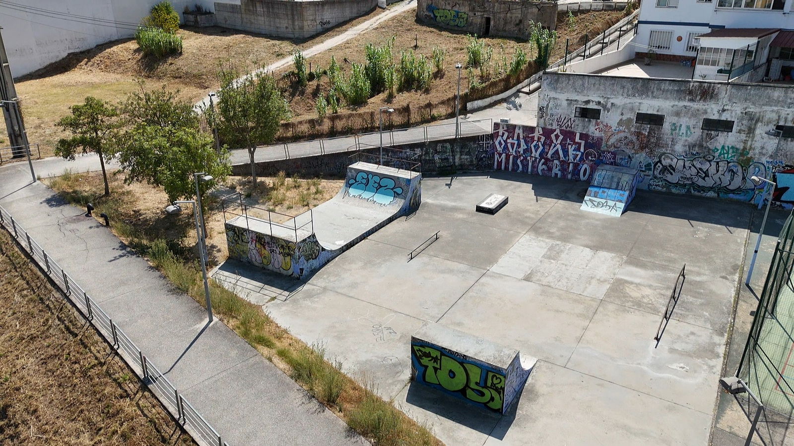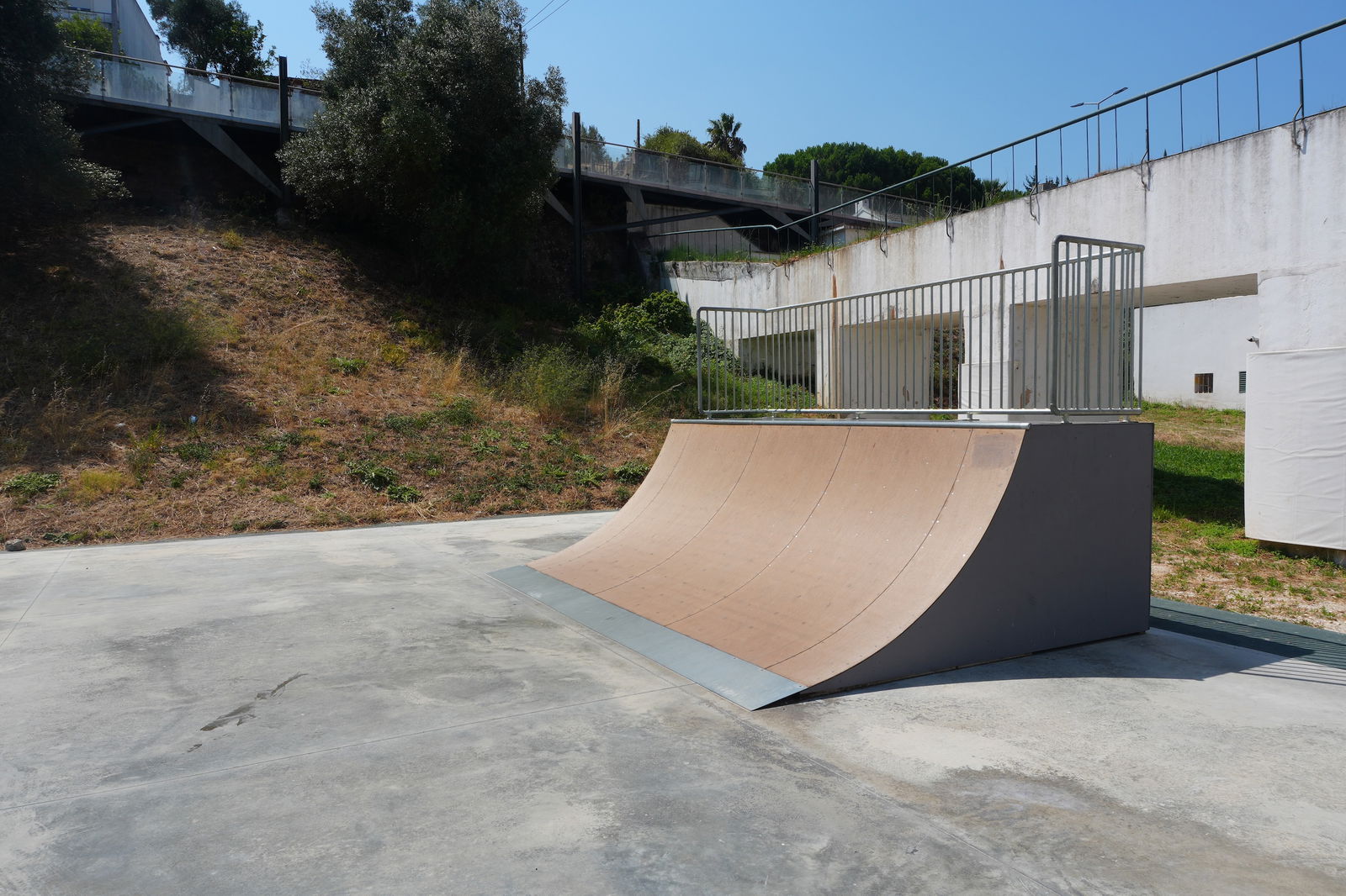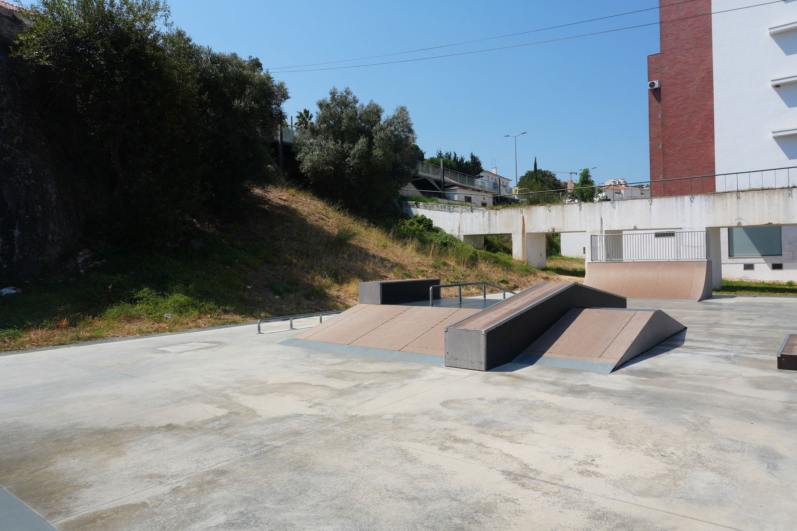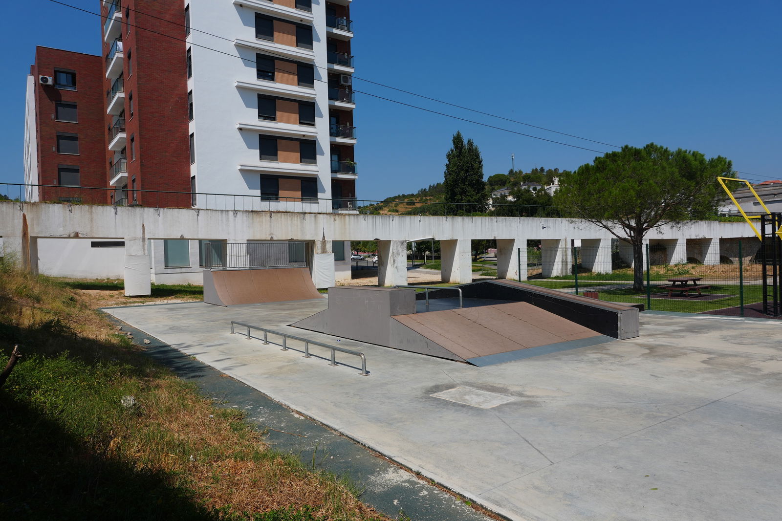 Alenquer is Portuguese municipality in the district of Lisbon, with a population of 44428 (2021 Census). In Parque Urbano da Romeira park in Alenquer you will find the skatepark of Alenquer. The park is made up of a concrete miniramp and several basic skateboarding obstacles in a back and forth setup.