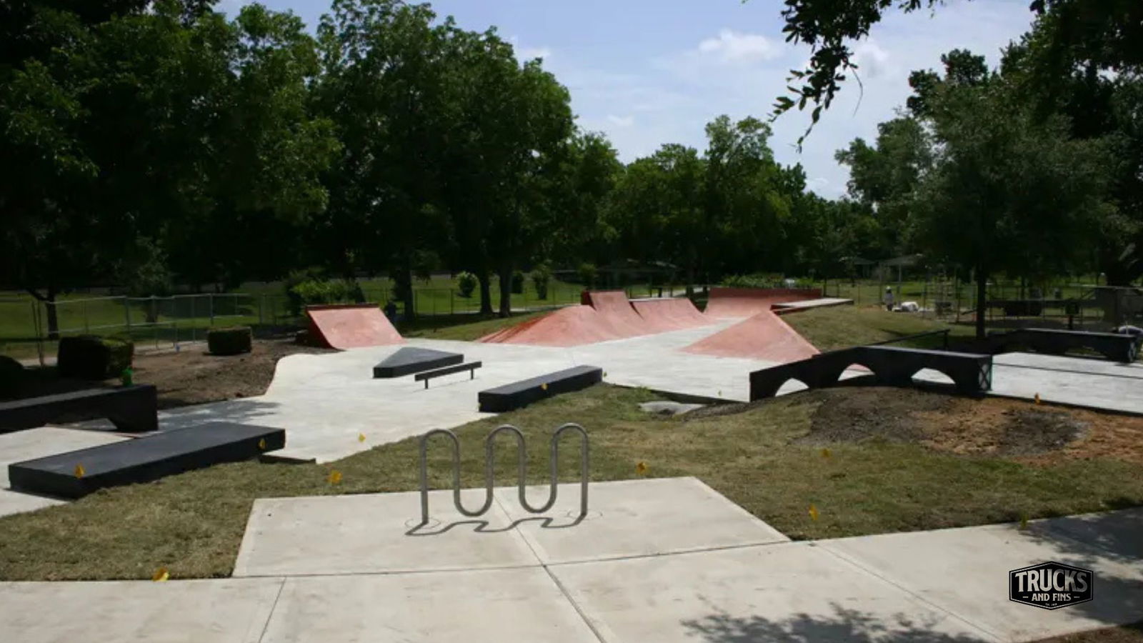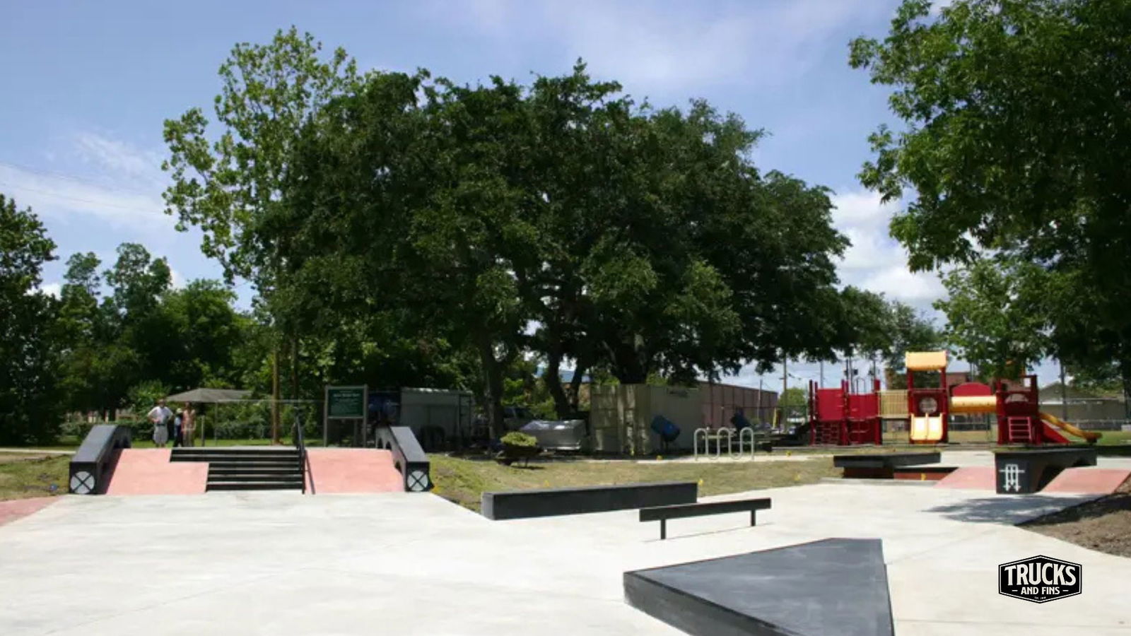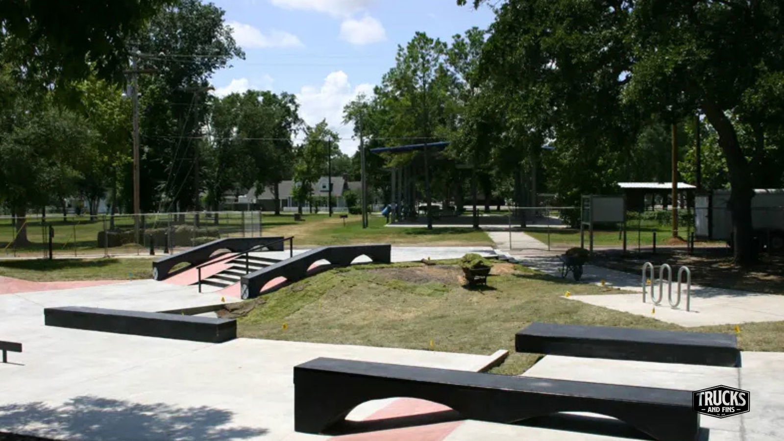 The Alvin, Texas Skatepark Plaza, located in the heart of the city's beloved National Oak Park, sits just a few blocks from City Hall and the downtown business district. The project began with SPA Skateparks leading a site selection process alongside the City Council and Parks Board, resulting in a unanimous recommendation to build within this well-used and centrally located park. Known as a community gathering space, the site already hosted citywide events and is connected to other parks via a network of walking trails.