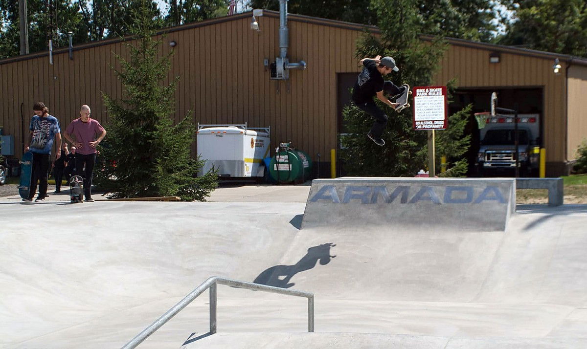 Armada Skatepark, located in Armada Township, Michigan, is a 6,000-square-foot concrete skatepark that opened in 2017. The park was built by SpohnRanch Skateparks, a prominent skatepark design and construction firm, after nearly a decade of advocacy from local community members, including Jacob Gritzinger and Tyler Ross. Their grassroots efforts to create a public skatepark for their small town, located an hour north of Detroit, finally came to fruition after years of fundraising and planning.