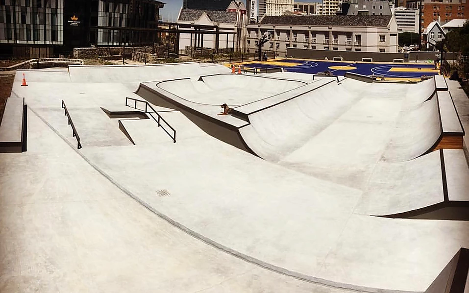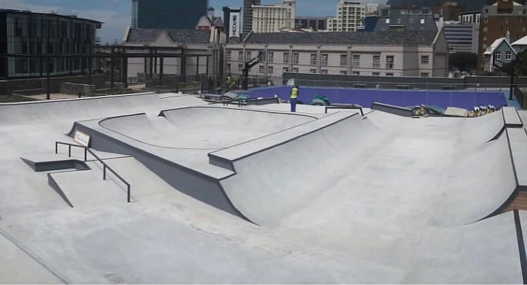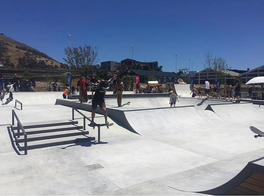 The skatepark features a combination of elements for both skaters and scooter riders, including a bowl with a spine and pump hump, quarter pipes, layback banks, gaps, a small plaza with hubbas and rails, and a long ledge. These features are designed to cater to skaters of all levels. The park is built on top of a four-story parking structure, offering stunning views of Table Mountain and the surrounding harbor.