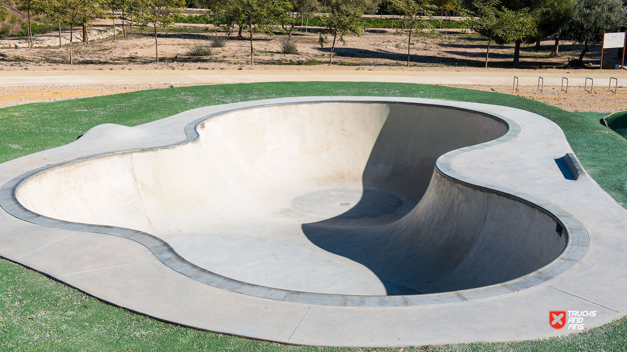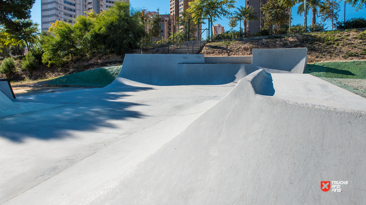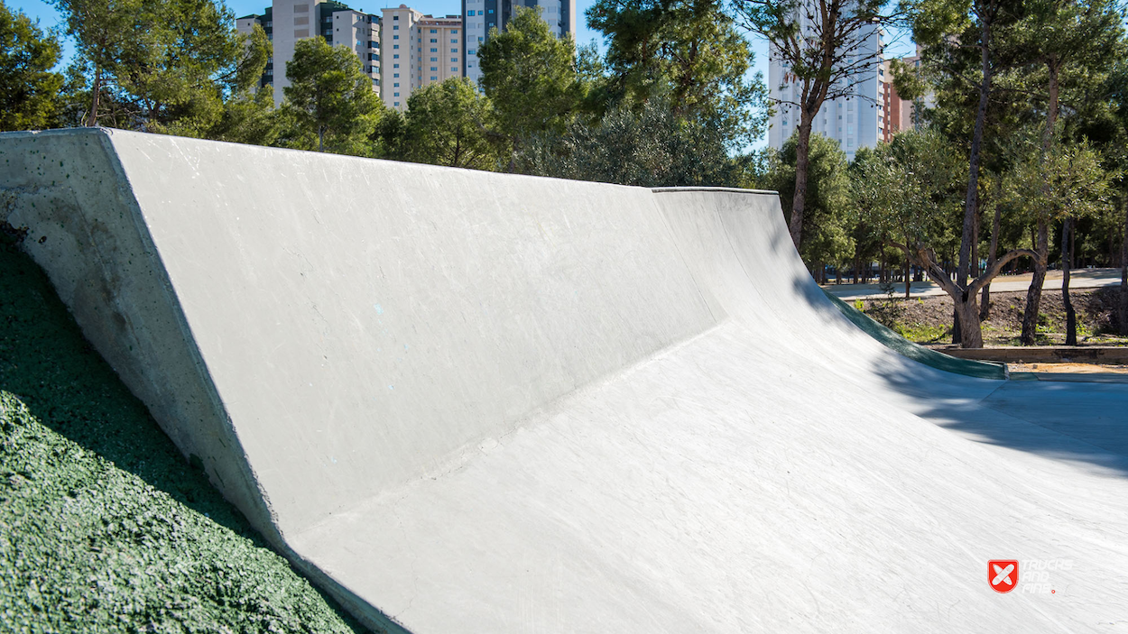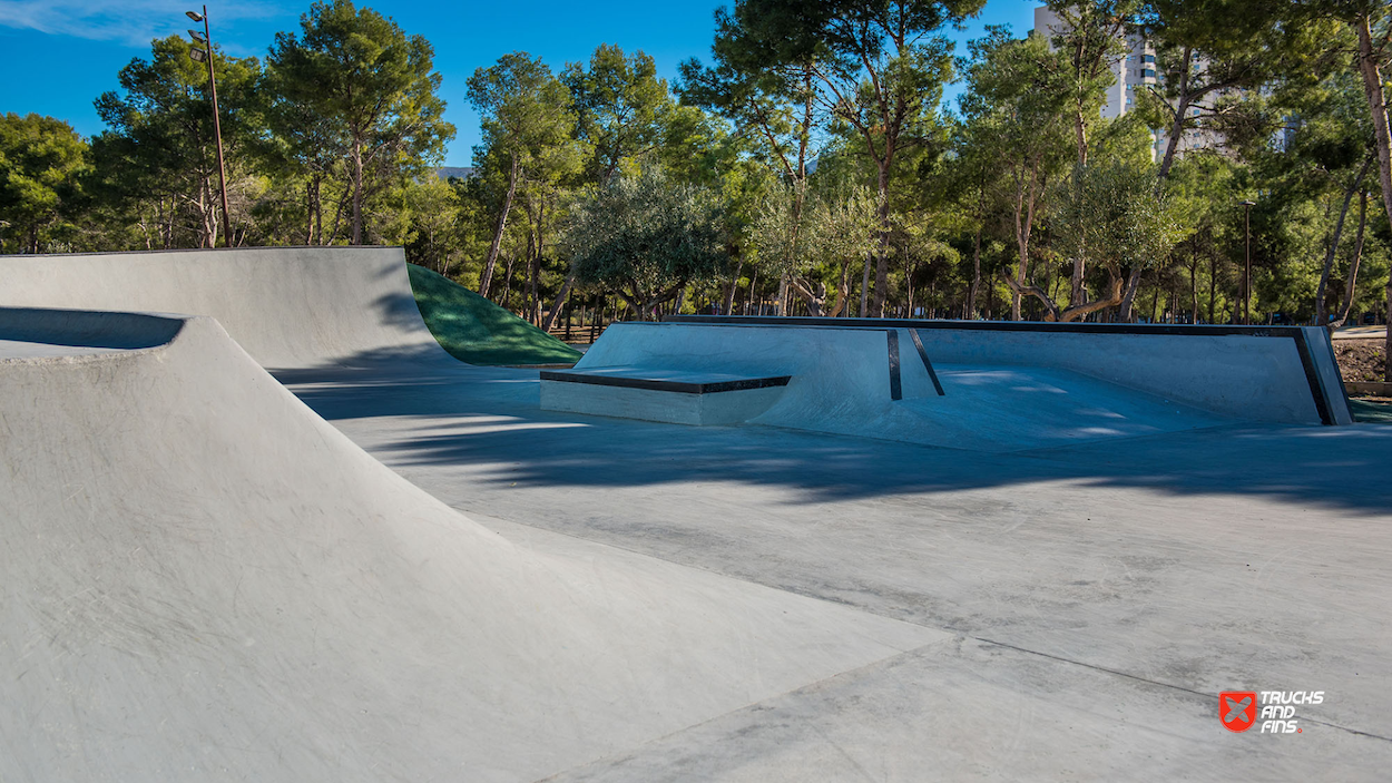 Benidorm skatepark is a small concrete skatepark featuring a small area dedicated to street in a back and forth setup. The skatepark also has a small bowl with stone coping. The 830 m2 skatepark was built by Copinramps in 2019 and is located in Parque de la Séquia Mare.