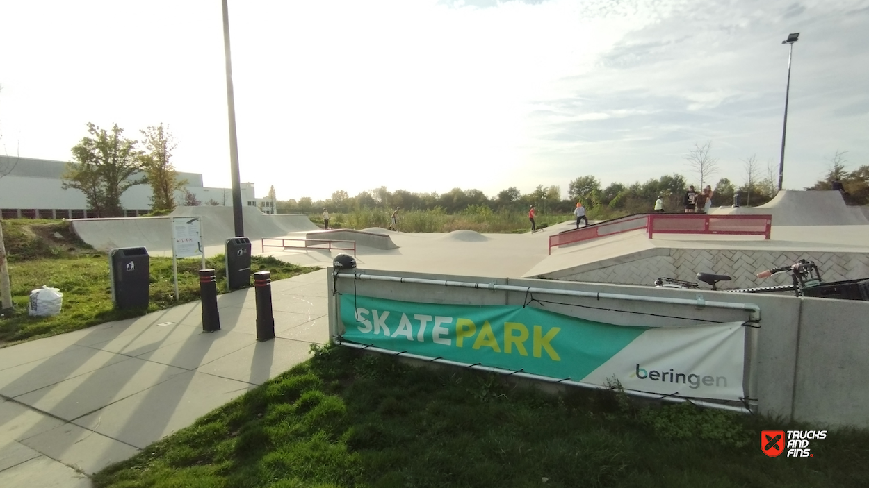 The Beringen skatepark, located in the Bogaarsveld area of Beringen, Belgium, is an outdoor concrete skatepark designed to cater to both street and transition skaters. It features various elements such as a half-open bowl of approximately 1.5 meters high, stairs with rails, a wallride, and banks or quarters, providing diverse options for different skating styles.