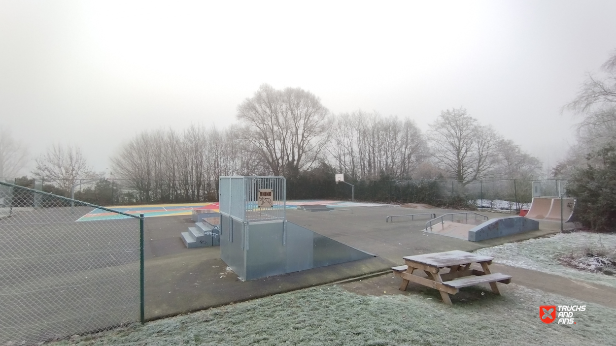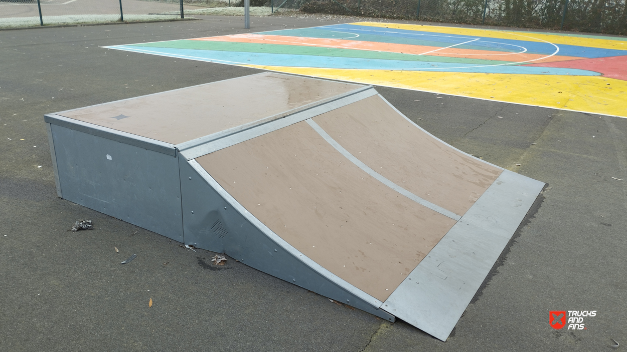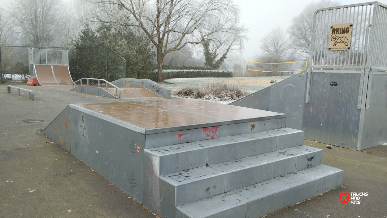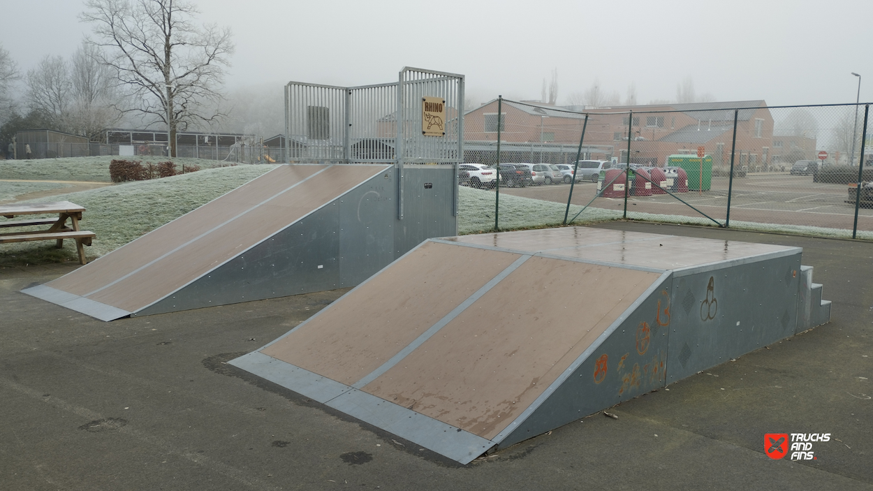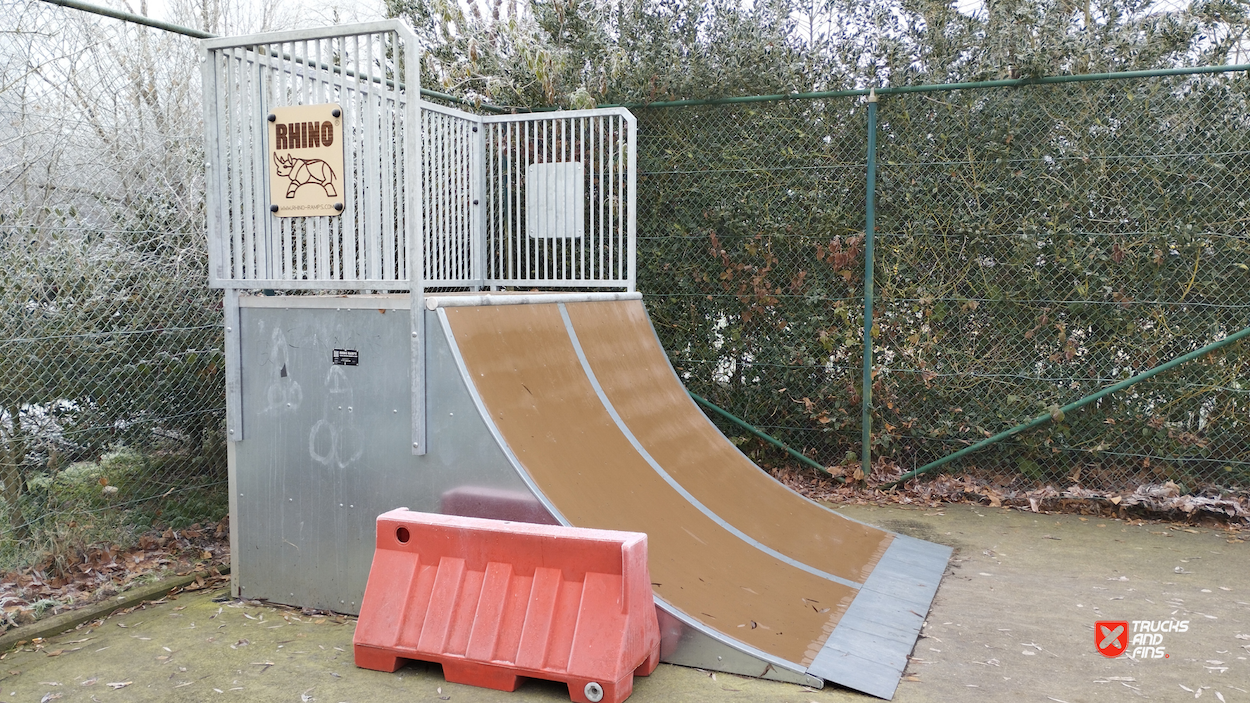 Berlaar skatepark is made up of a back and forth run with a quarter pipe and flat bank on either side of a funbox. The skatepark was built by Rhino ramps.