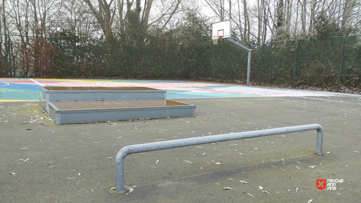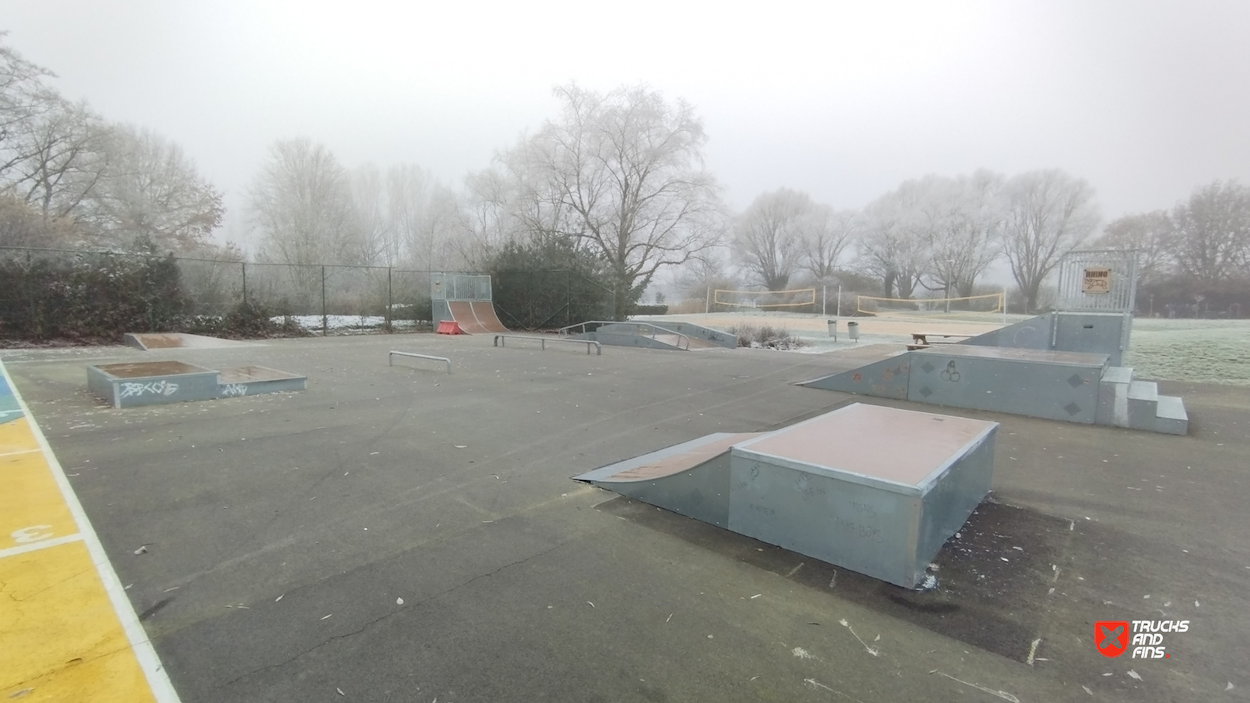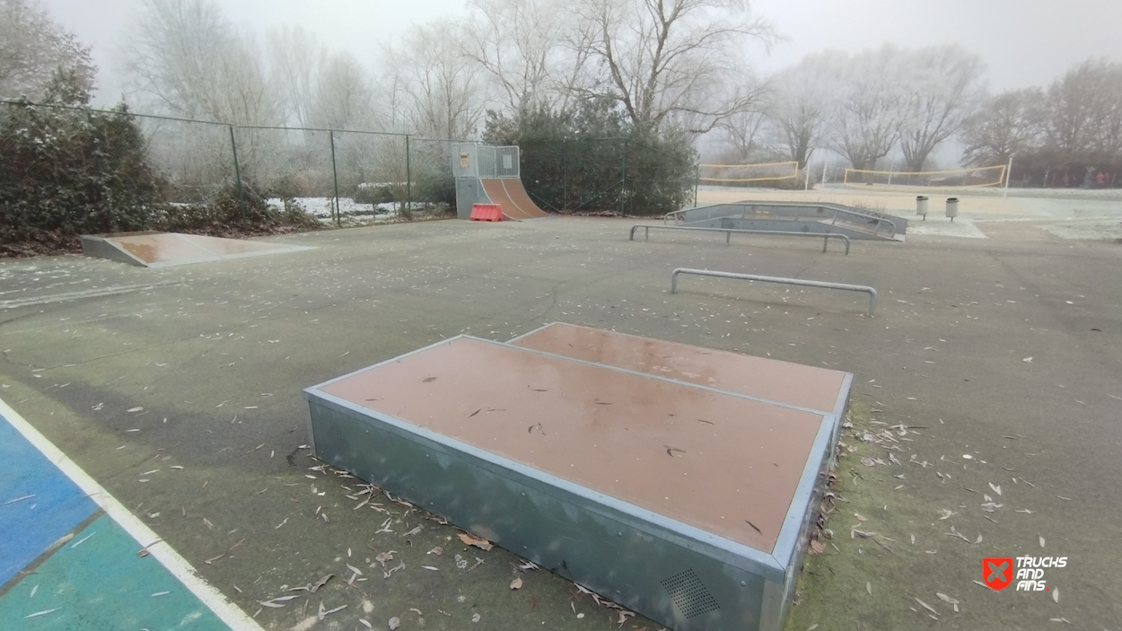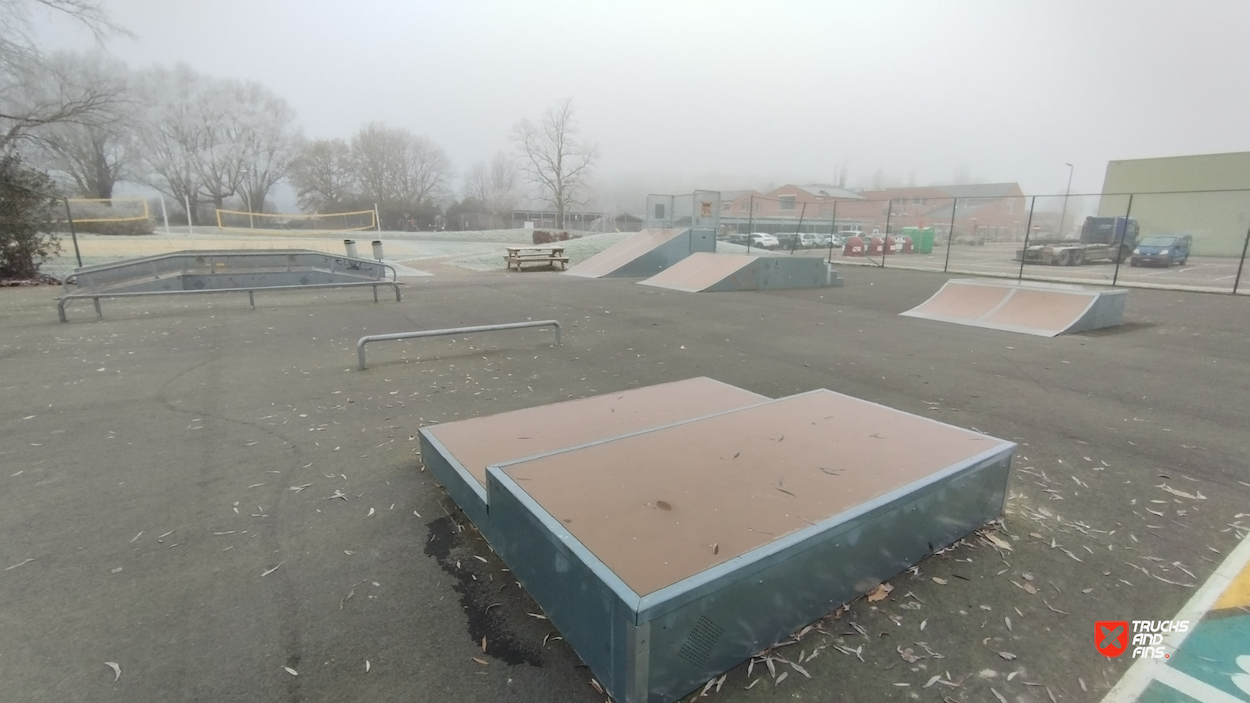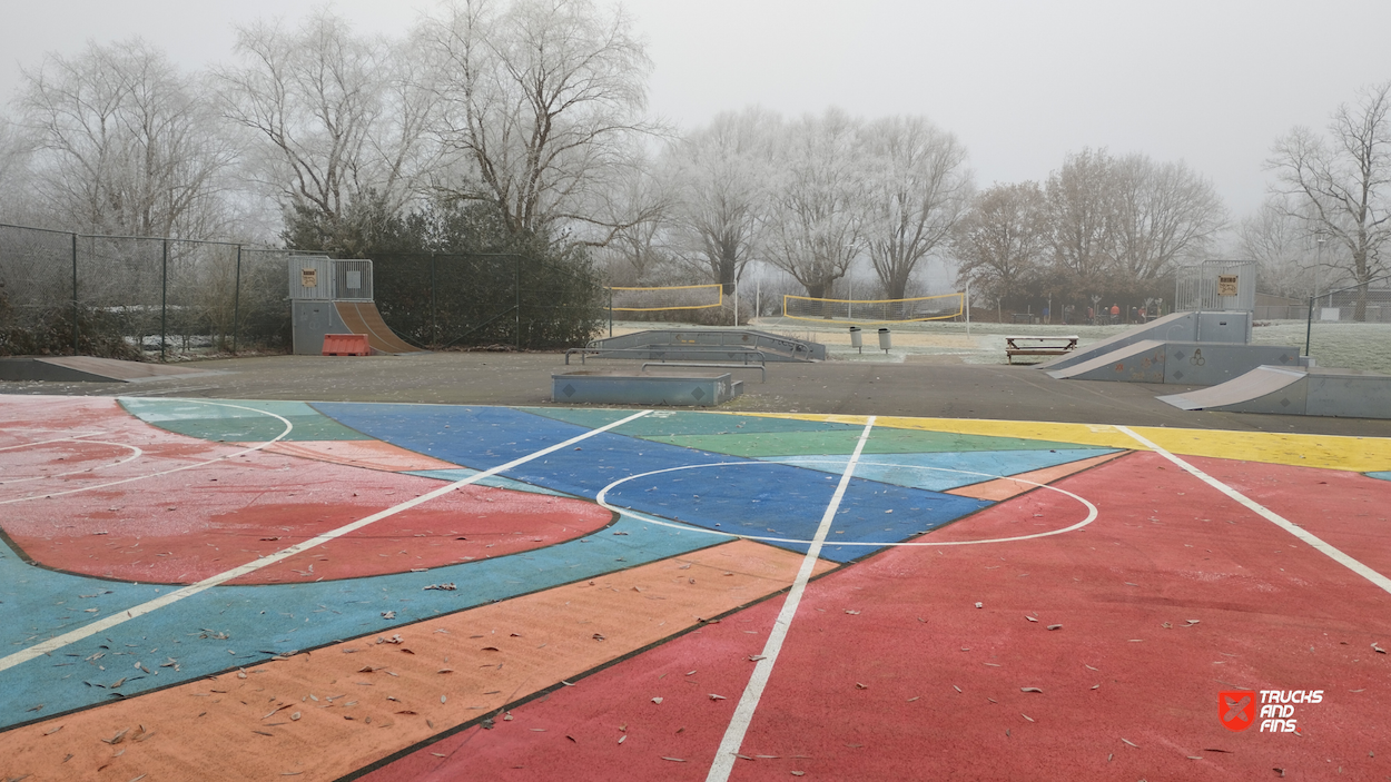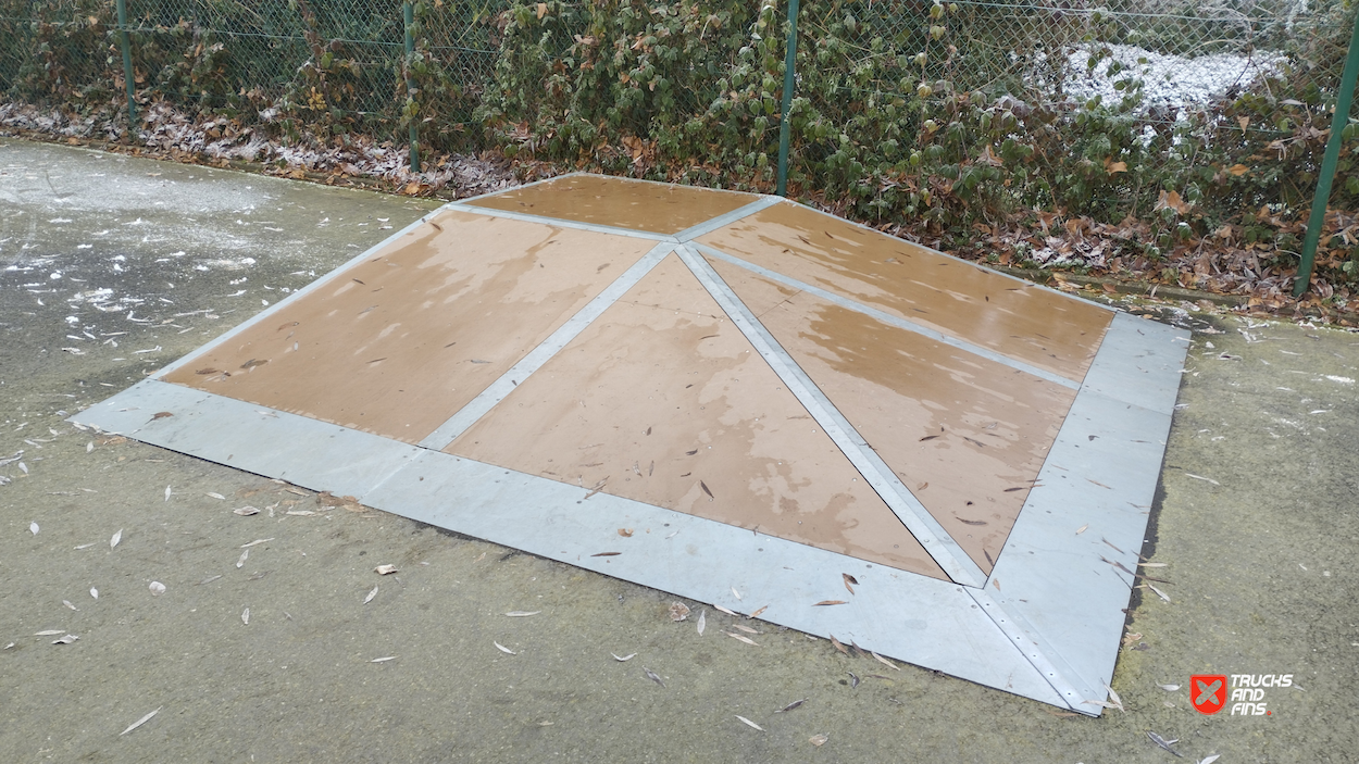 Berlaar skatepark is made up of a back and forth run with a quarter pipe and flat bank on either side of a funbox. The skatepark was built by Rhino ramps.