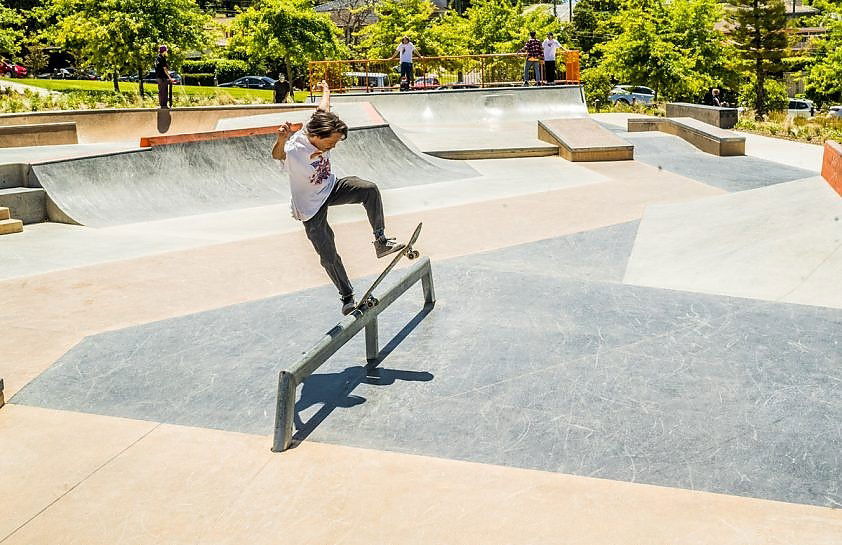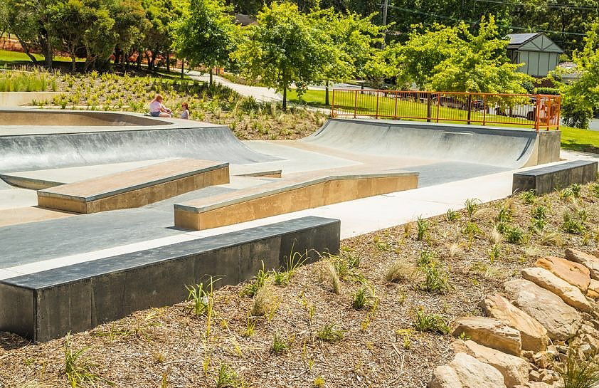 The skatepark is designed to fit within the steep terrain of the reserve, with terraced seating areas that provide ample space for spectators. The facility also includes a dog park, fitness equipment, and spaces for social activities, making it a key community hub.