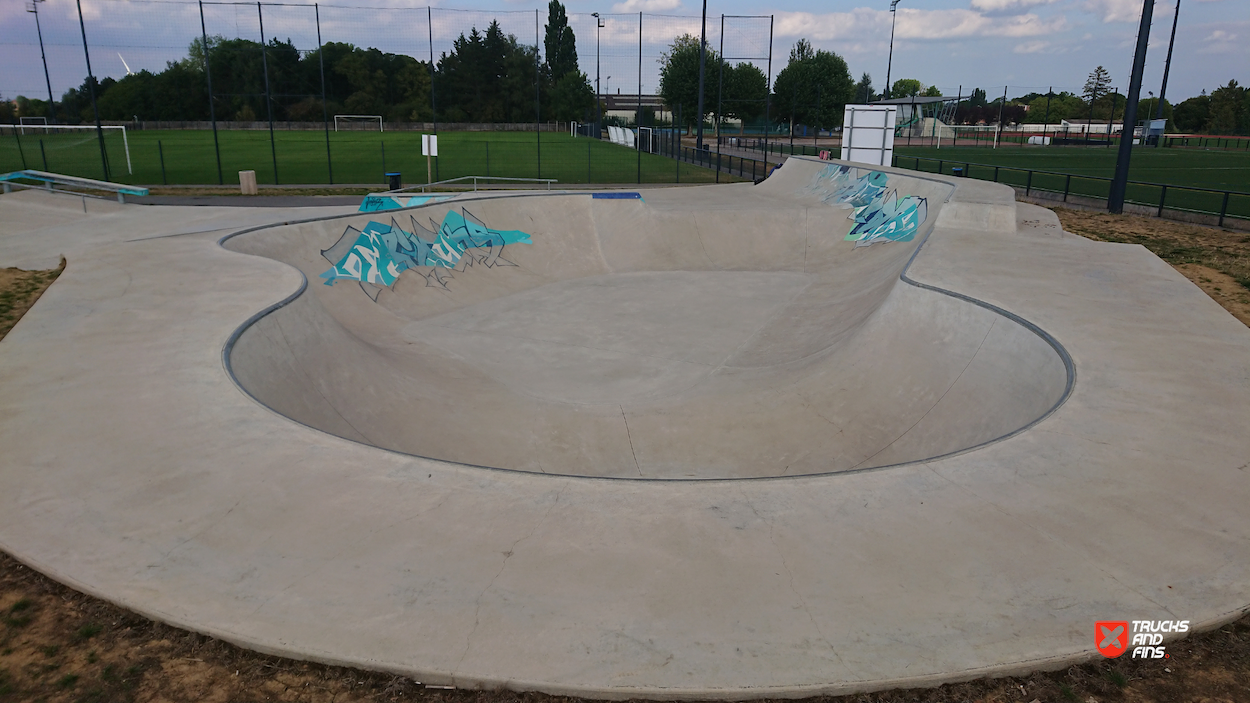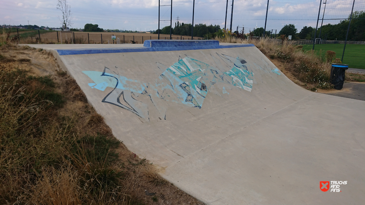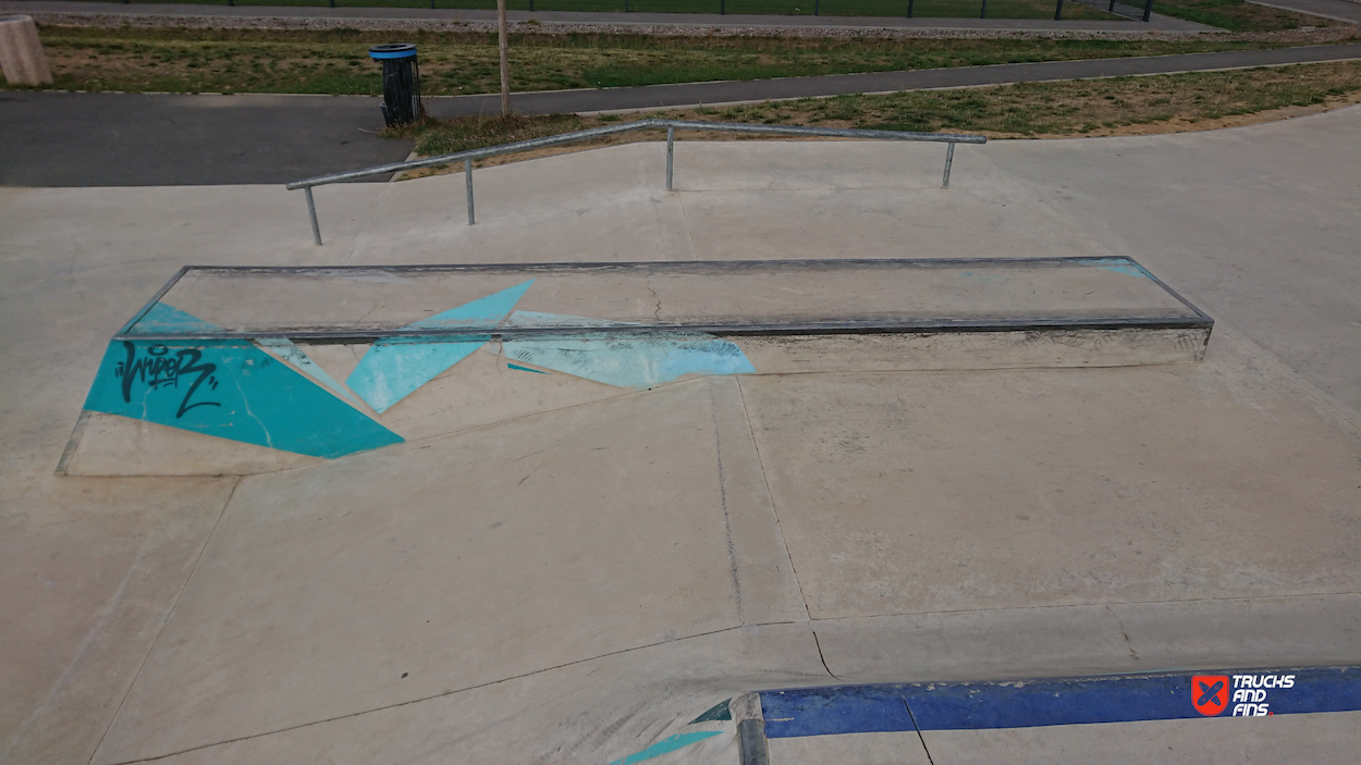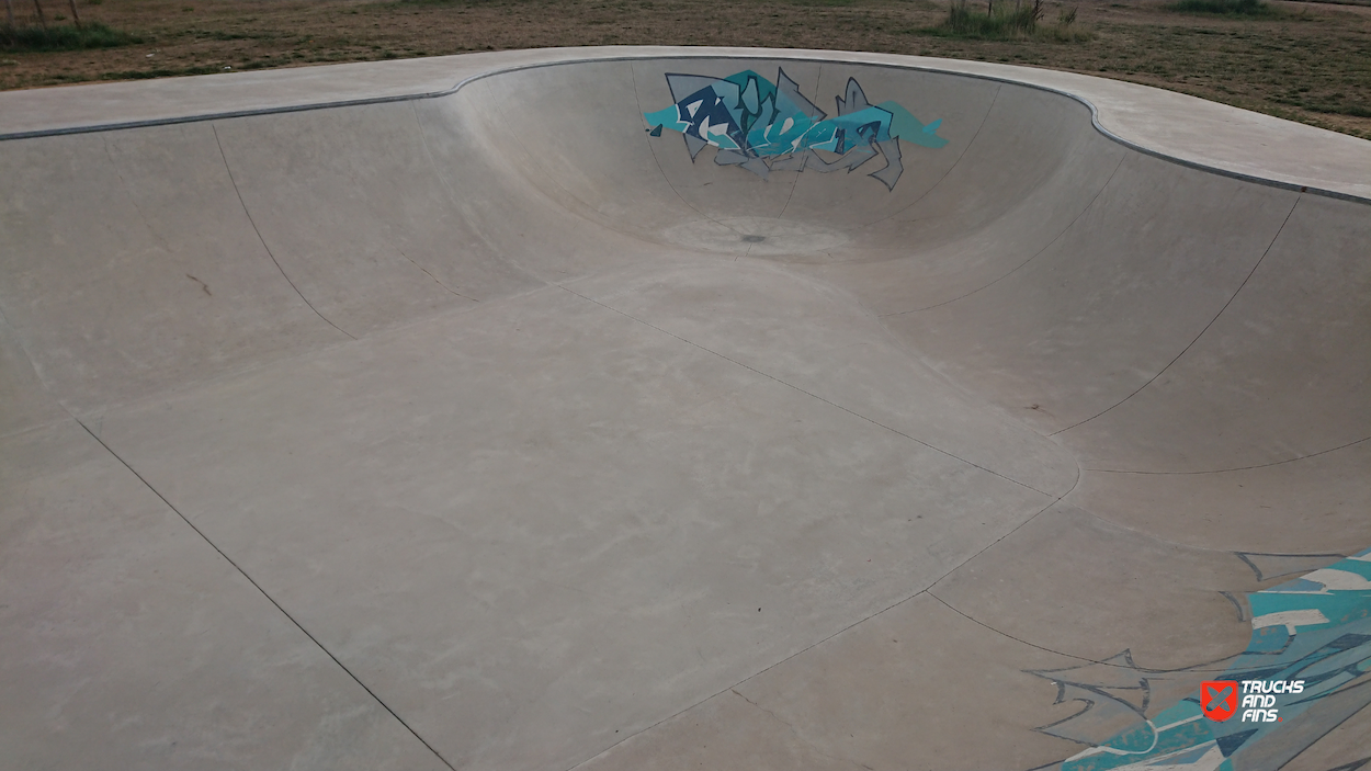 Fun little skatepark, with a big flat street section with some obstacles, and a fantastic bowl with spine.