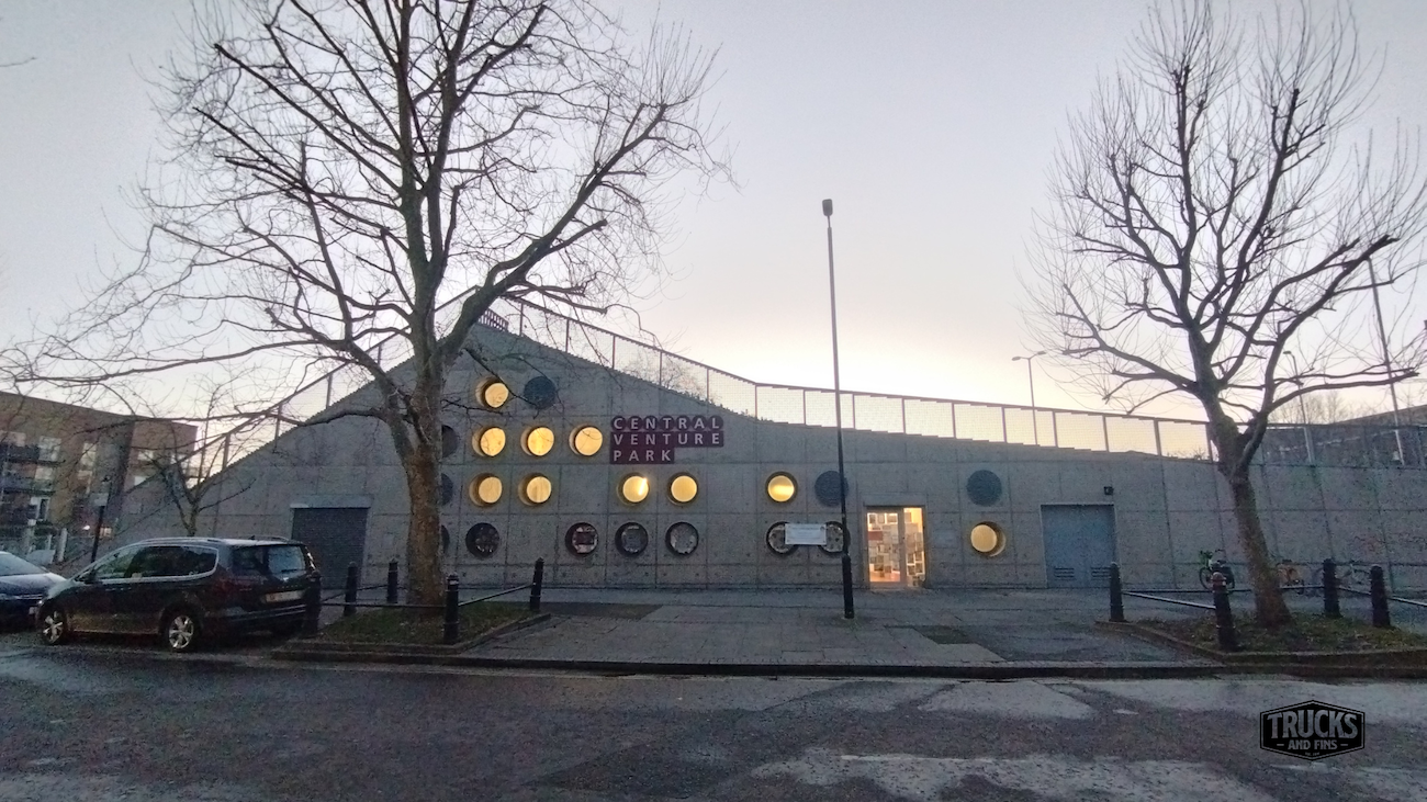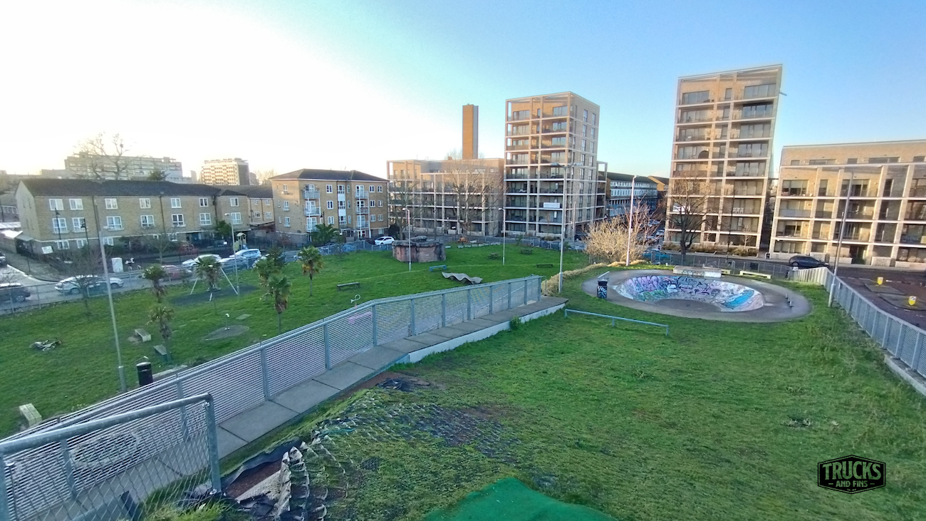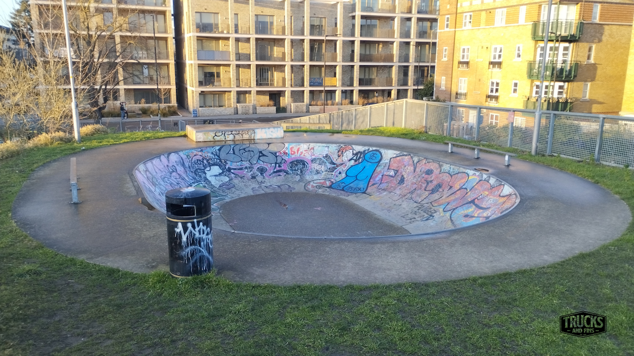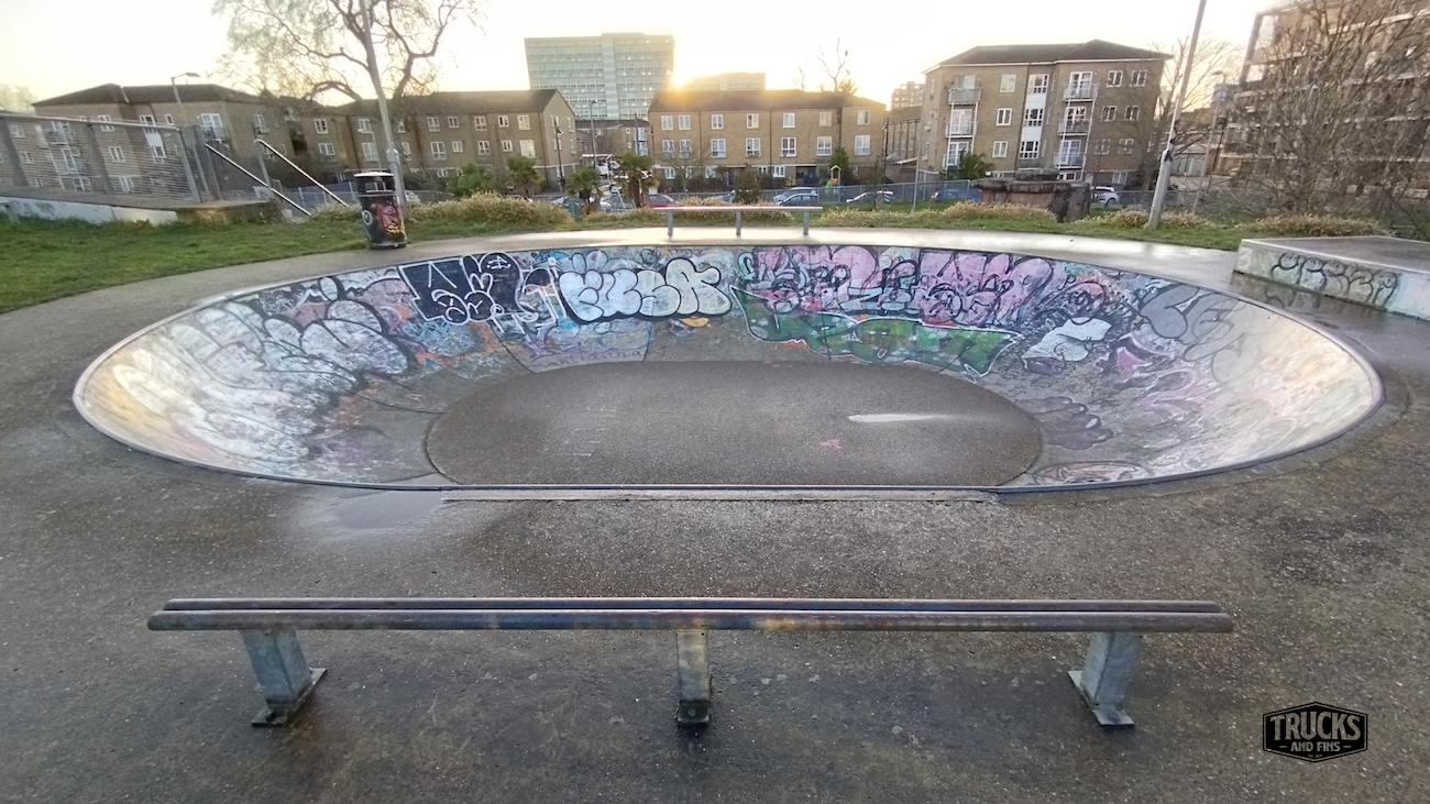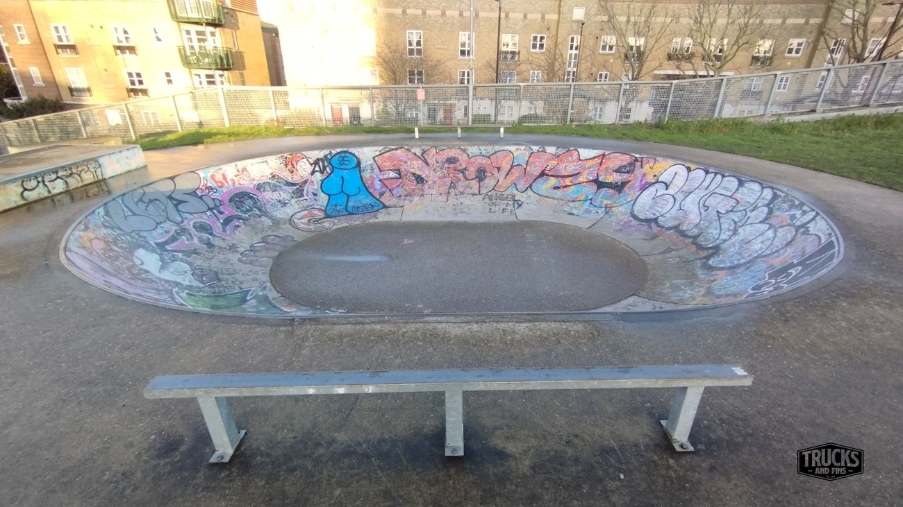 Central Venture Park Skatepark, located in the heart of Peckham, London, is a concrete bowl designed for skateboarding enthusiasts. The bowl features a rounded rectangular shape with ledges and rails along its sides, catering to various skill levels.