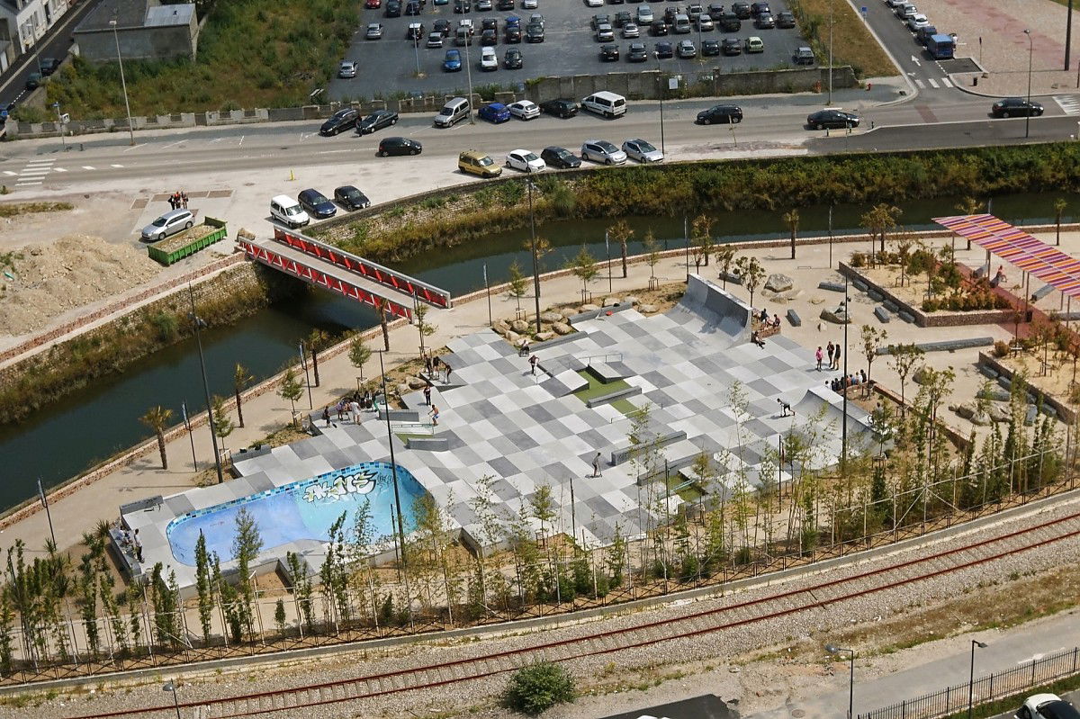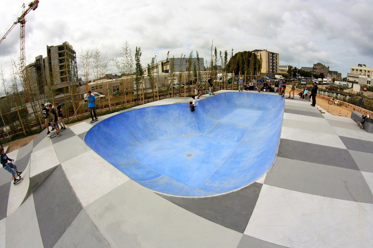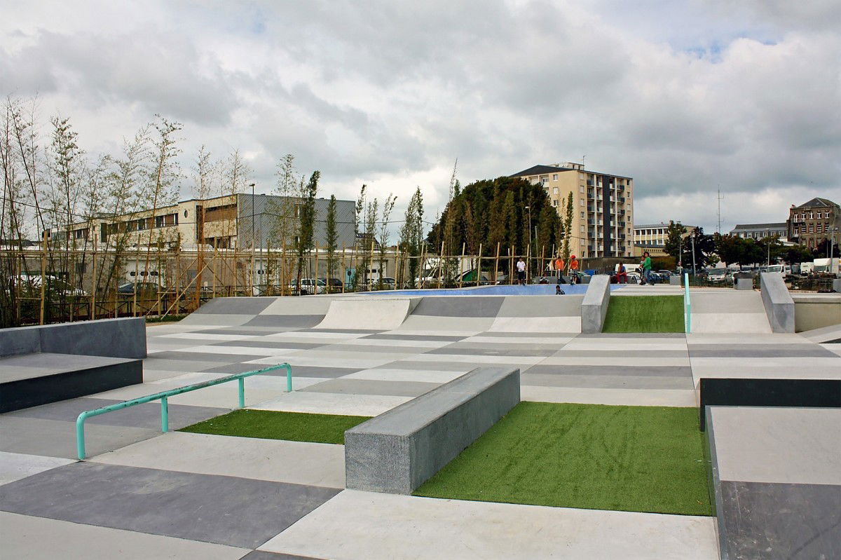 The 945 m² Cherbourg skatepark was designed and built by Constructo Skateparks in 2014 who teamed up with Serge Renaudie for the landscape architecture. Total estimated cost: 330000€.