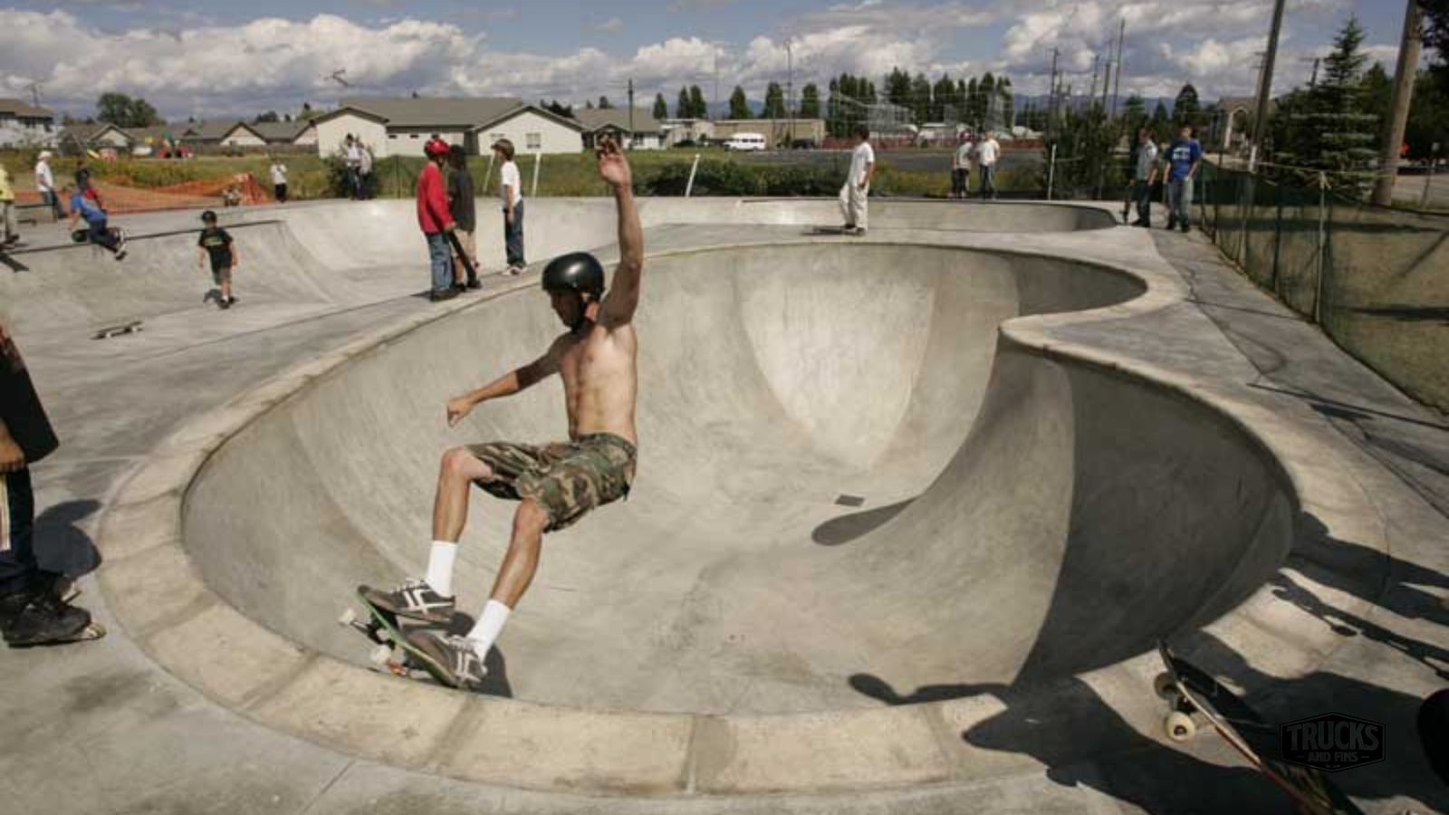 Concrete Lake Skatepark, aka Sandpoint skatepark, is a concrete transition focused park made up of a bowl with stone coping, open bowl and several street elements. The skatepark was built by Dreamland skateparks.