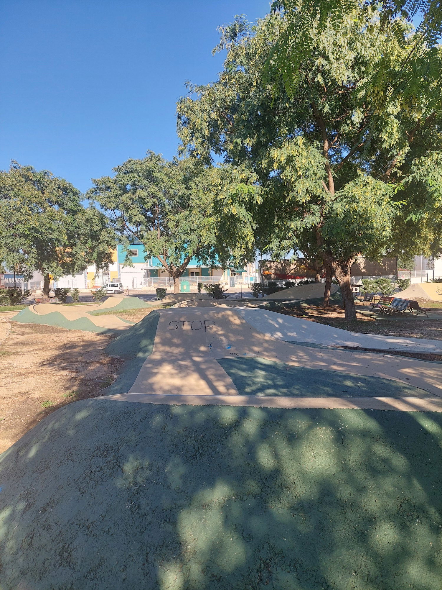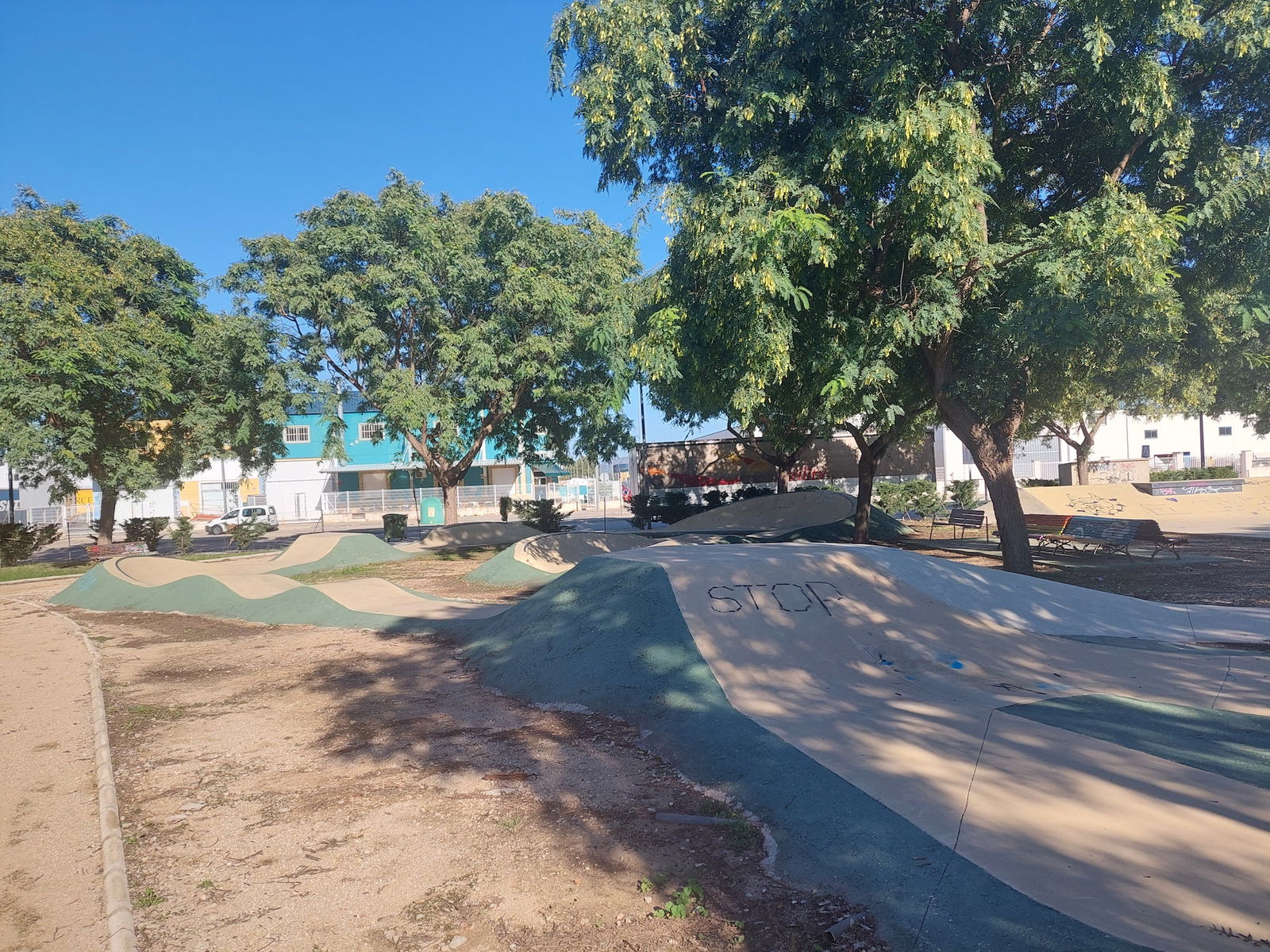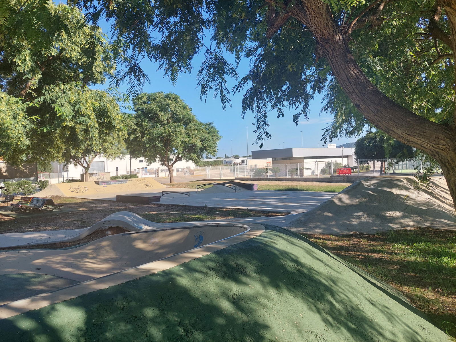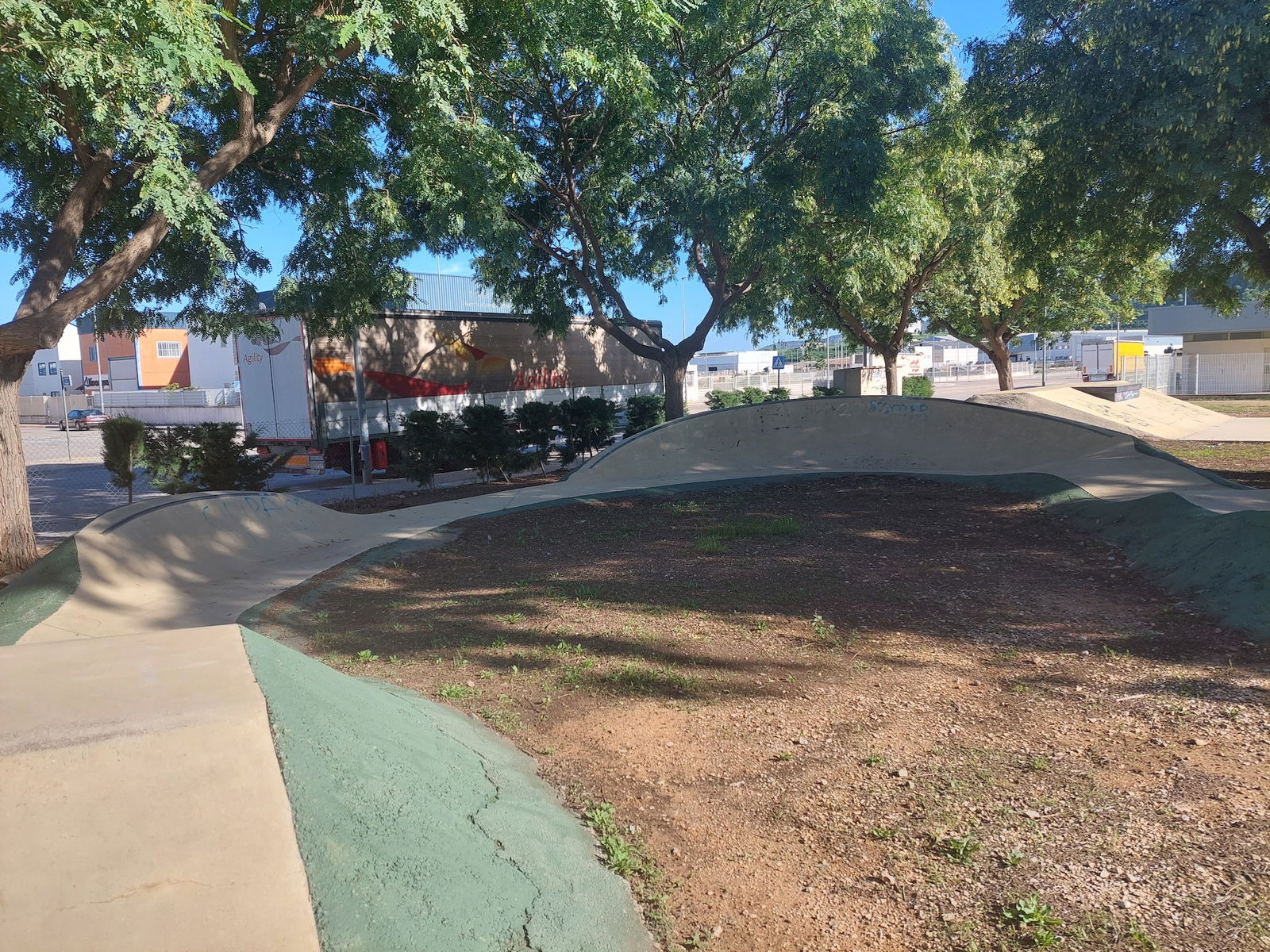 Corbera skatepark features a small concrete street skatepark connected to a pumptrack. The park was built by IOSkateparks.