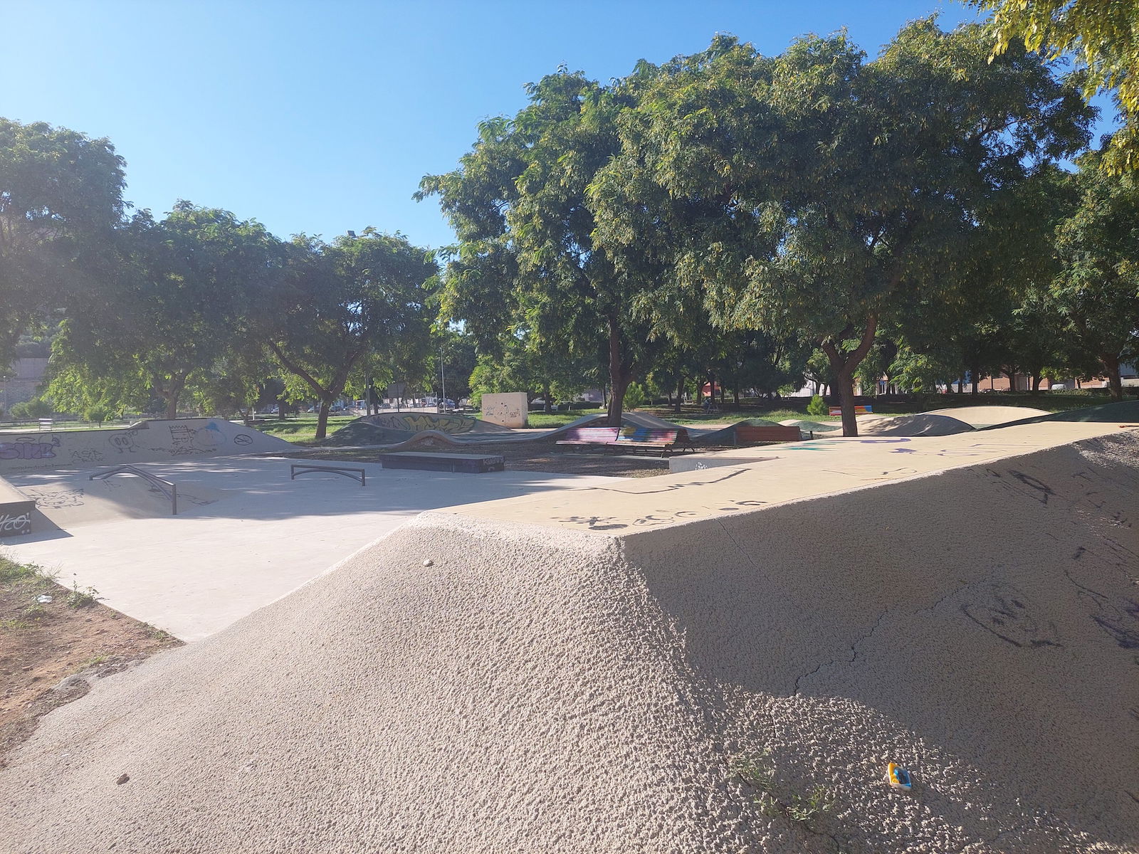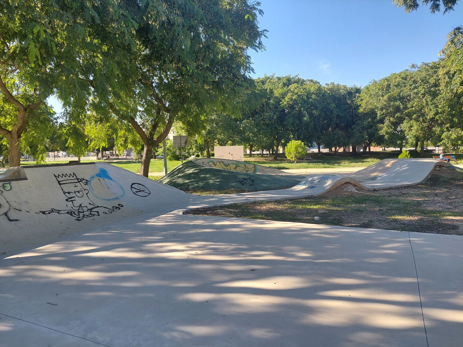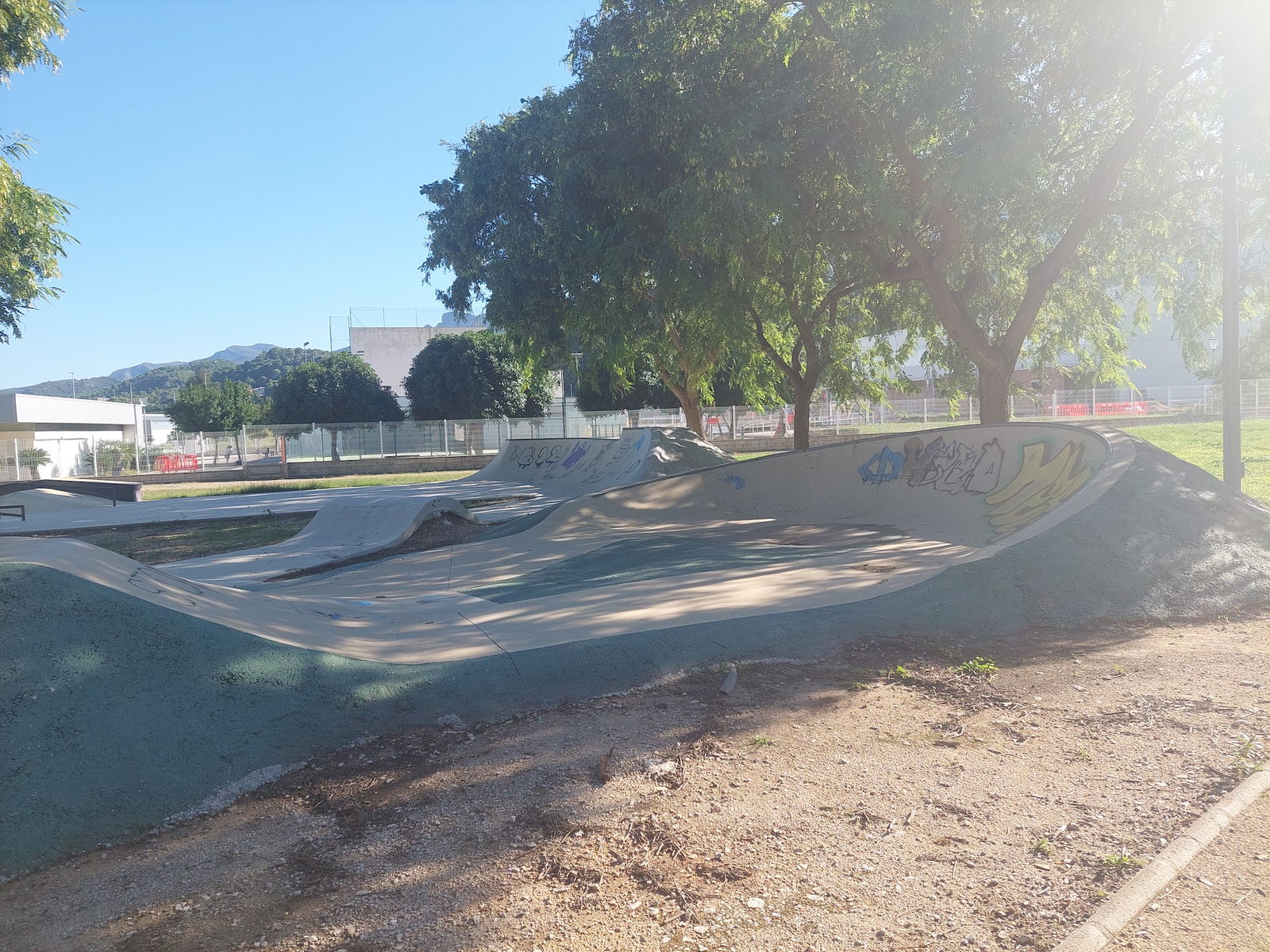 Corbera skatepark features a small concrete street skatepark connected to a pumptrack. The park was built by IOSkateparks.