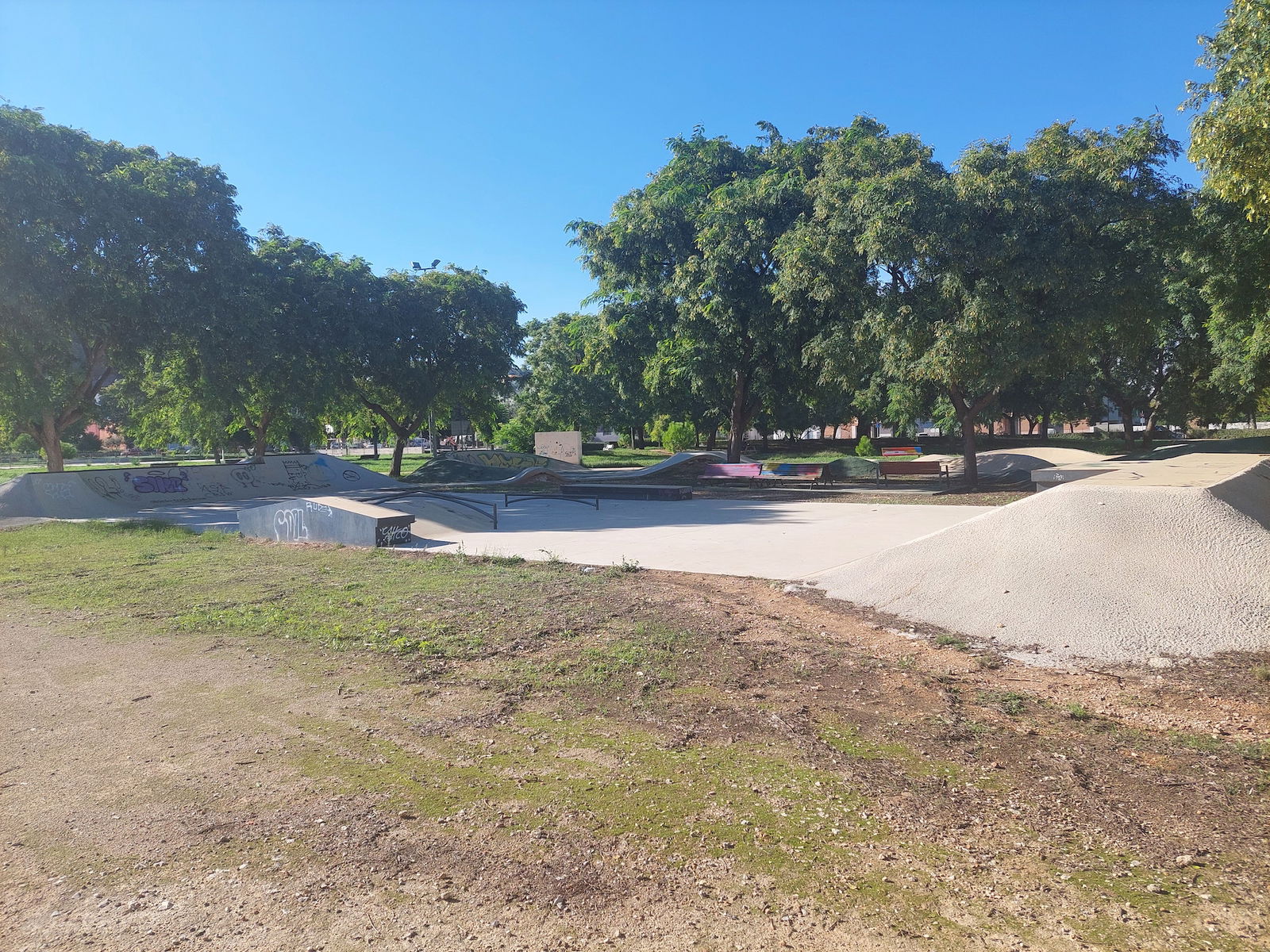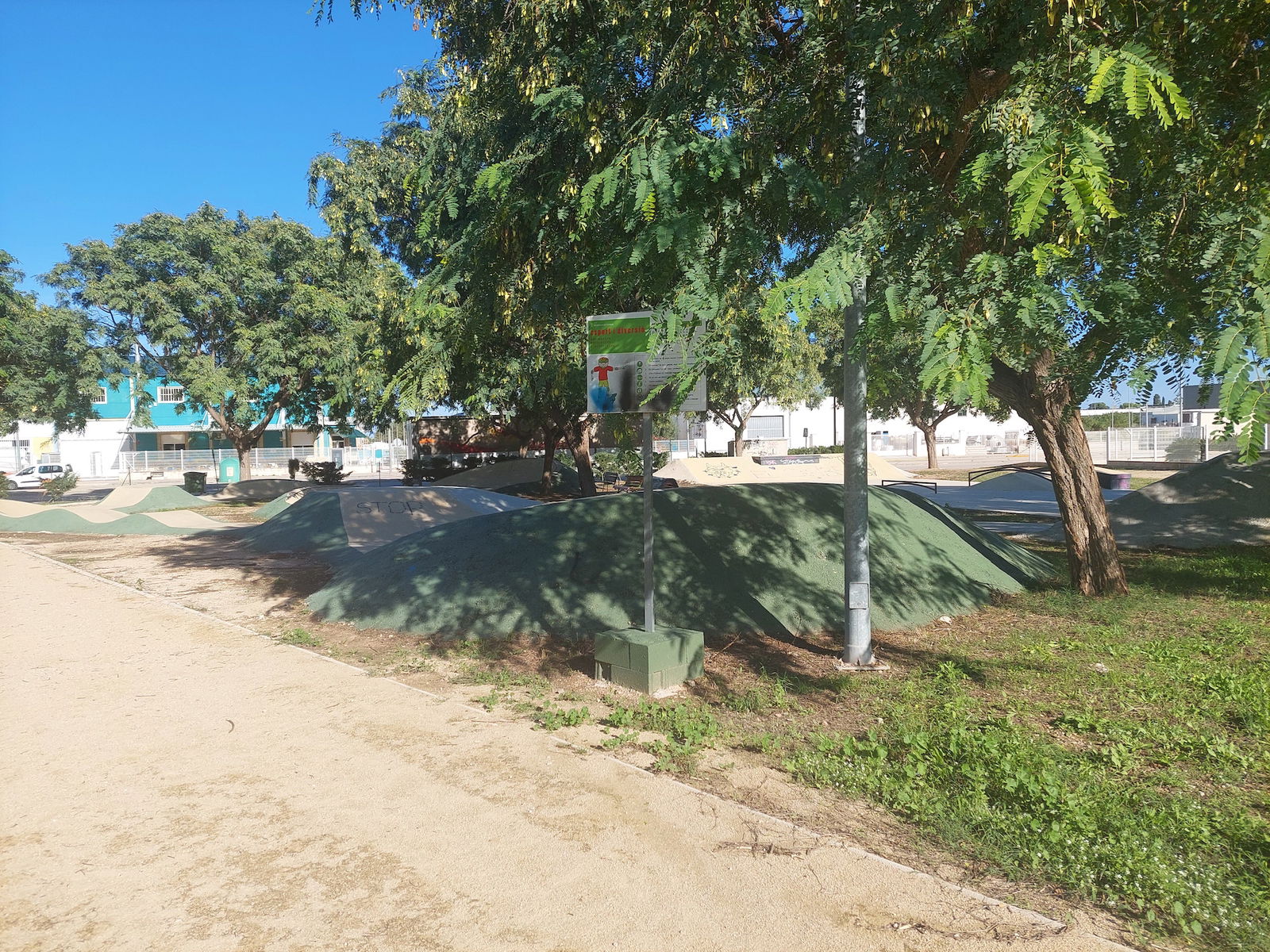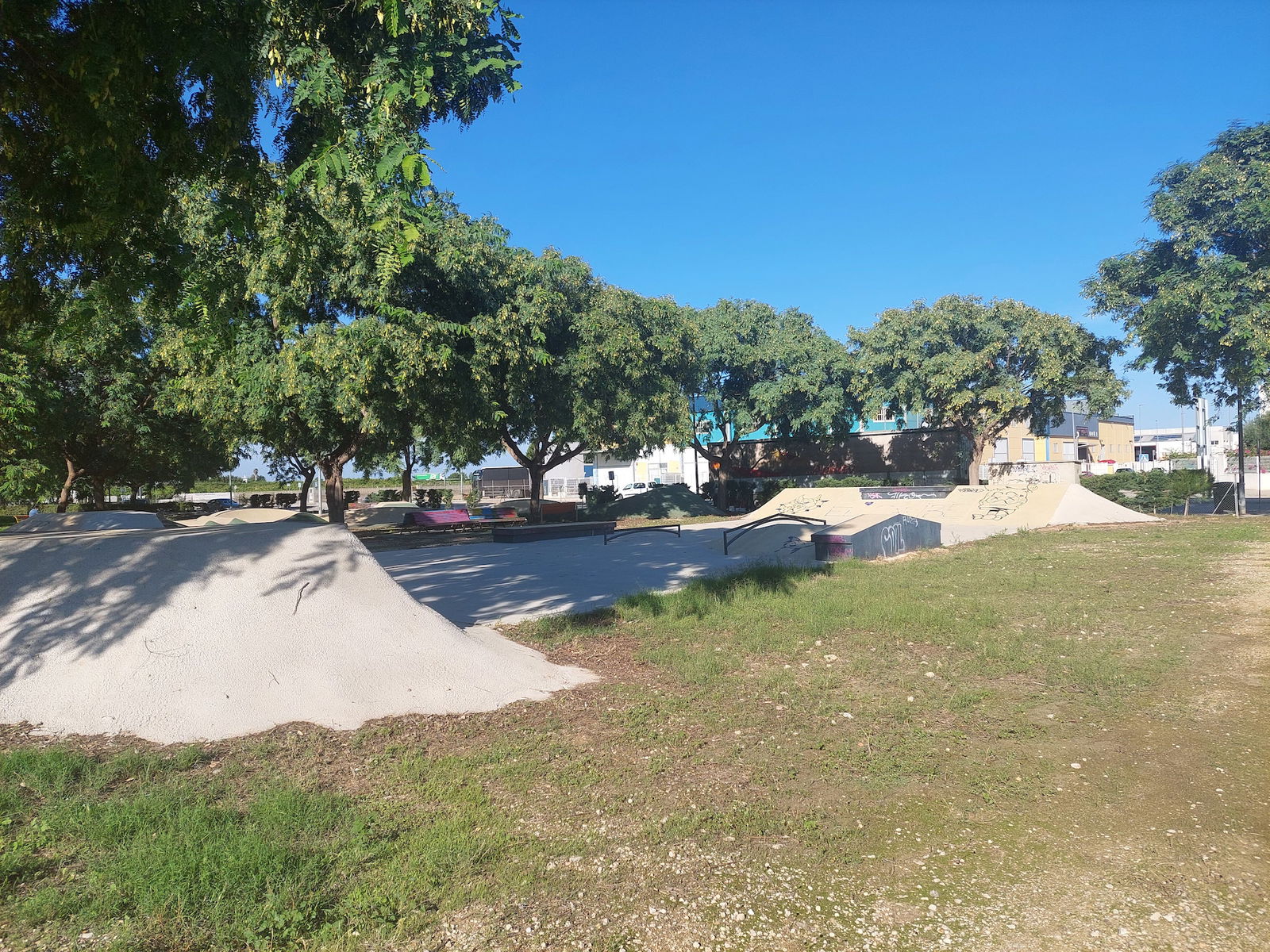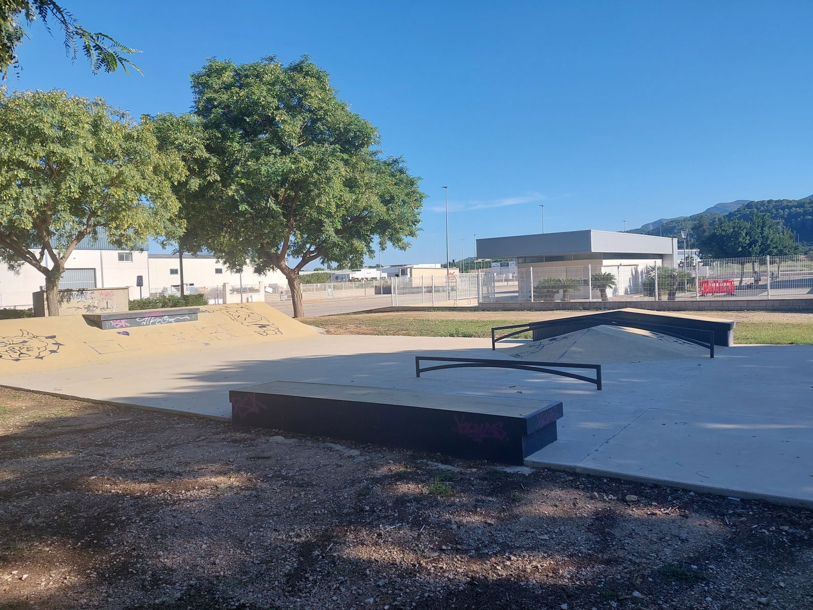 Corbera skatepark features a small concrete street skatepark connected to a pumptrack. The park was built by IOSkateparks.