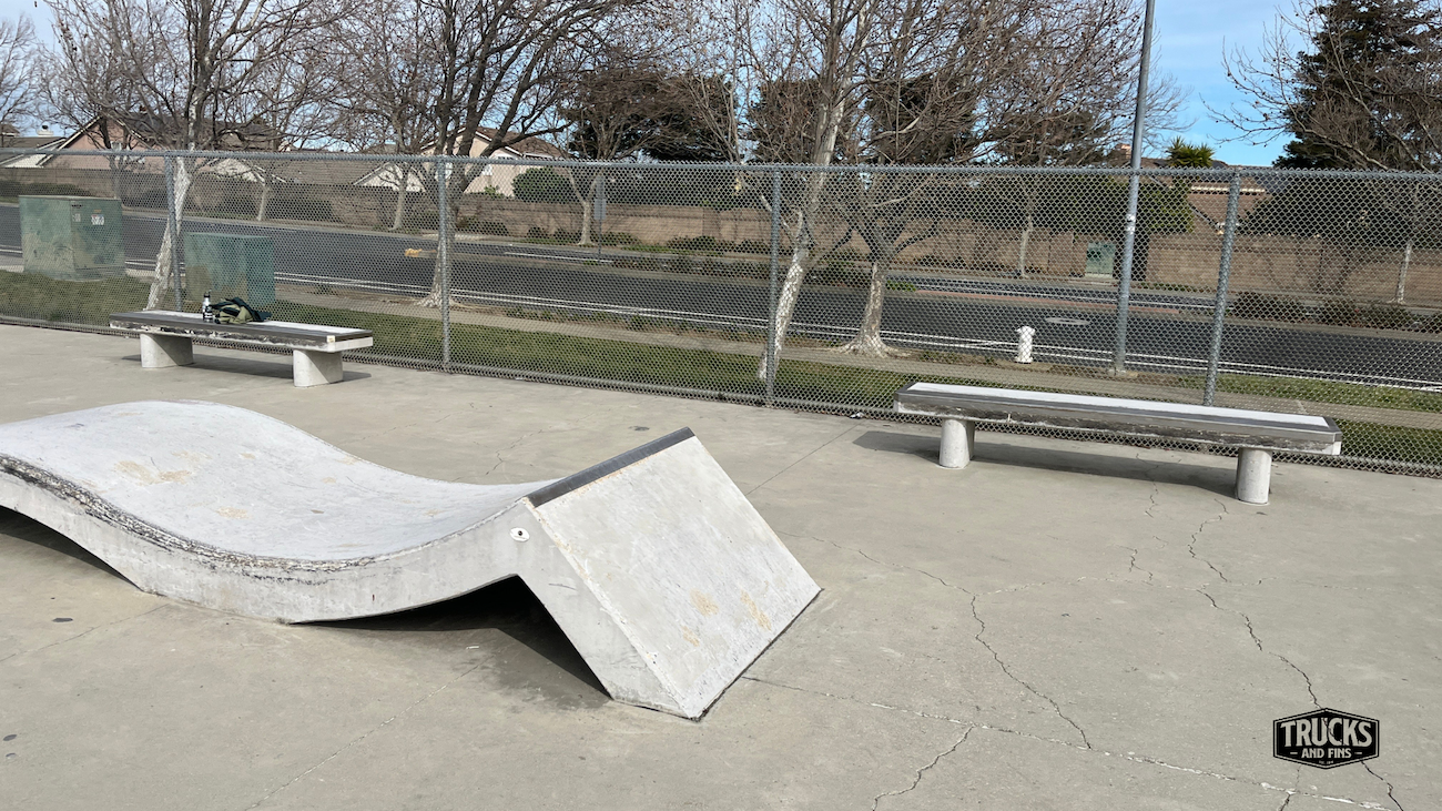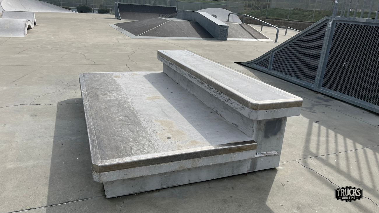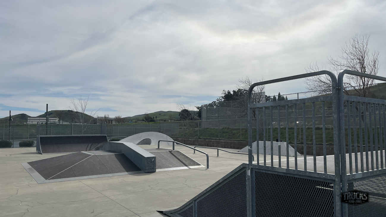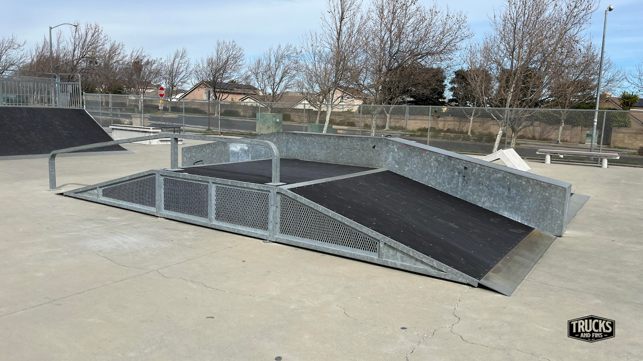 Cordelia skatepark is made up of a back and forth run with a quarter pipe and flat bank on the sides of a funbox. The skatepark also features a miniramp.