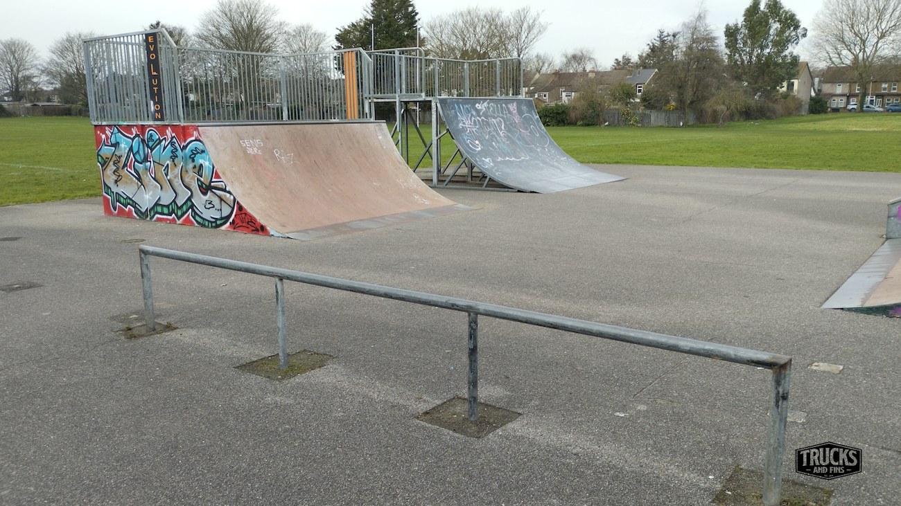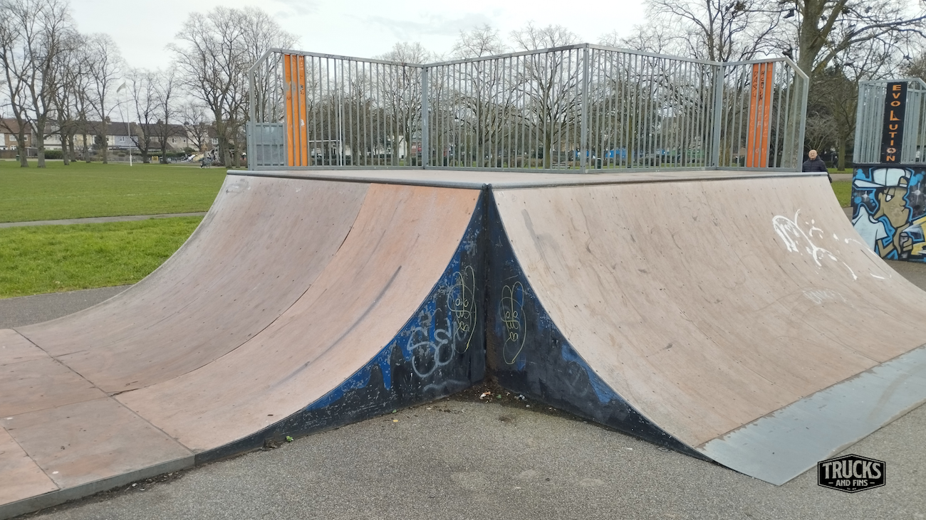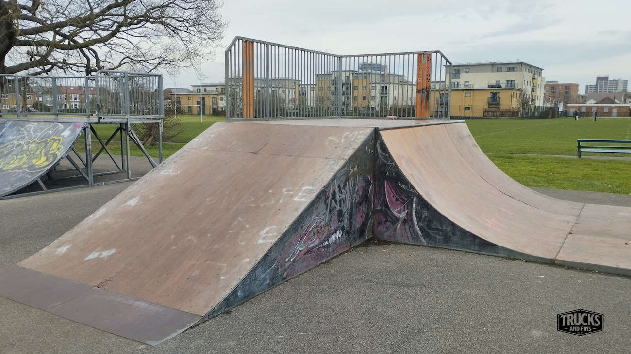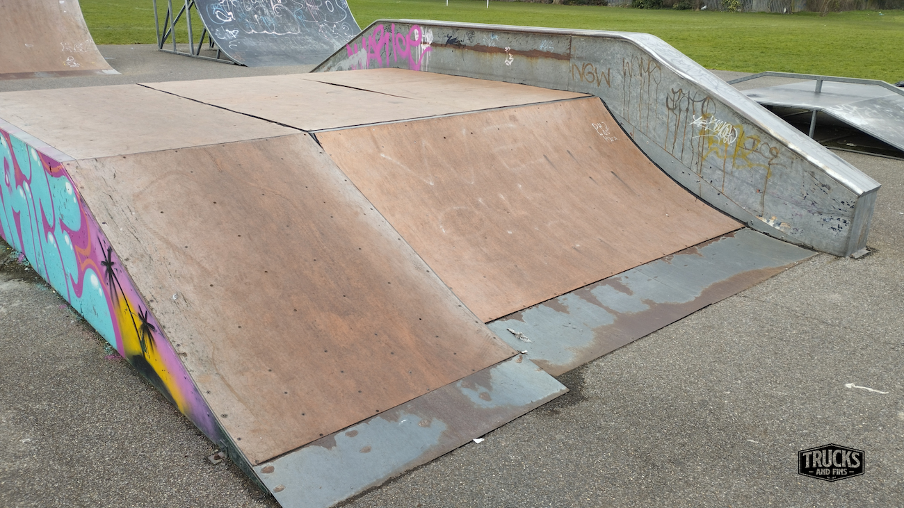 Cottons park skatepark is made up of several back and forth runs with quarter pipes and banks on the sides of a funbox, jumpbox and spine. The skatepark also features a miniramp.
