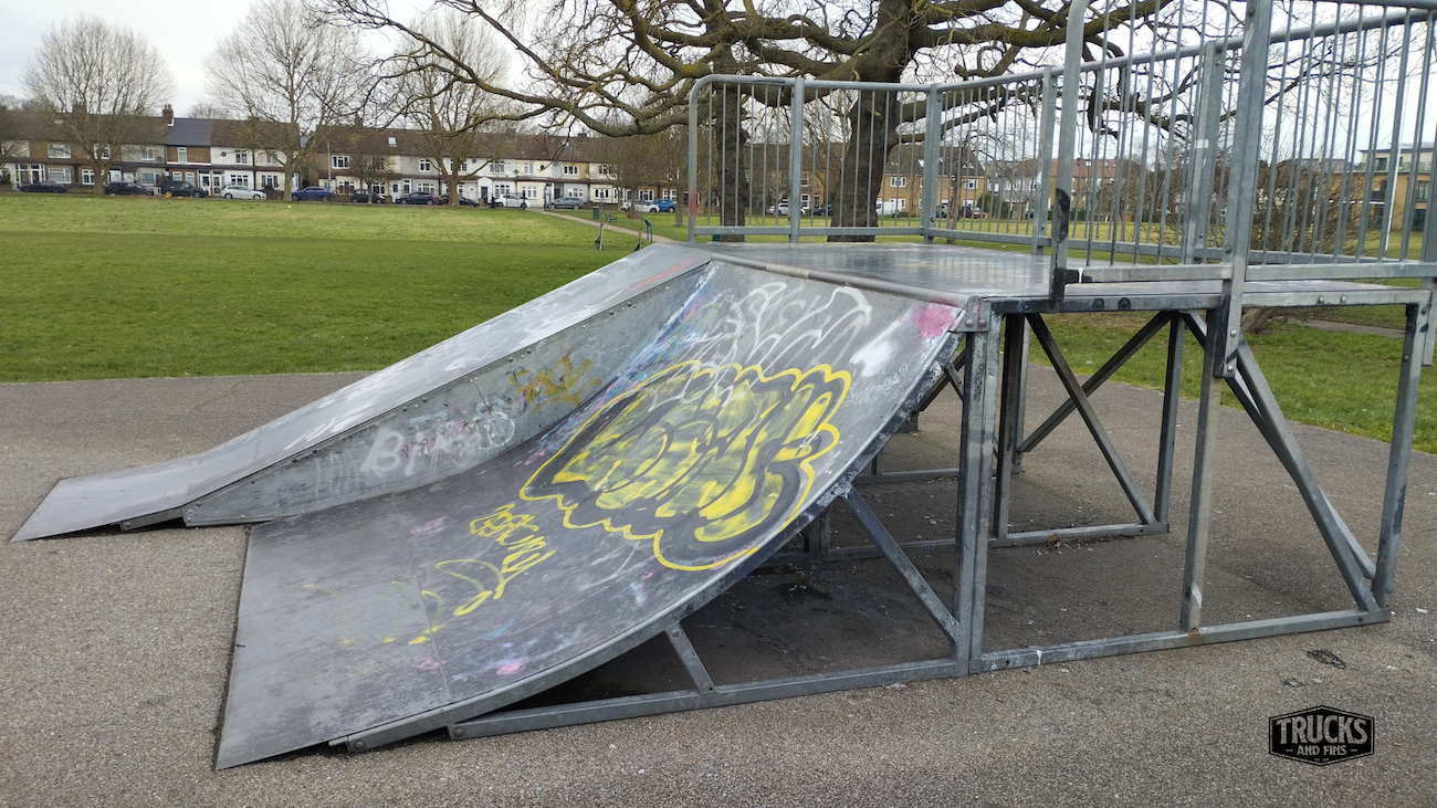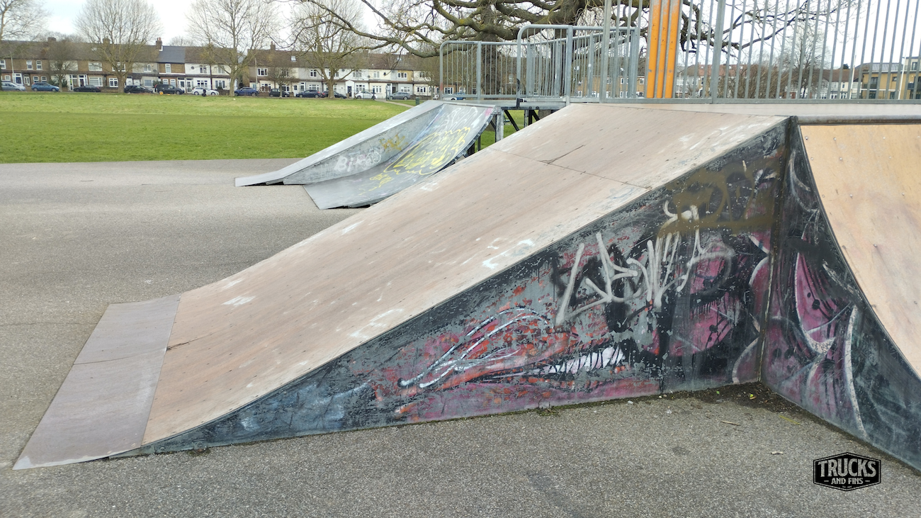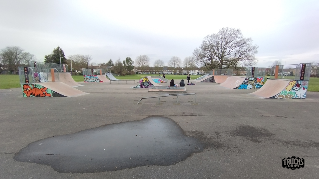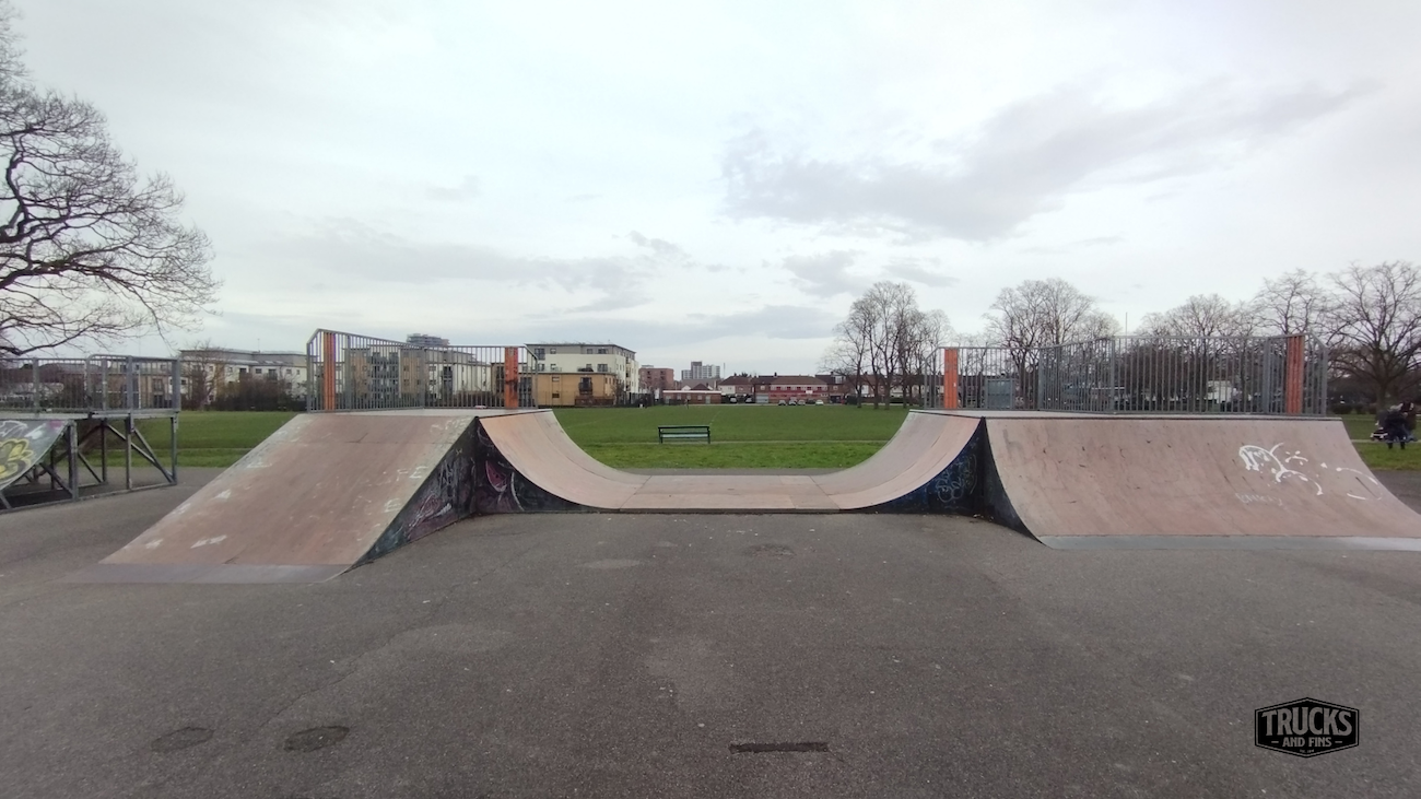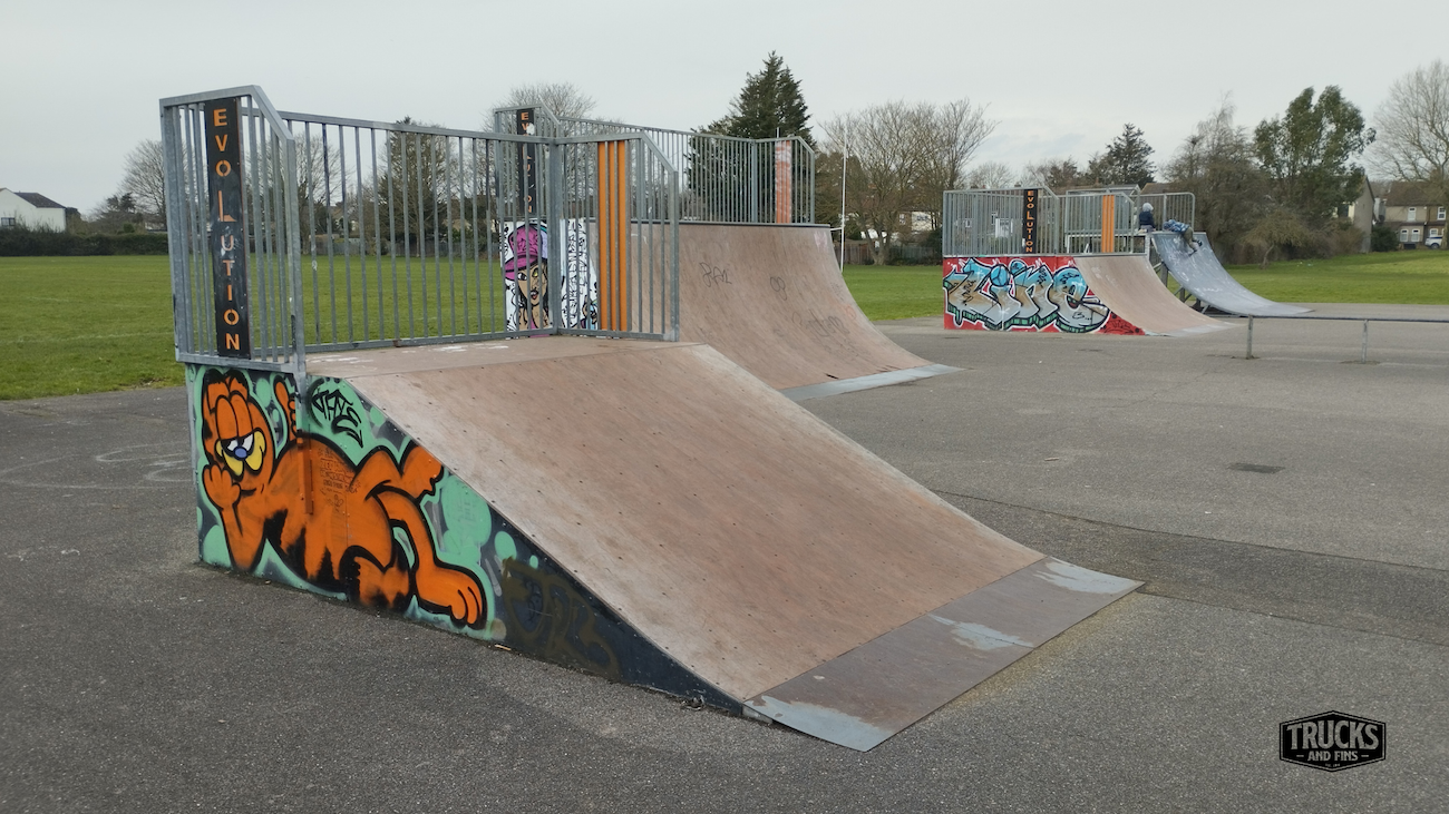 Cottons park skatepark is made up of several back and forth runs with quarter pipes and banks on the sides of a funbox, jumpbox and spine. The skatepark also features a miniramp.