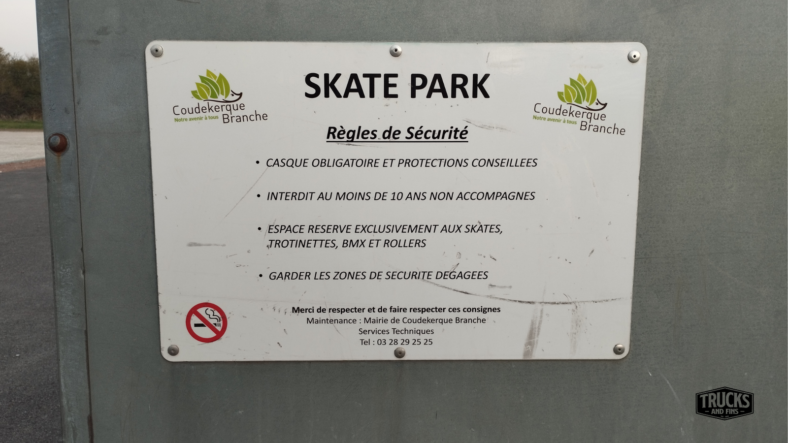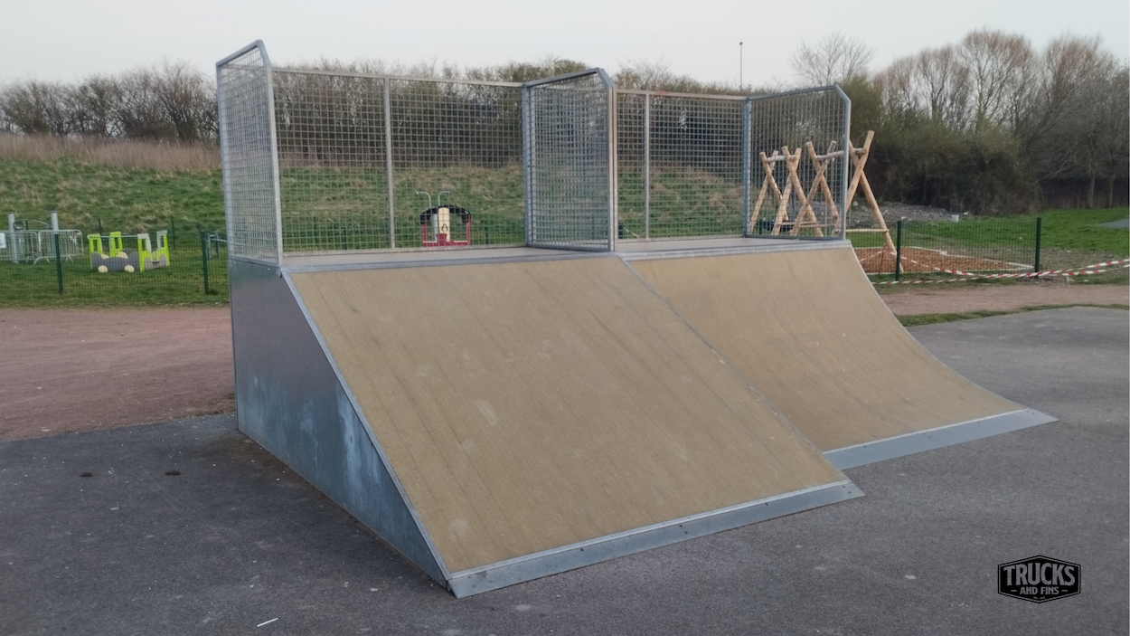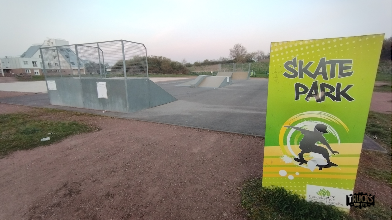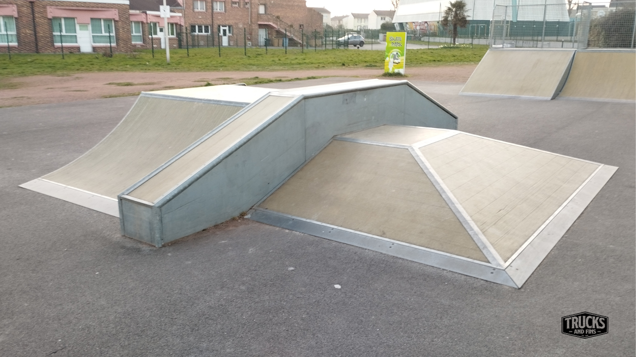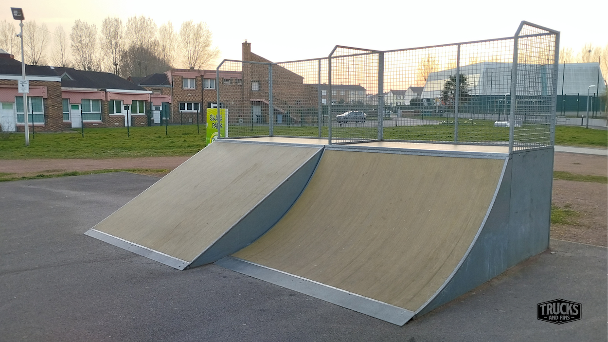 Coudekerque-Branche skatepark is made up of a back and forth run with a quarter pipe and bank on the sides of a funbox.