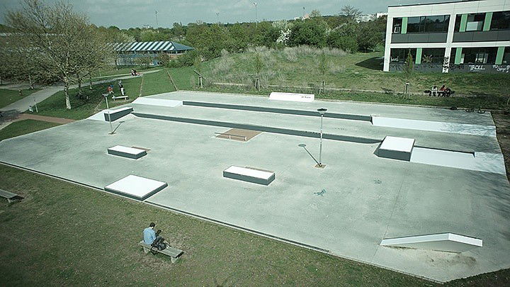 The plaza is not fenced or isolated but integrated into the Bürgerpark, providing an open and welcoming atmosphere. This makes it accessible not only to skaters but also to the general public, promoting a sense of community engagement. The design is minimalistic yet highly practical, with elements that cater to street skating but without altering the landscape significantly, keeping with the aesthetic of the surrounding urban environment.
