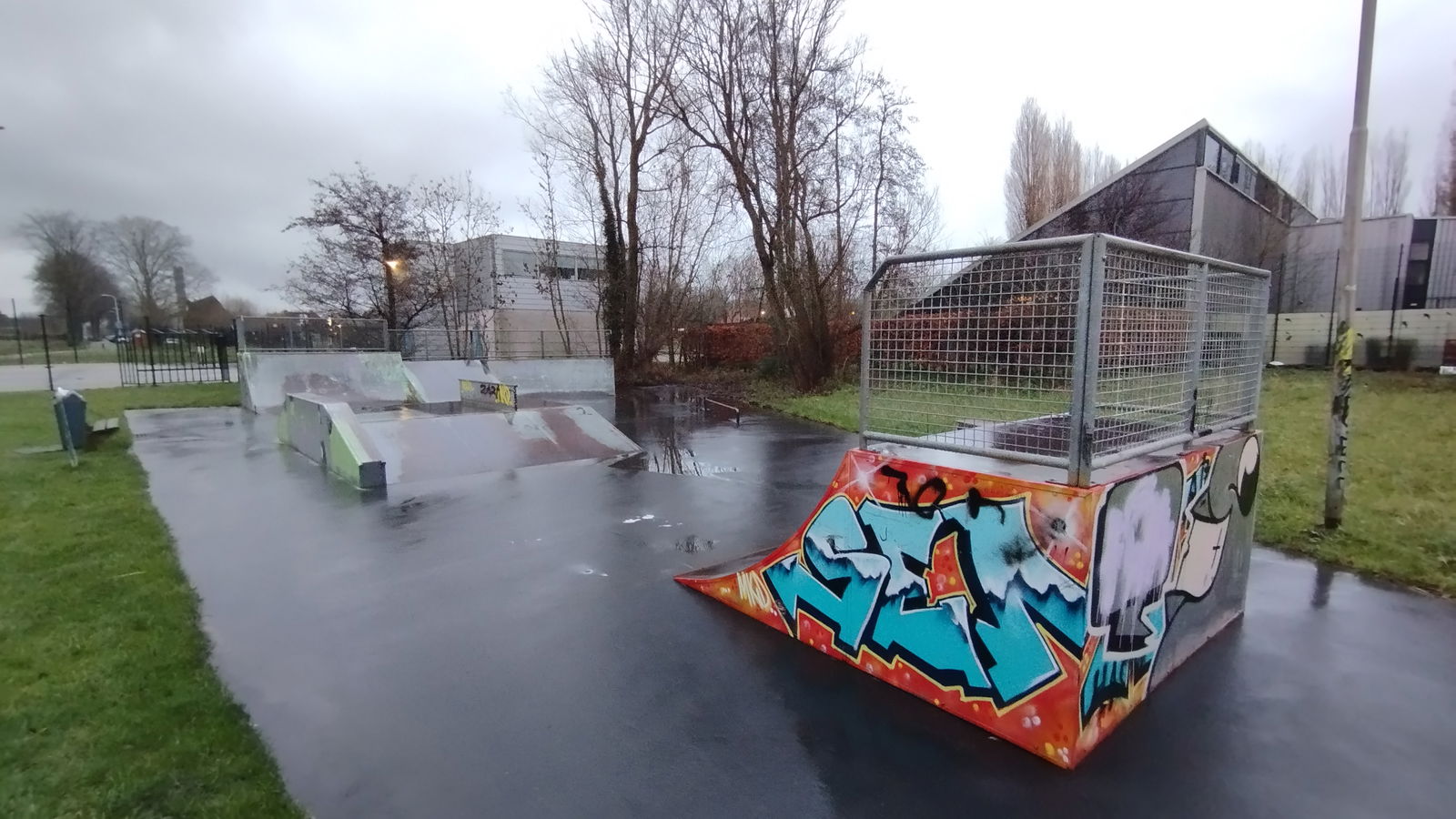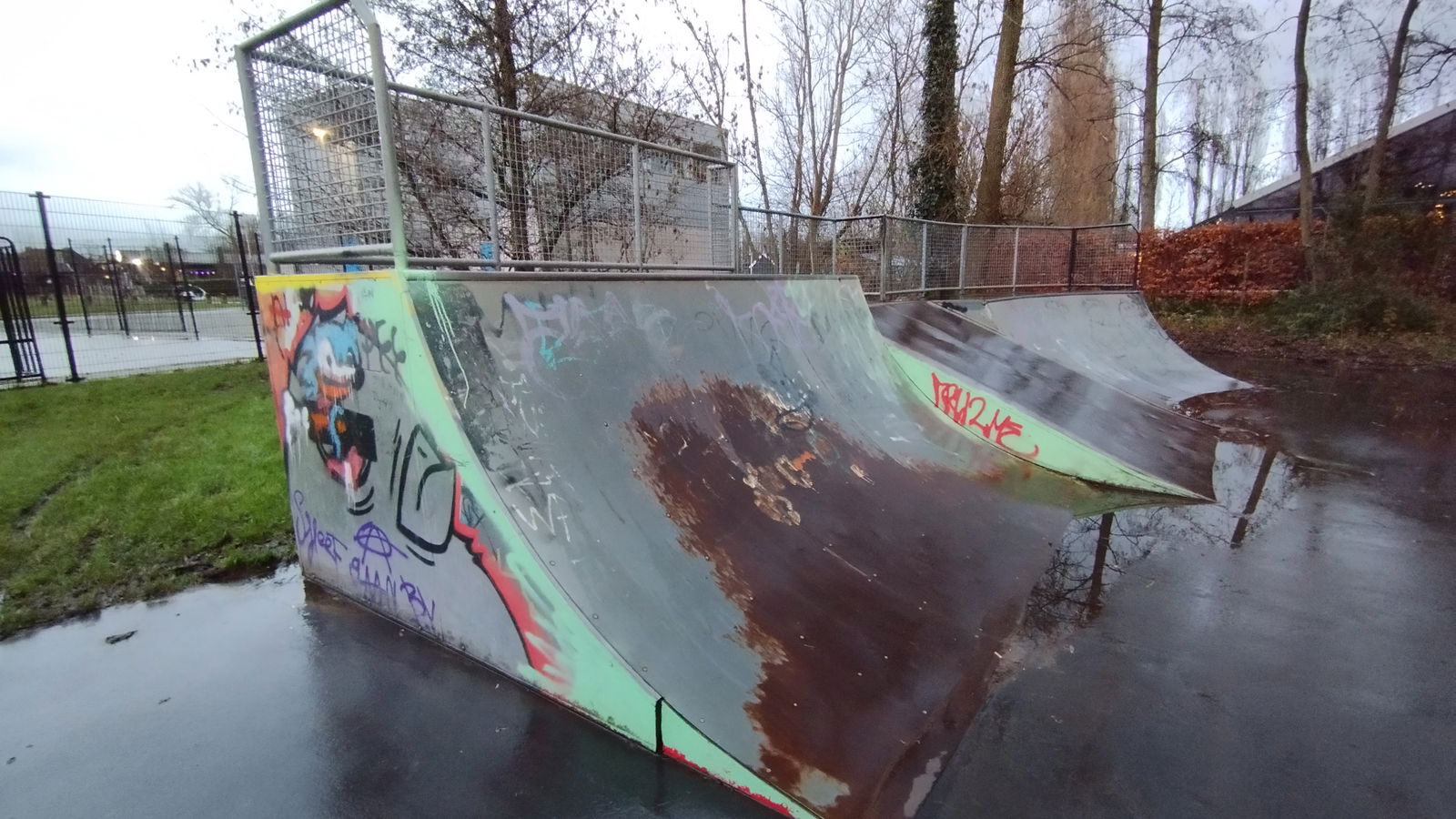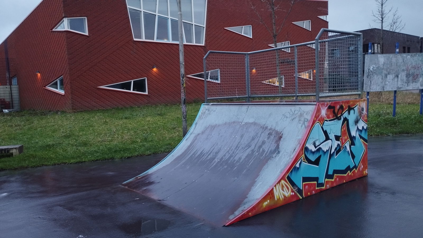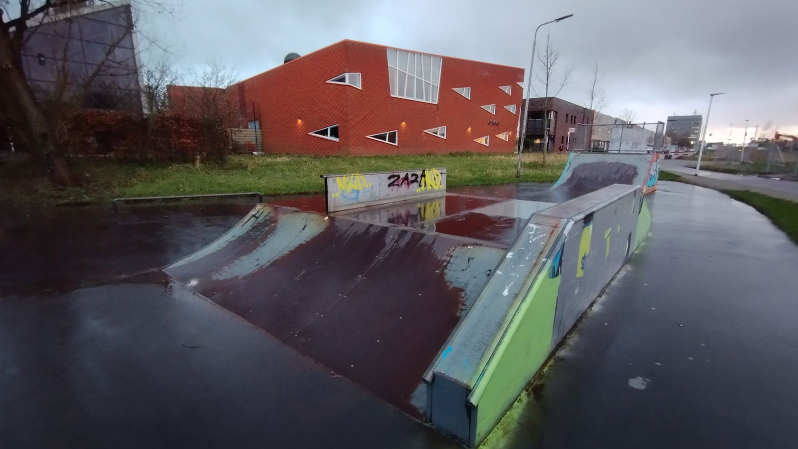 De Border skatepark is made up of a back and forth run with a quarter pipe and flat bank on the sides of a funbox.