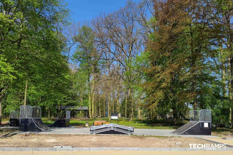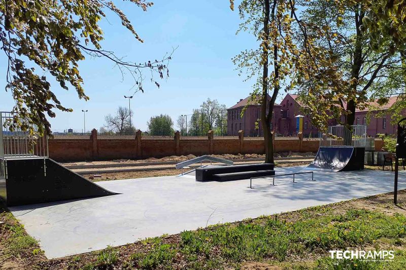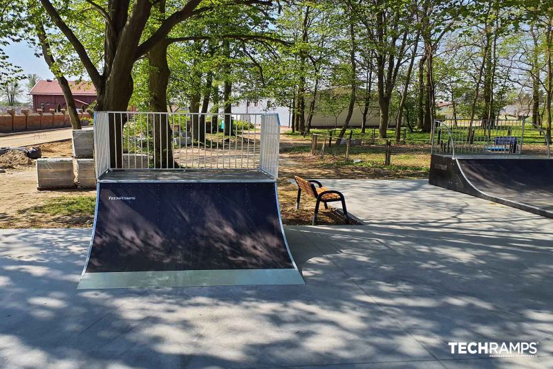 Debrzno skatepark features a miniramp, flatrail and manualpad. The skatepark was built by Techramps.