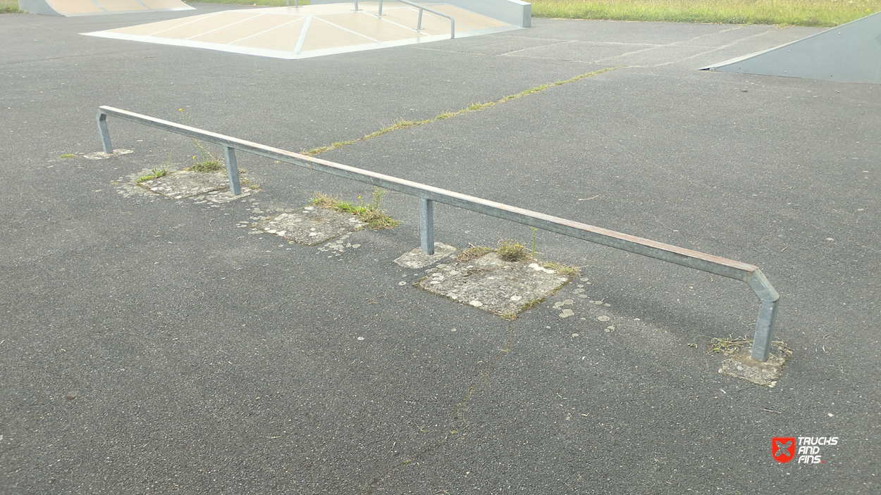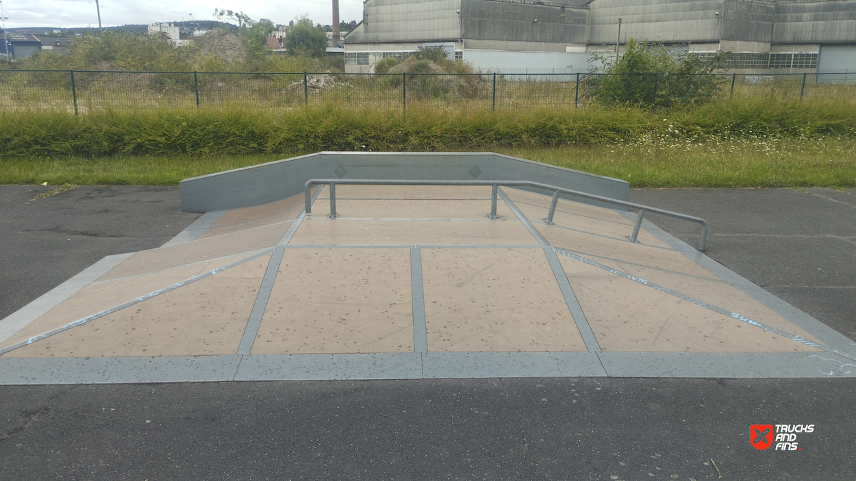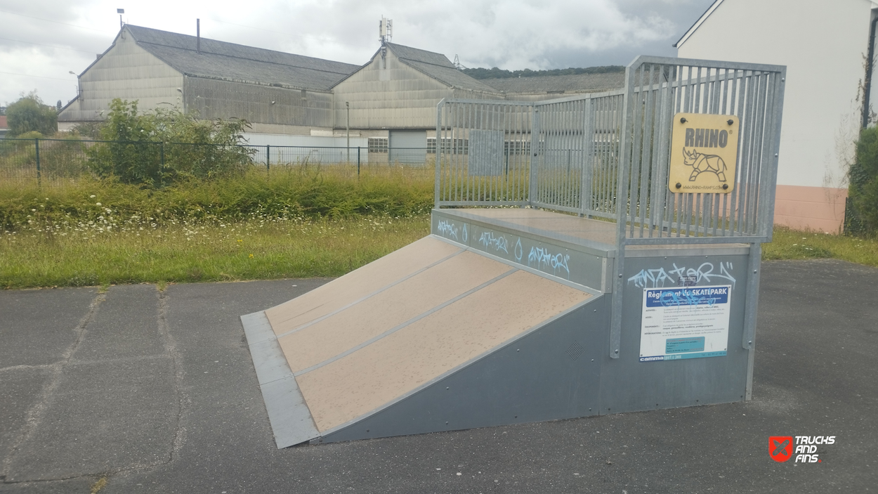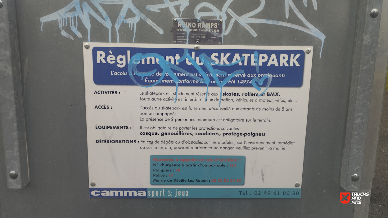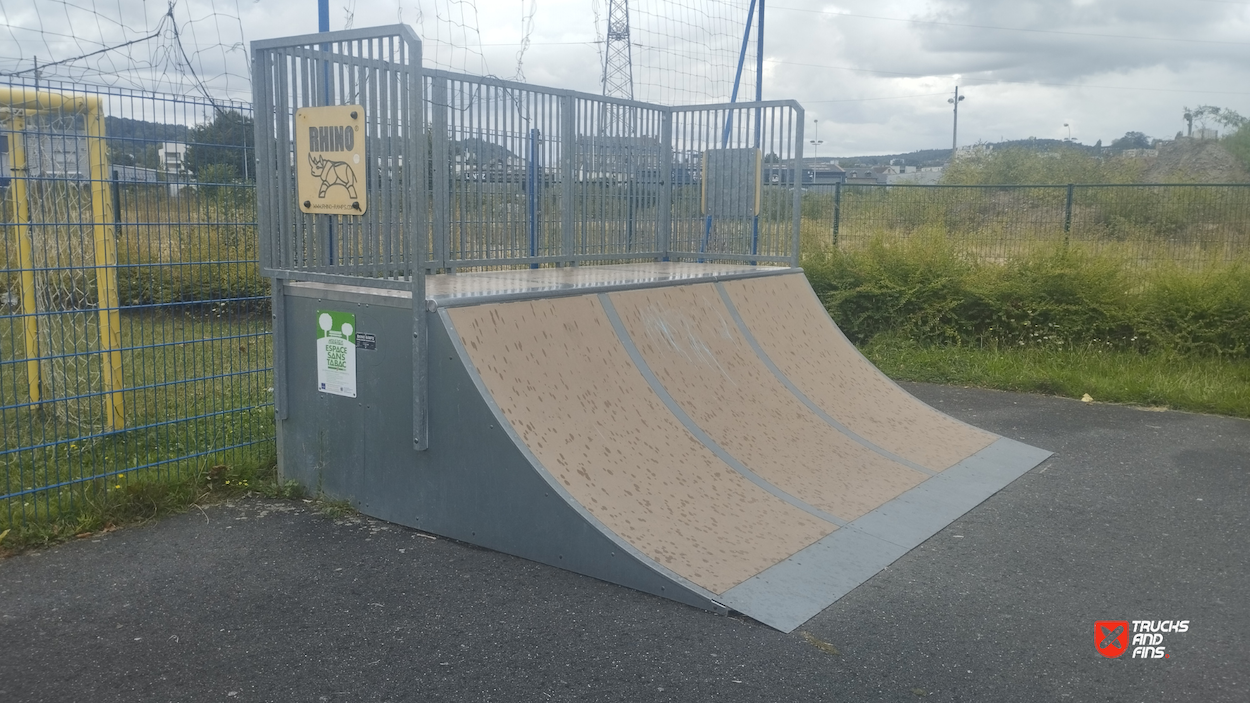 Déville lès Rouen skatepark is made up of a back and forth run with a quarter pipe and flat bank on either side of a funbox. The skatepark was built by Rhino ramps.