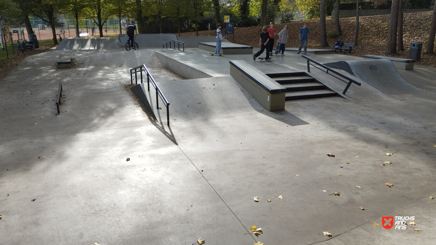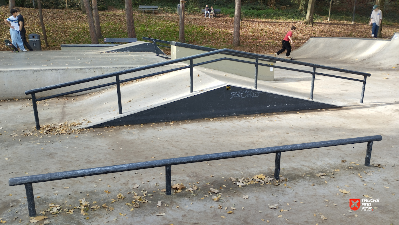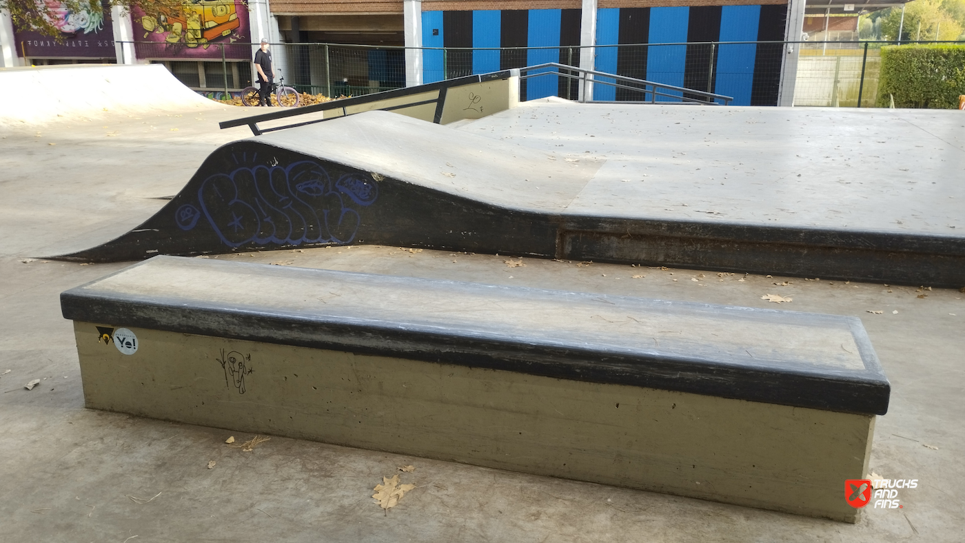 The skatepark features a variety of elements, including a hubba, curb, quarterpipe, funbox, rails, and more, providing opportunities for both street and transition skating. It caters to skaters of all levels, offering both challenging features for experienced skaters and beginner-friendly obstacles.