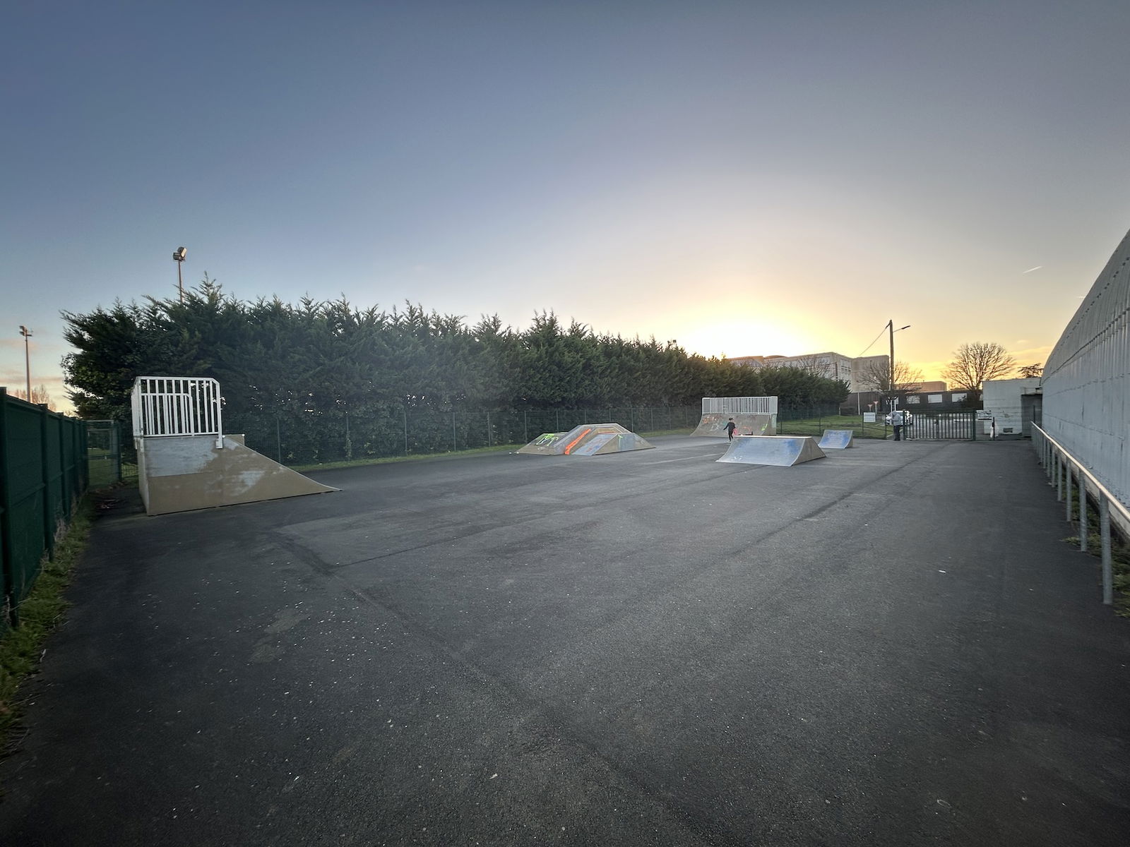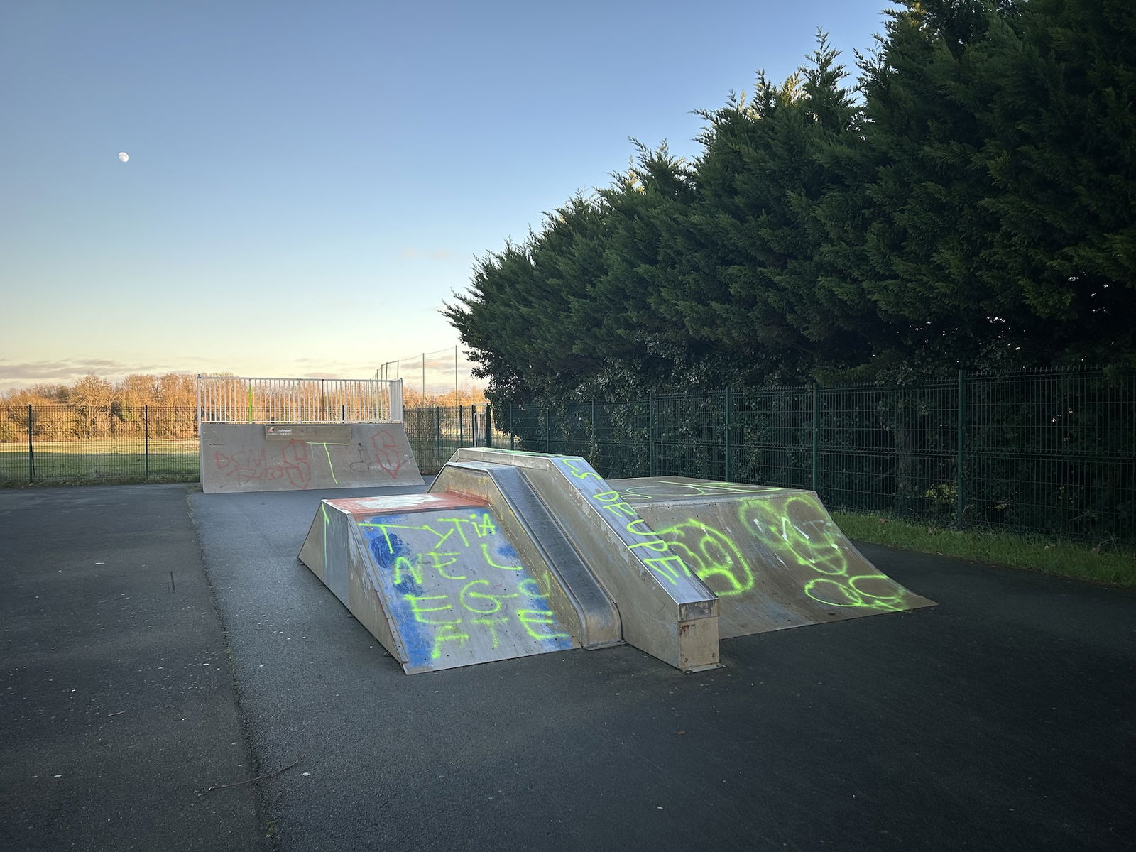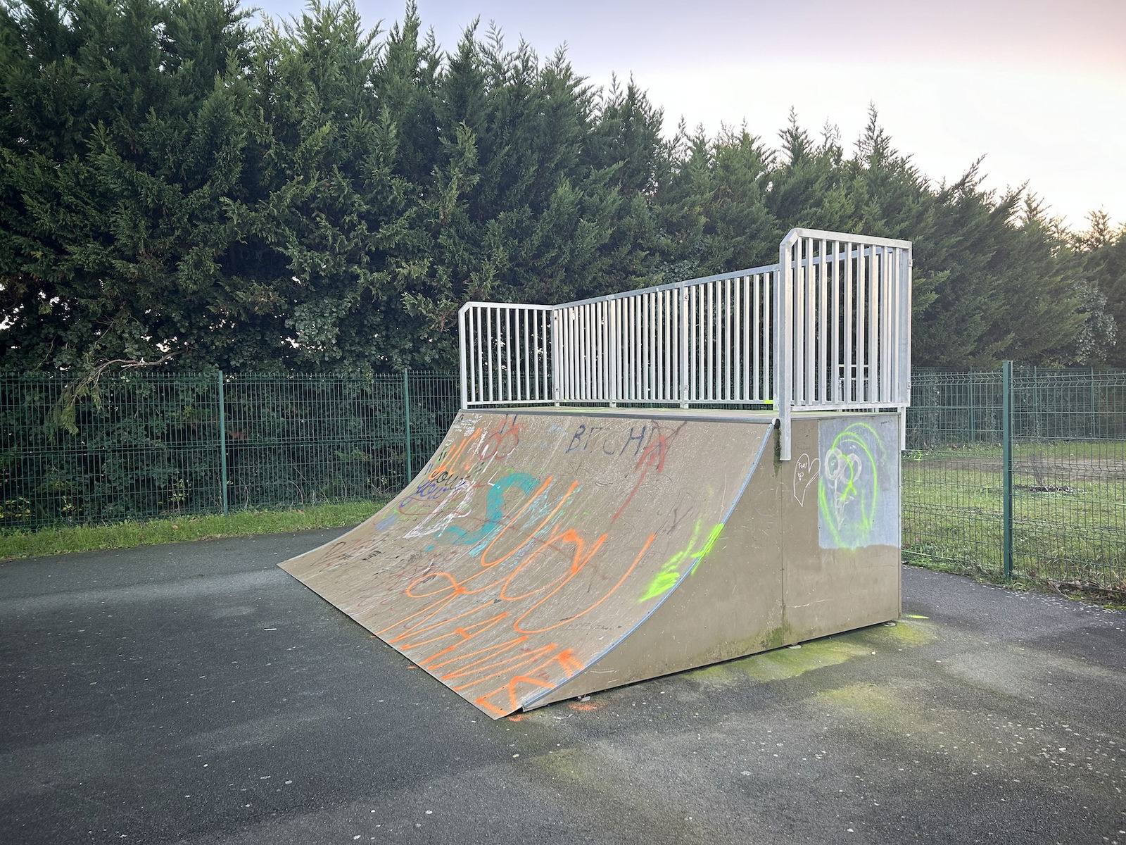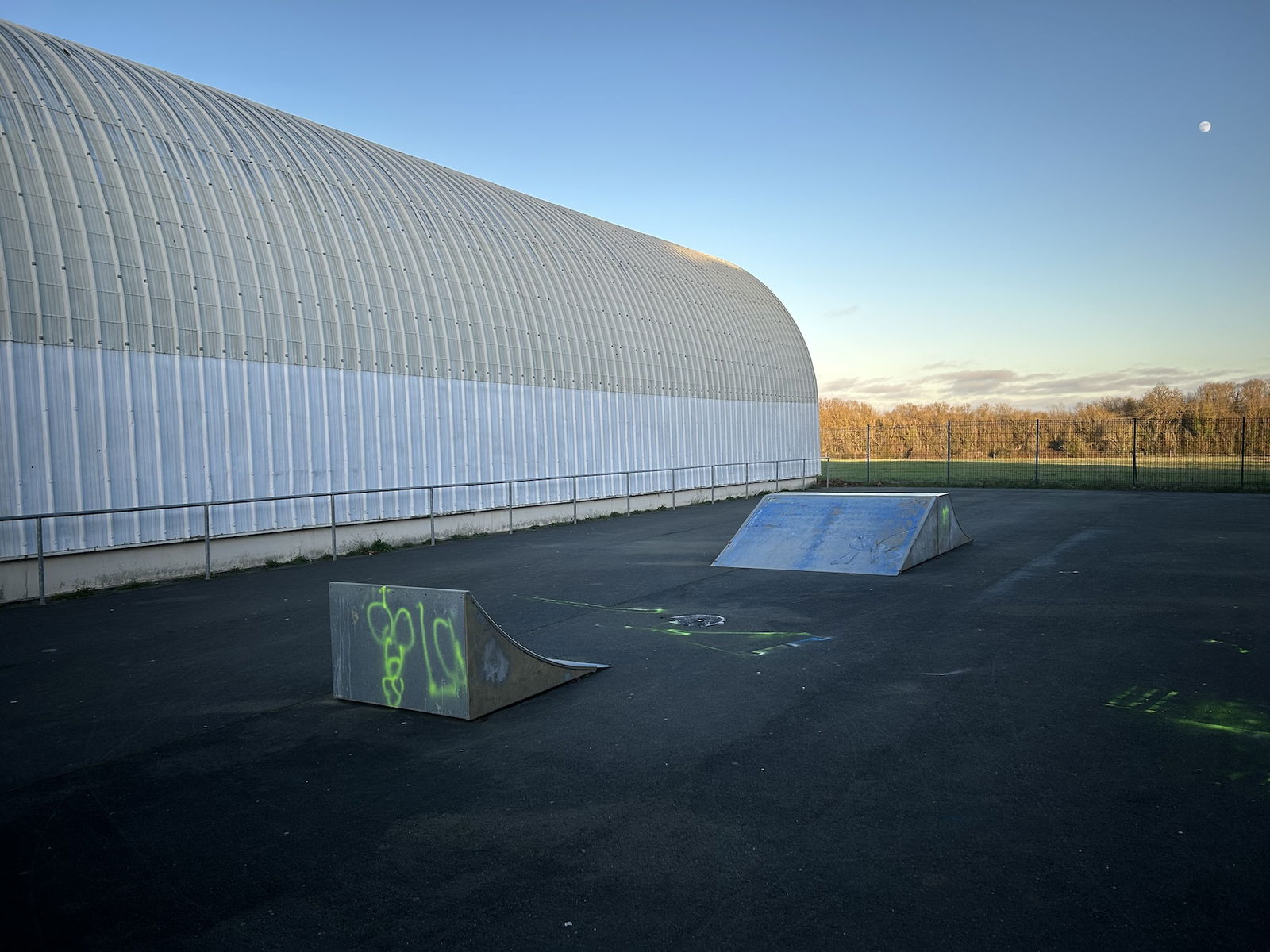Dompierre sur Mer skatepark is made up of a back and forth run with a quarter pipe and bank on the sides of a funbox.