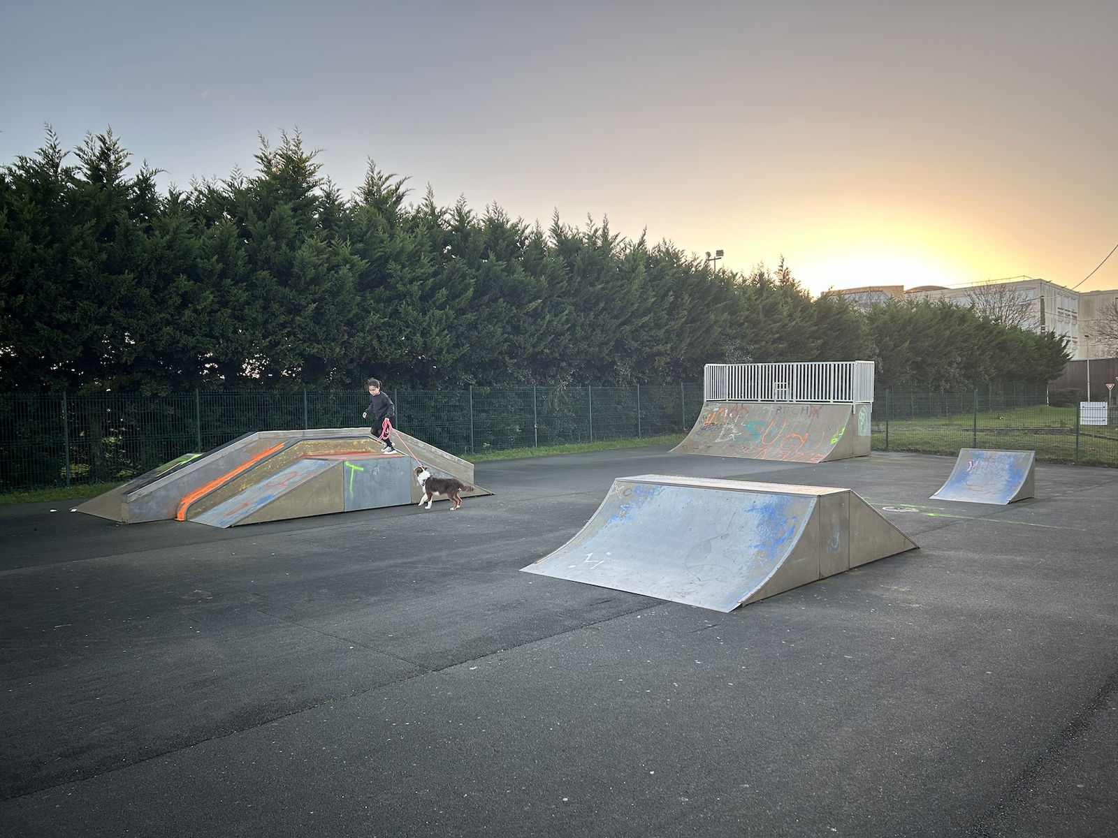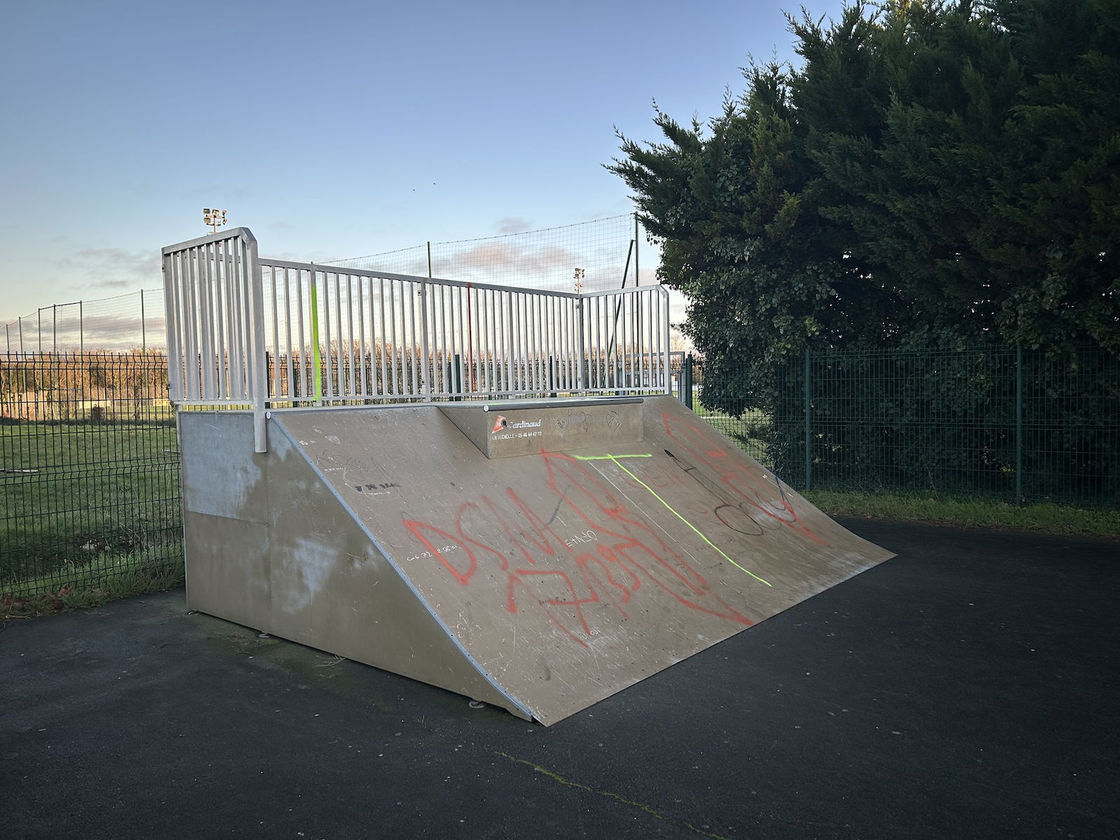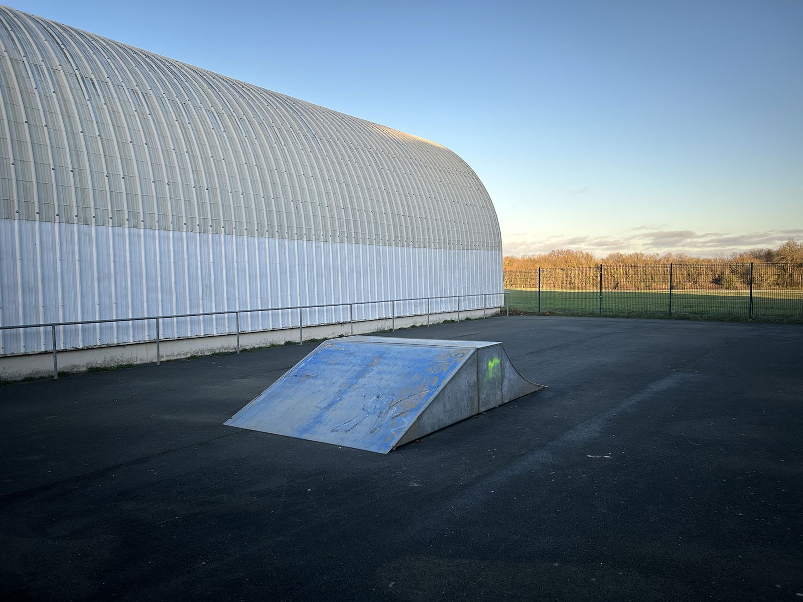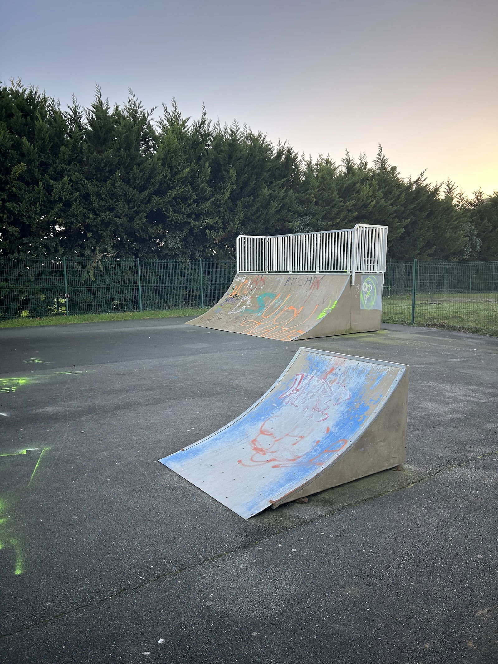 Dompierre sur Mer skatepark is made up of a back and forth run with a quarter pipe and bank on the sides of a funbox.