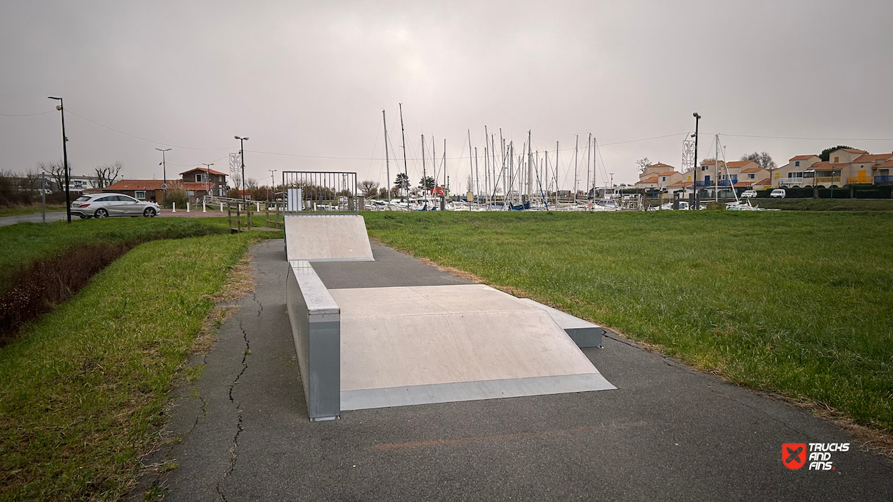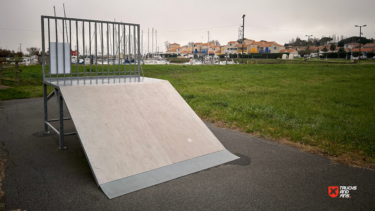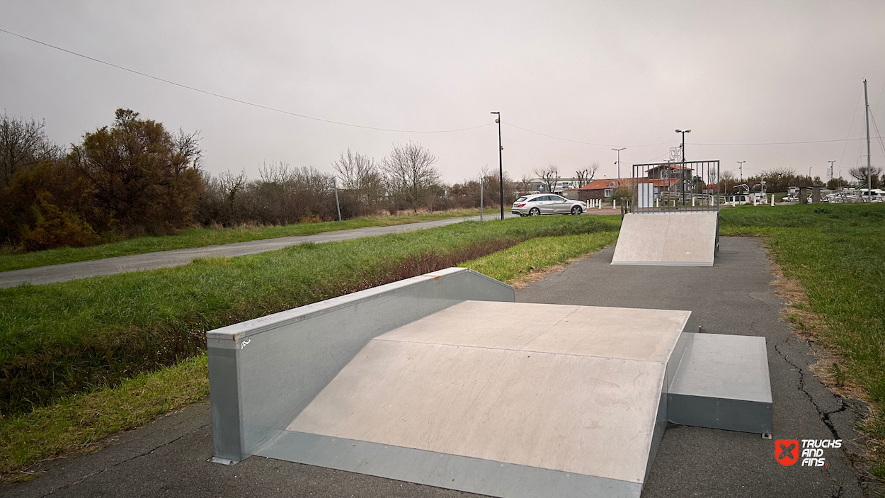 Du Port skatepark is made up of a back and forth run with a quarter pipe and flat bank either side of a funbox. The skatepark is located next to the harbour.