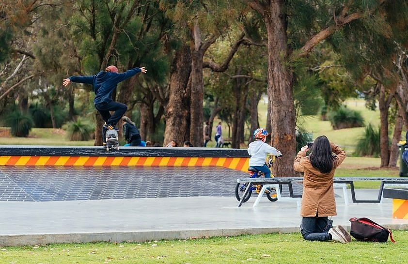 The skatepark includes features for all skill levels, such as a competition-level bowl, beginner's area, street section, and parkour obstacles. Additional facilities include a basketball half-court, bike and skateboard repair stations, and amenities like phone charging stations, free Wi-Fi, drink fountains, and seating. The park is known for hosting various events, including skate, BMX, and scooter competitions, organized by the City of Kwinana's Youth Team.