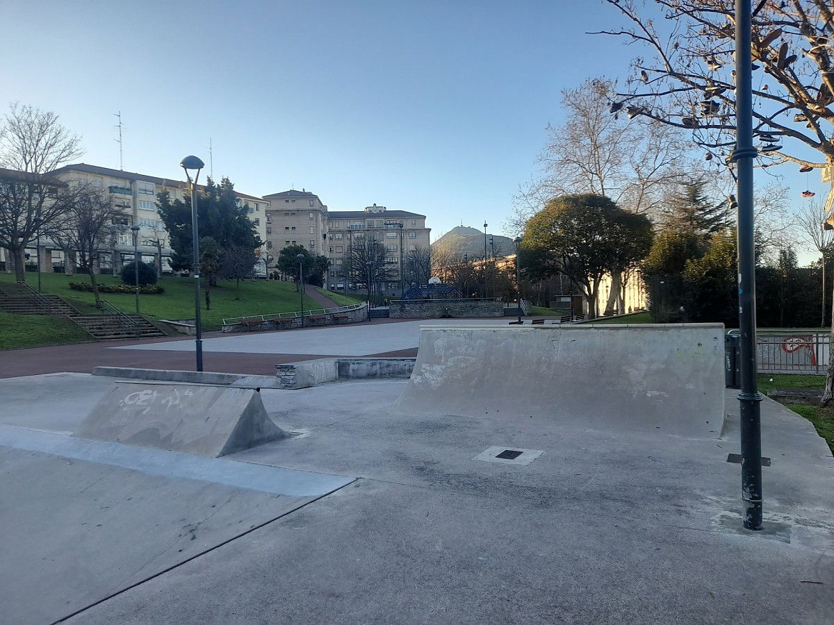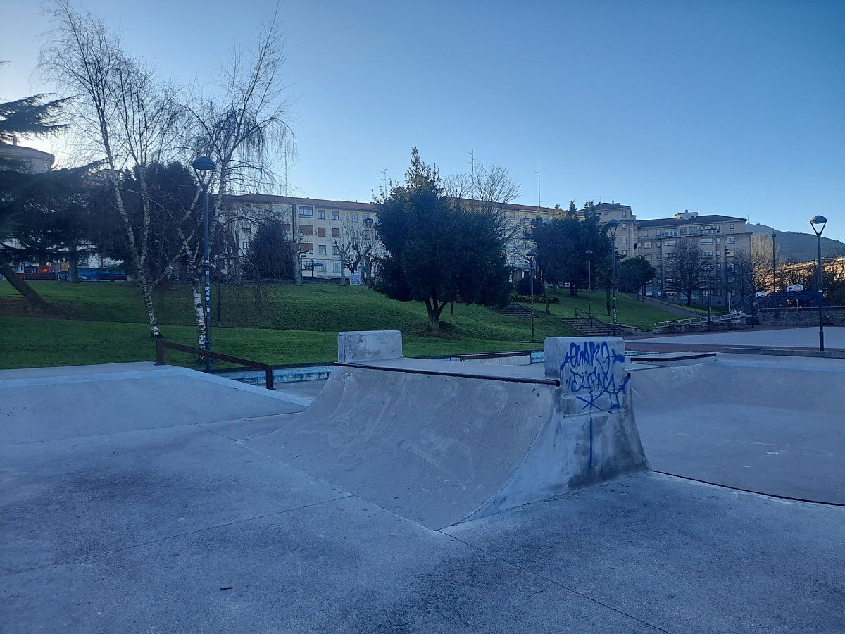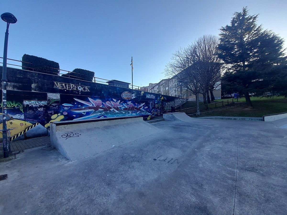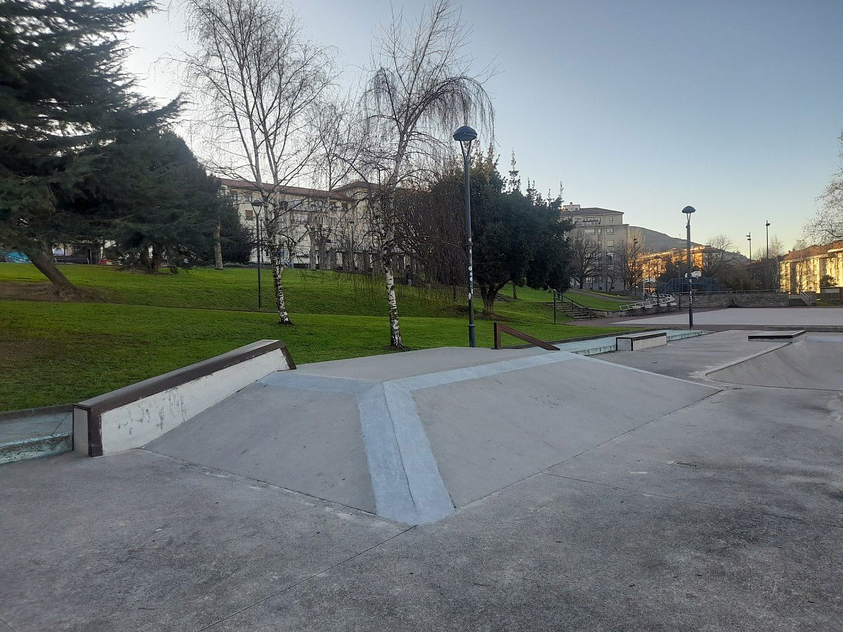 Un pequeño bowl muy sencillo y con algo de juego,varios cajones de angulo (uno subida y bajada,el otro solo subida o bajada),una piramide con una barandilla en bajada,varios cuarters pequeños y un plano inclinado con bordillo arriba.es algo divertido el park aunque el suelo no esta muy pulido y es el toque negativo en caso de caida