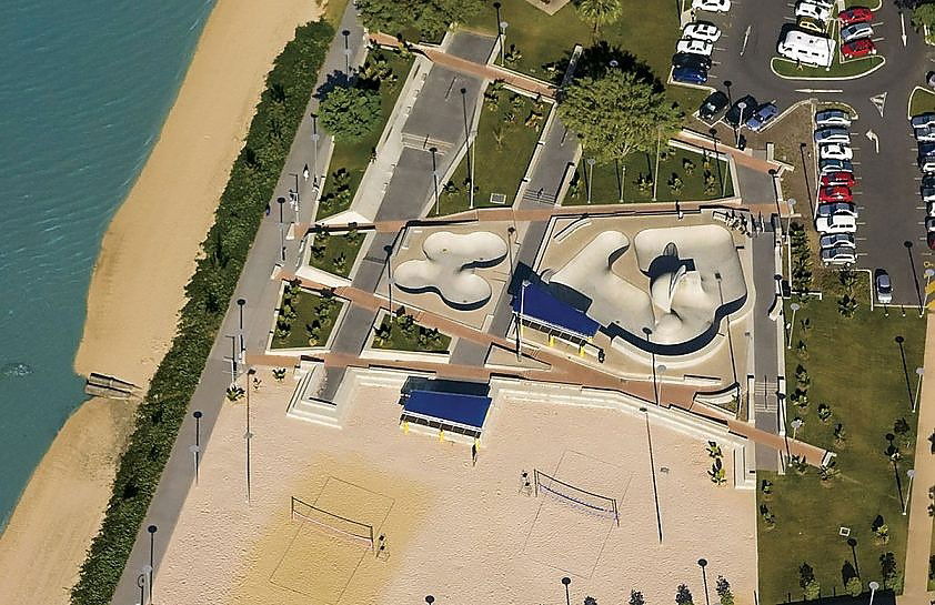 The Cairns Esplanade Skate Plaza, located on the foreshore of Cairns, Queensland, was designed and constructed by Convic and officially opened in 2007. At the time of its opening, it was the largest skate facility in Australia, covering approximately 2,300 square meters. The skatepark features a combination of bowls and street-style elements, catering to both casual skaters and professionals. Key features include large bowls, ledges, and other street obstacles that provide a well-rounded skating experience.