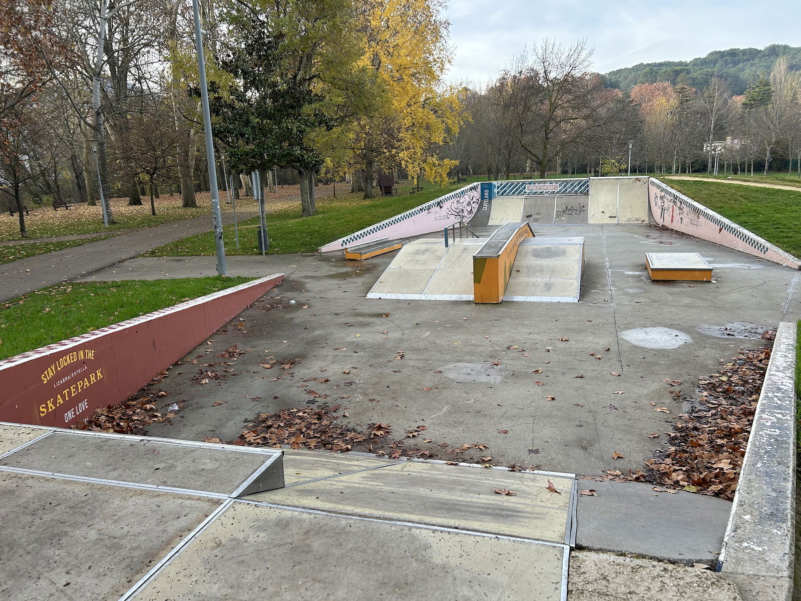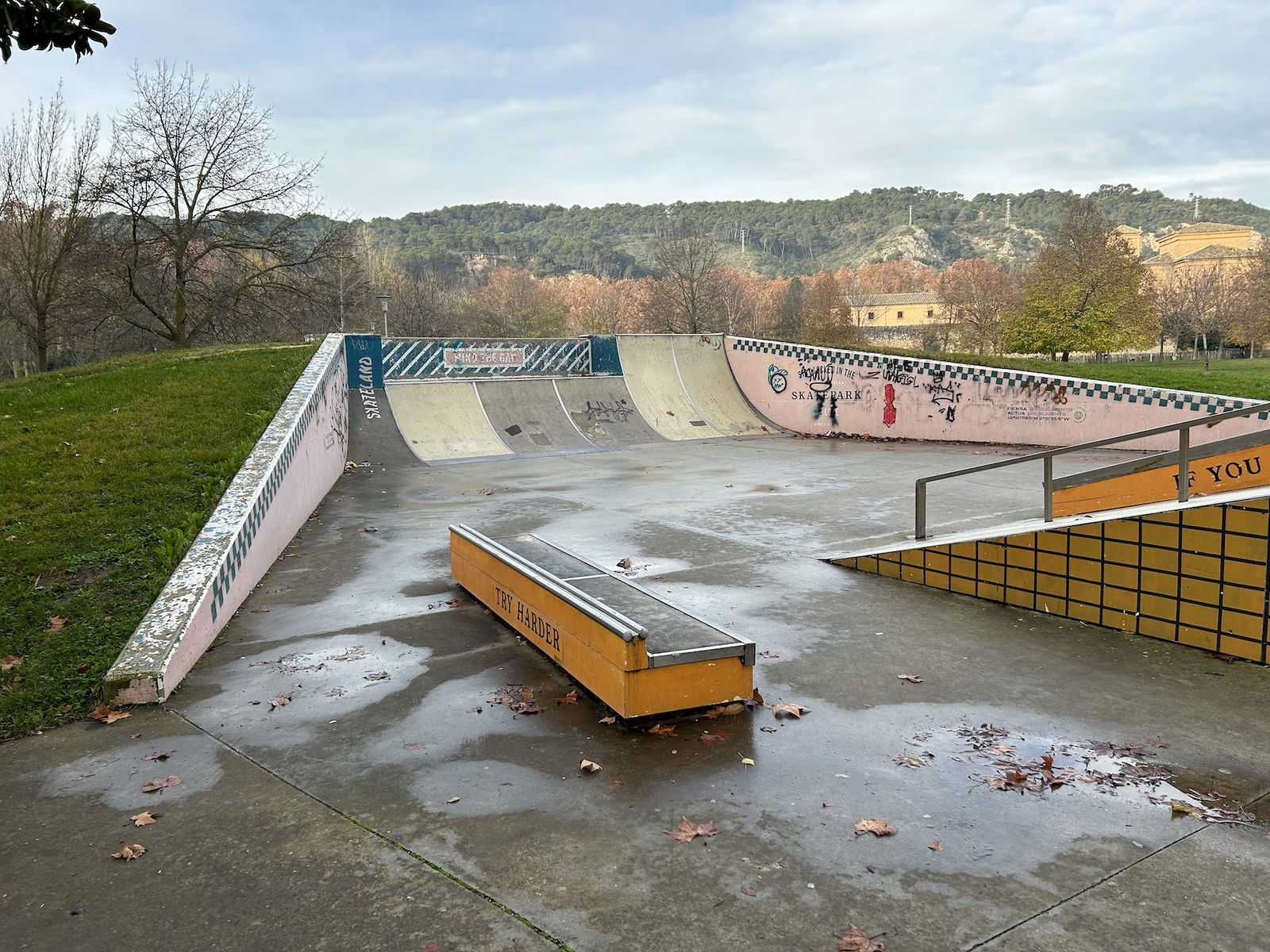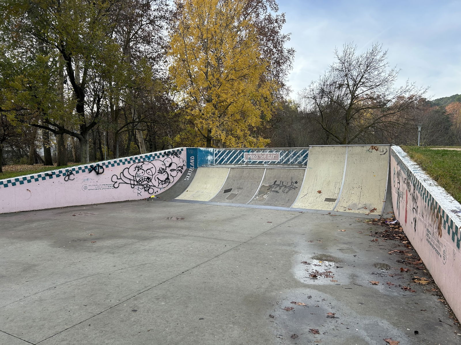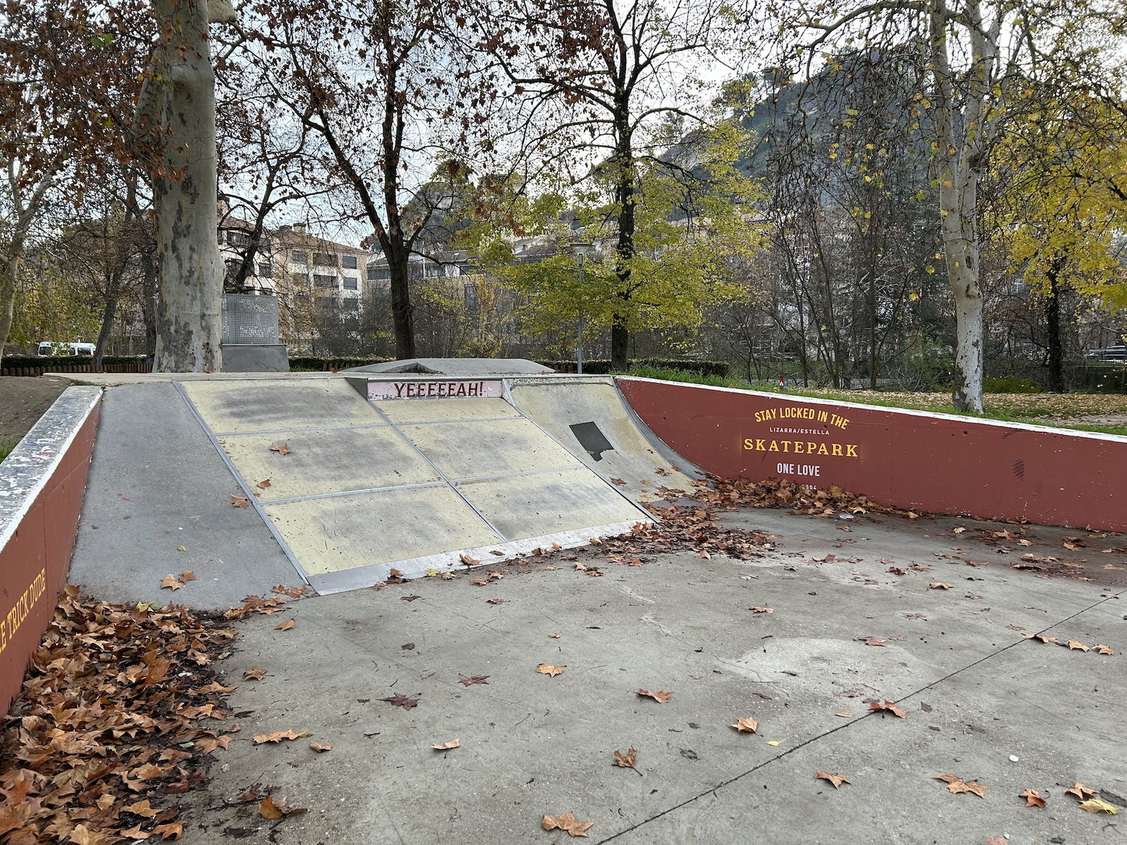 Estella skatepark is made up of a back and forth run with a quarter pipe and bank on the sides of a funbox. The skatepark also features a miniramp.