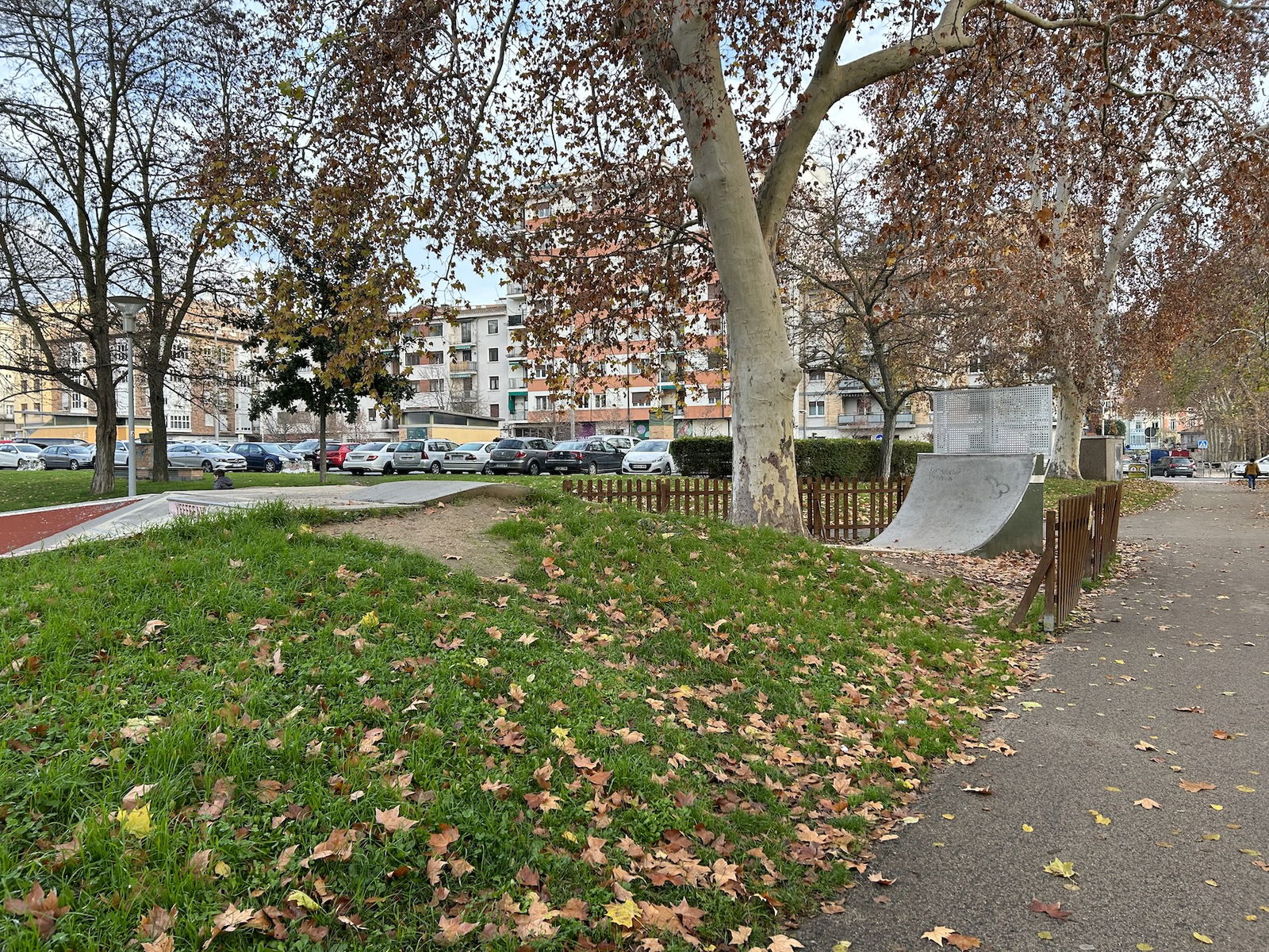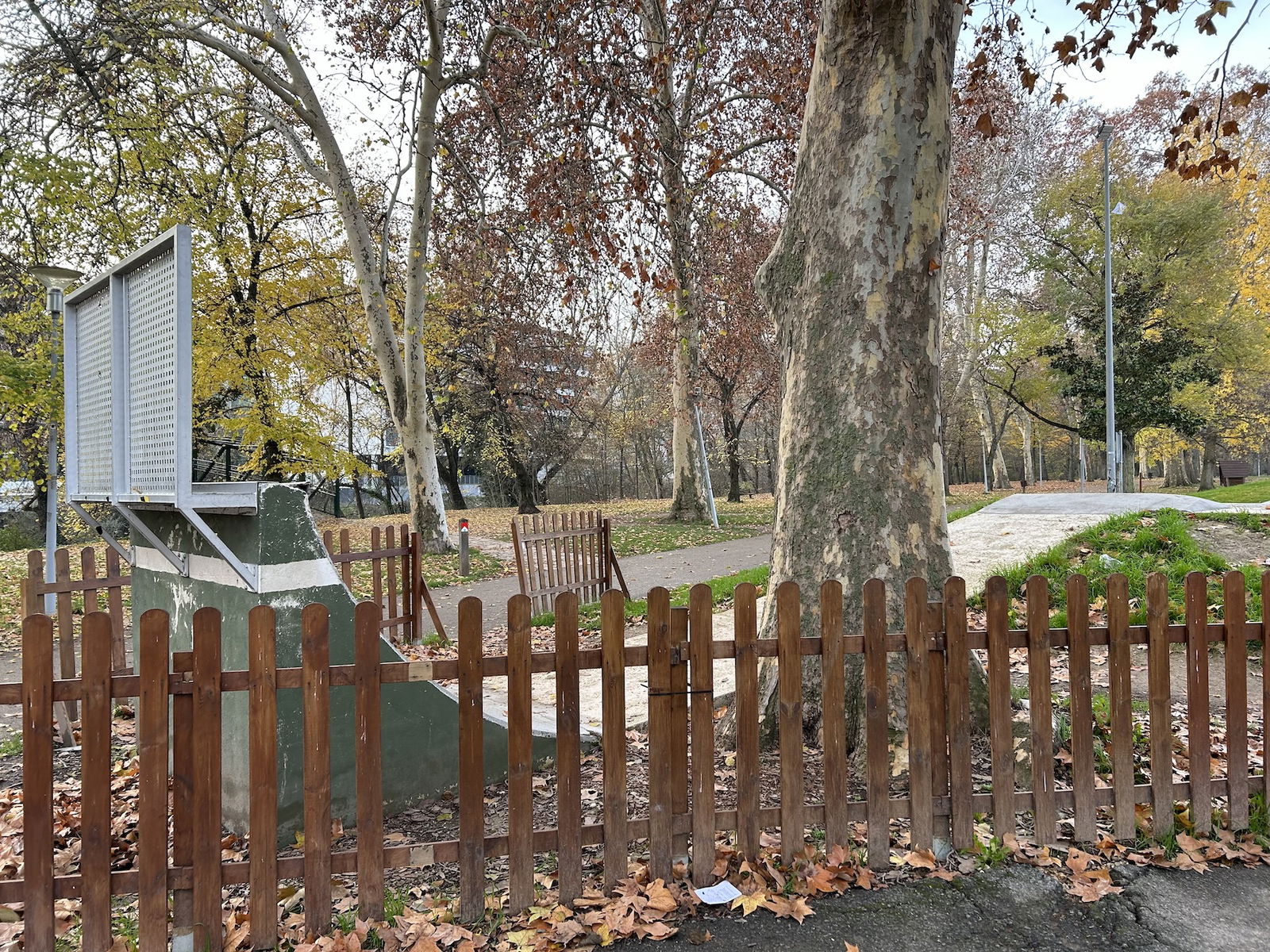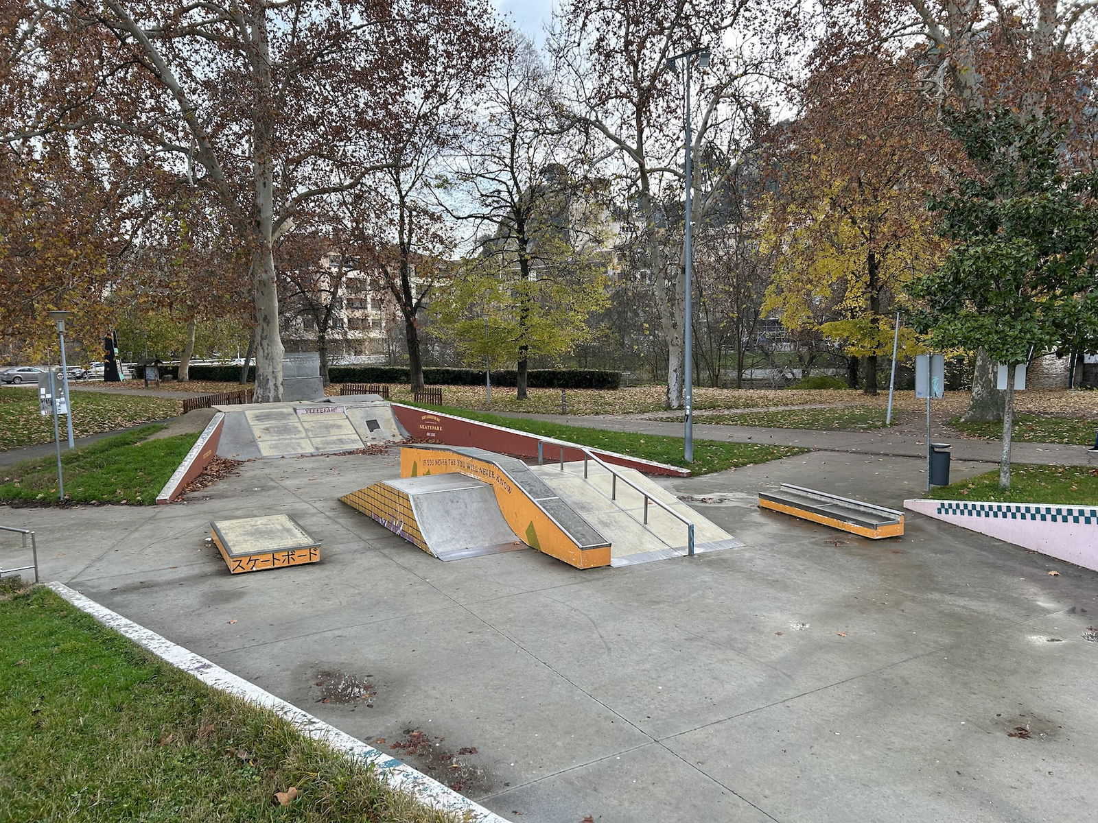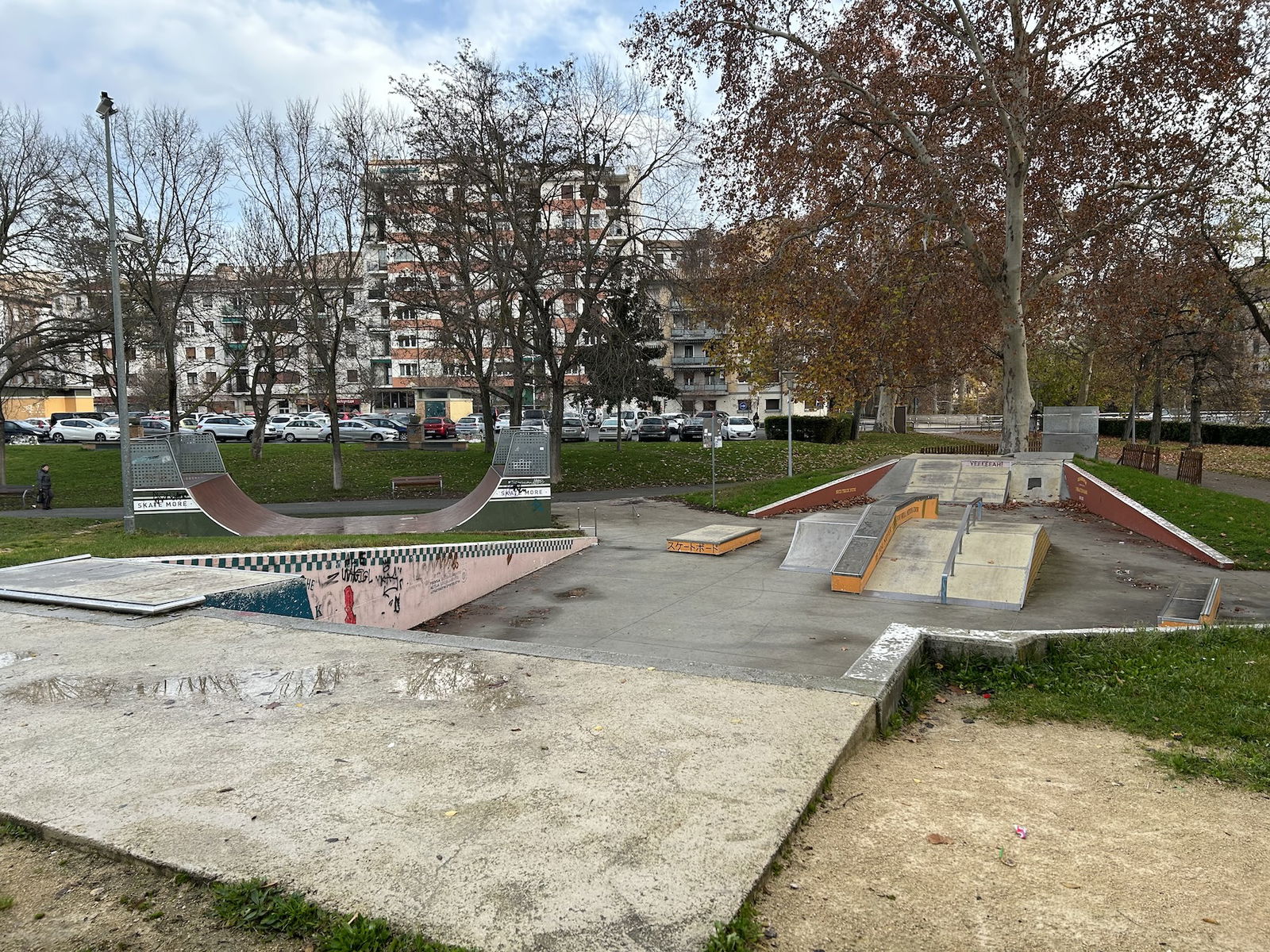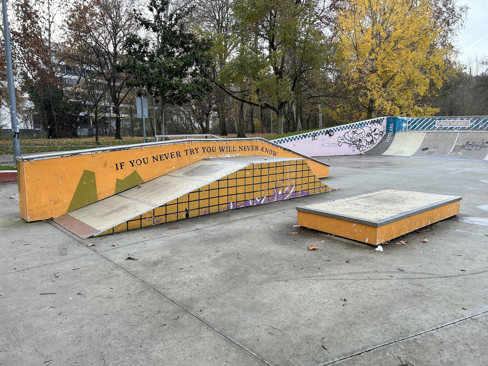 Estella skatepark is made up of a back and forth run with a quarter pipe and bank on the sides of a funbox. The skatepark also features a miniramp.