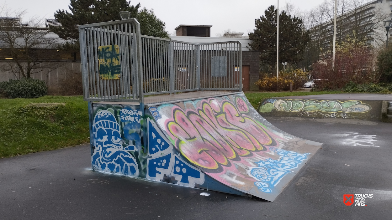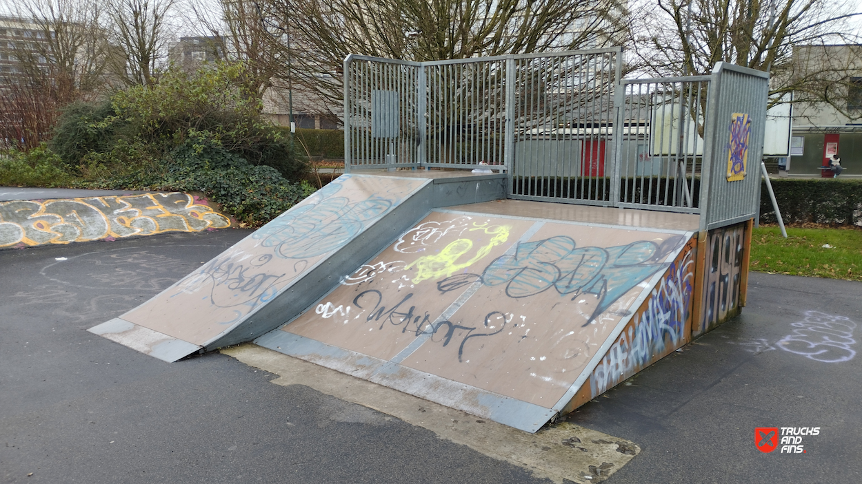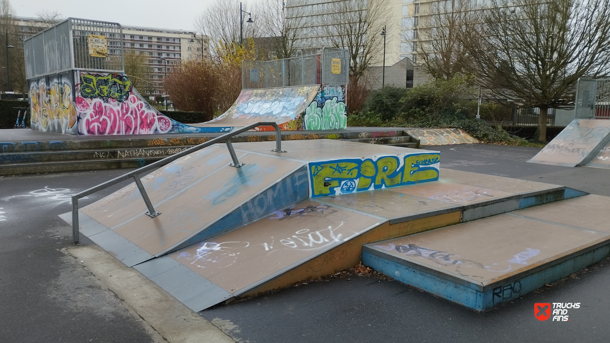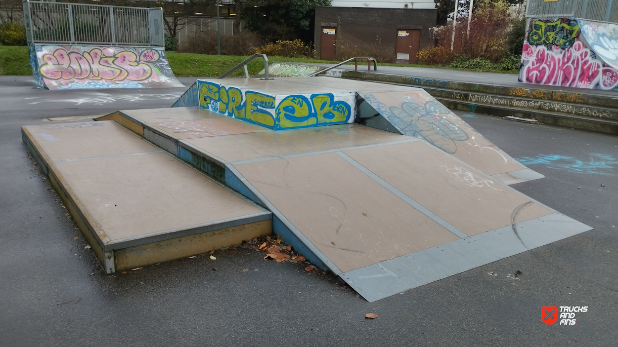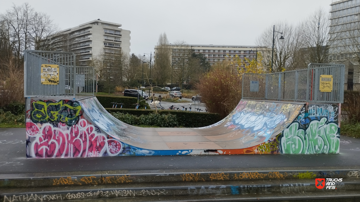 Evere skatepark, also known as Triton skatepark, features a miniramp and a back and forth street area with a quarterpipe on one end, a bank on the other end and a funbox in between. The skatepark was built by Rhino Ramps.