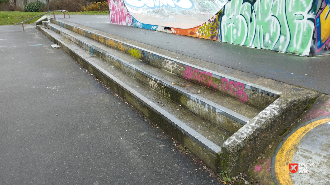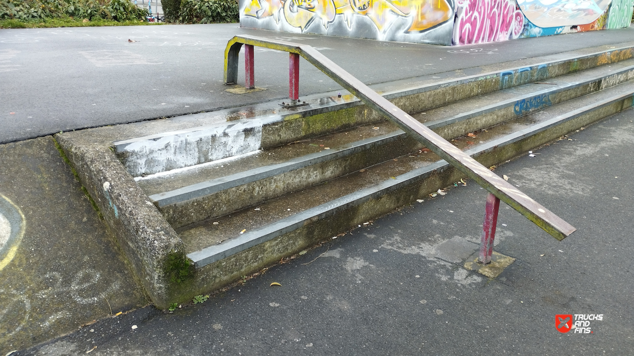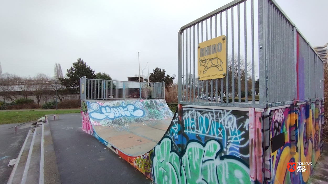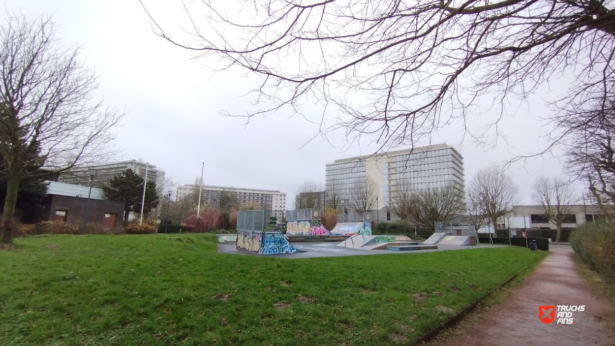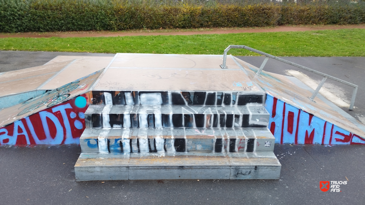 Evere skatepark, also known as Triton skatepark, features a miniramp and a back and forth street area with a quarterpipe on one end, a bank on the other end and a funbox in between. The skatepark was built by Rhino Ramps.