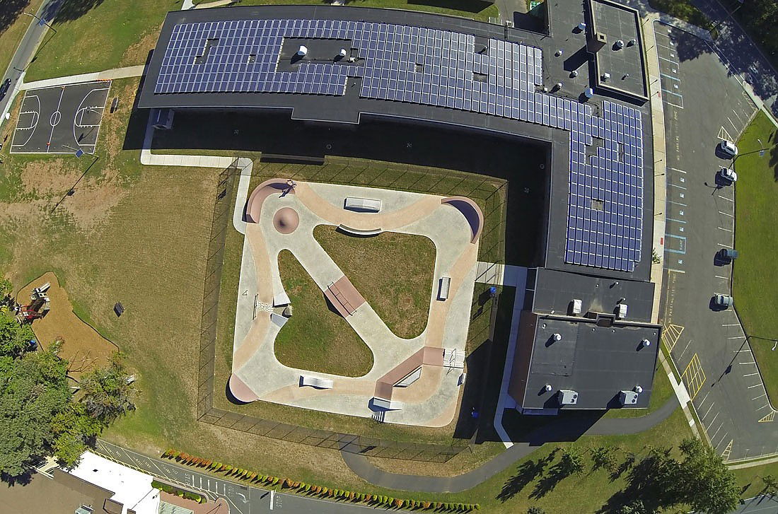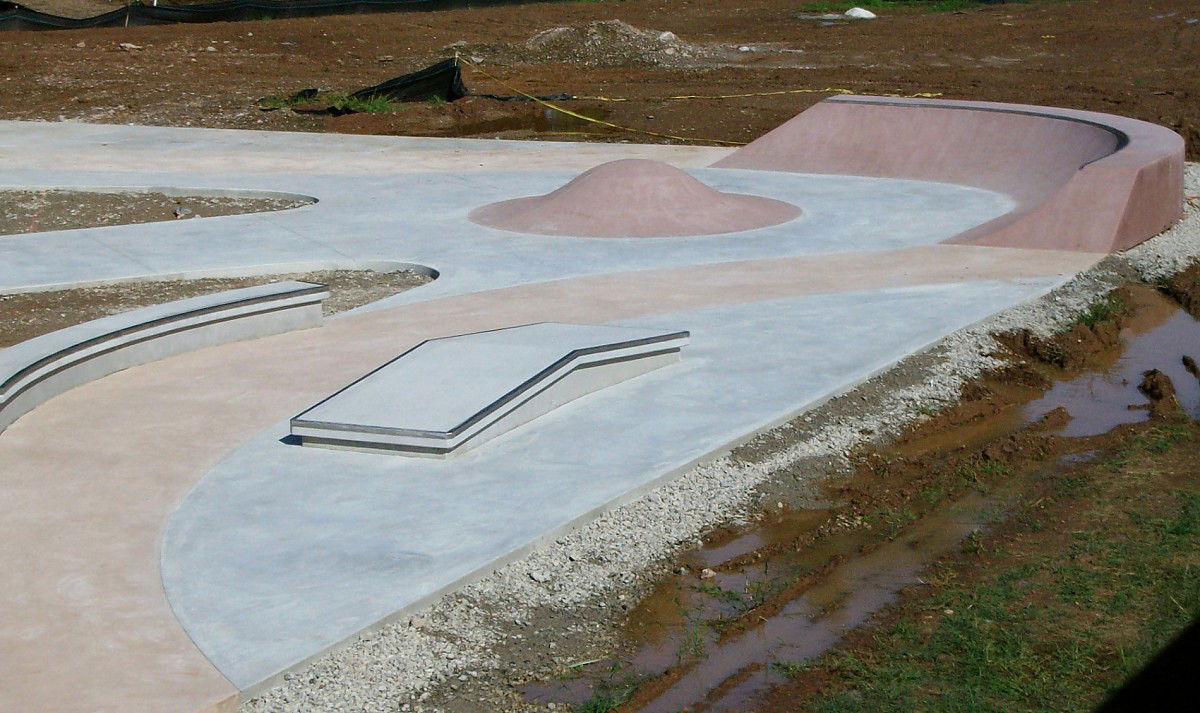 The Evergreen Center Skatepark, located in Colonia, New Jersey, opened in 2012 and spans 10,000 square feet. Designed and built by SpohnRanch, this skatepark was the second collaboration between SpohnRanch and Woodbridge Township. The park was conceived through community input sessions, where local skaters expressed their desire for a plaza-style design reminiscent of urban New York City streetscapes. To achieve this, the park features colored concrete, brick patterns, and a variety of street-style obstacles such as quarterpipes, stairs, handrails, hubba ledges, and a unique A-frame with a rail in the center.