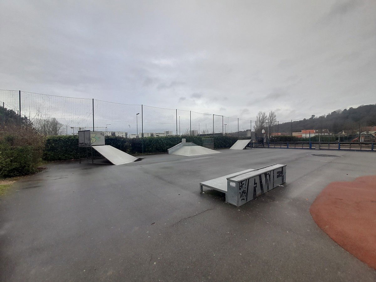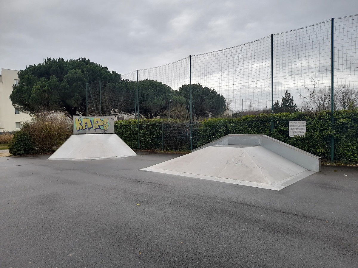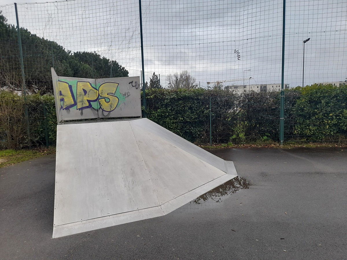 Floirac skatepark is made up of a back and forth run with a quarter pipe and bank on the sides of a funbox.
