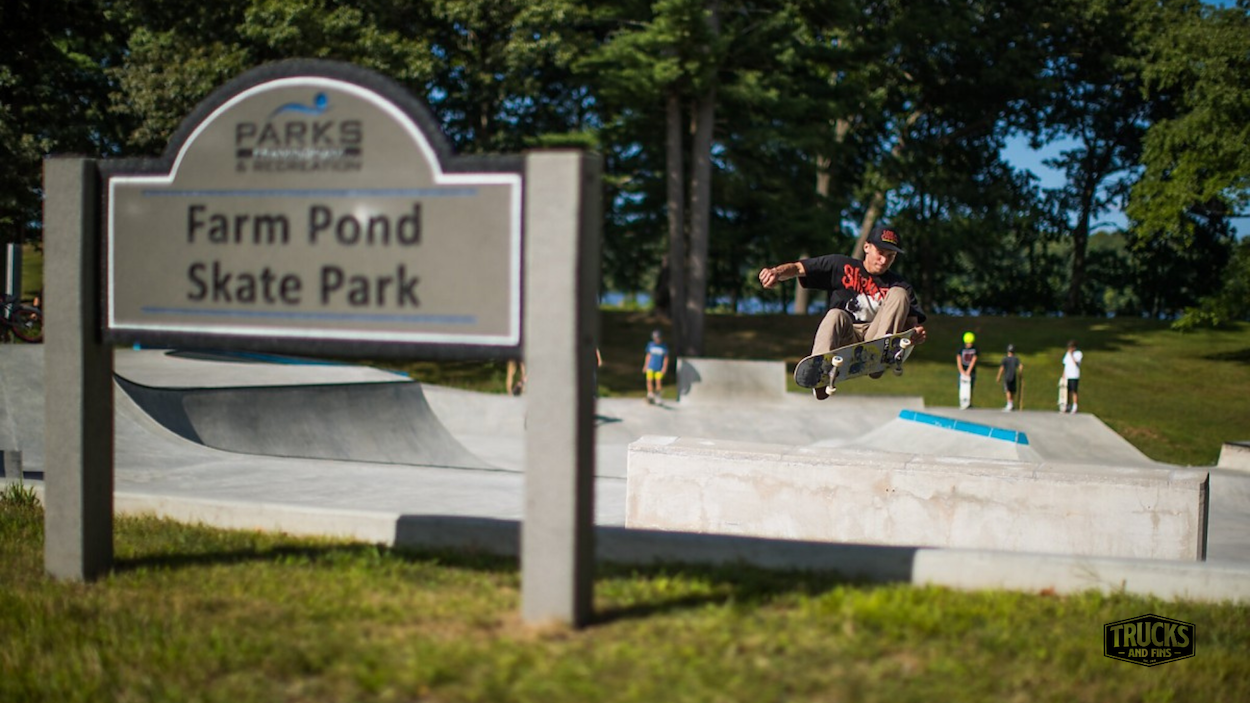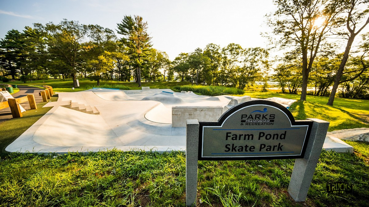 The Farm Pond Skatepark, also known as the Framingham Skatepark, is a 10,000-square-foot concrete park located at Farm Pond Park on Dudley Road in Framingham, Massachusetts. This skatepark was completed in 2018 following extensive community involvement and design input. The skatepark features both bowl and street elements, making it versatile for various skill levels and riding styles. Key features include a large open bowl with multiple hips, quarter pipes, stairs, ledges, banks, a spine, and a vert wall ride, providing options for both flow and technical tricks.