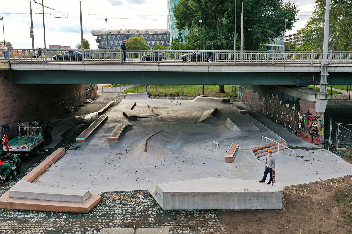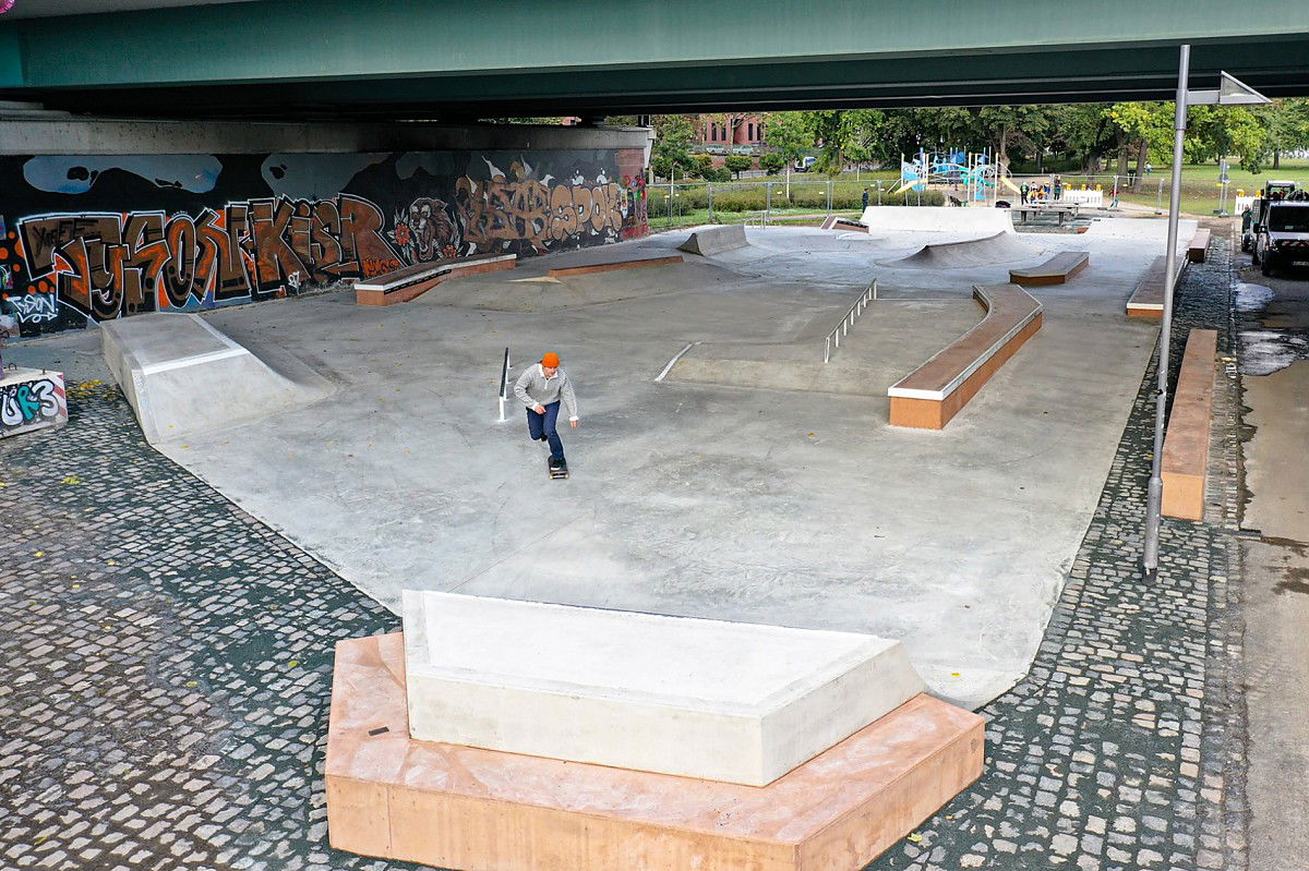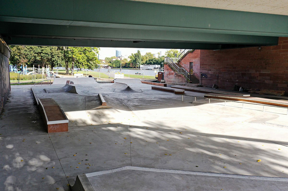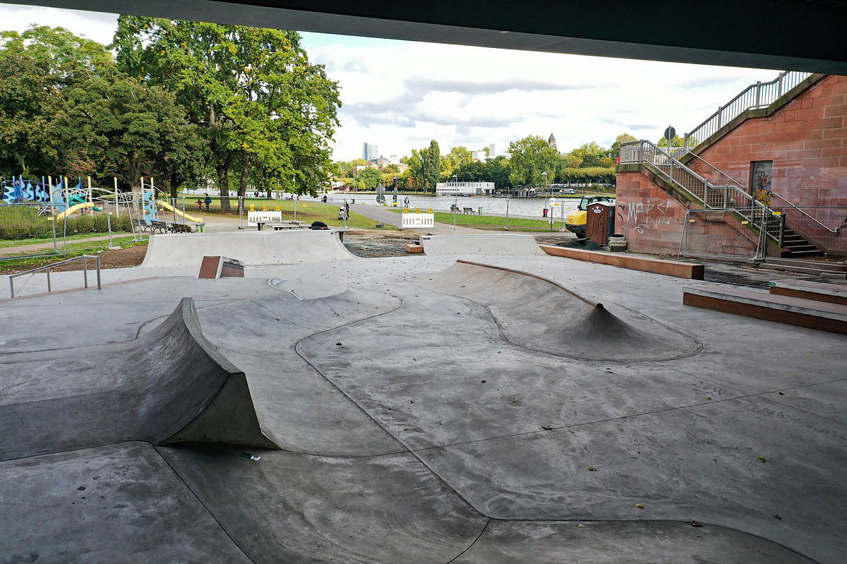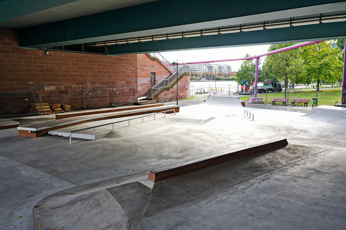 Friedensbrücke Skatepark is a 850 square meter concrete park built by Yamato Living Ramps in 2021 replacing the old wooden ramps. It‘s Frankfurt‘s new skatepark show-piece in Gutleutviertel: Some real-street-obstacles paired with flowy lines! Banana-spine, USC-ledge, bank-to-slappy, bank-to-Jersey and much more... Original concrete shapes accented with pigmenting.