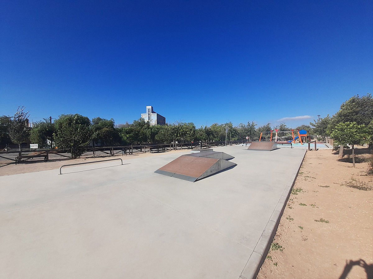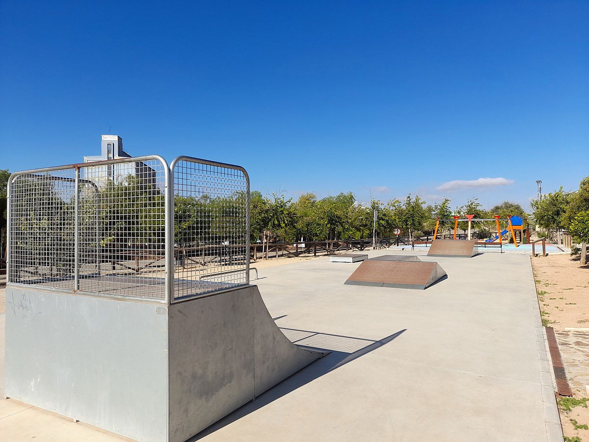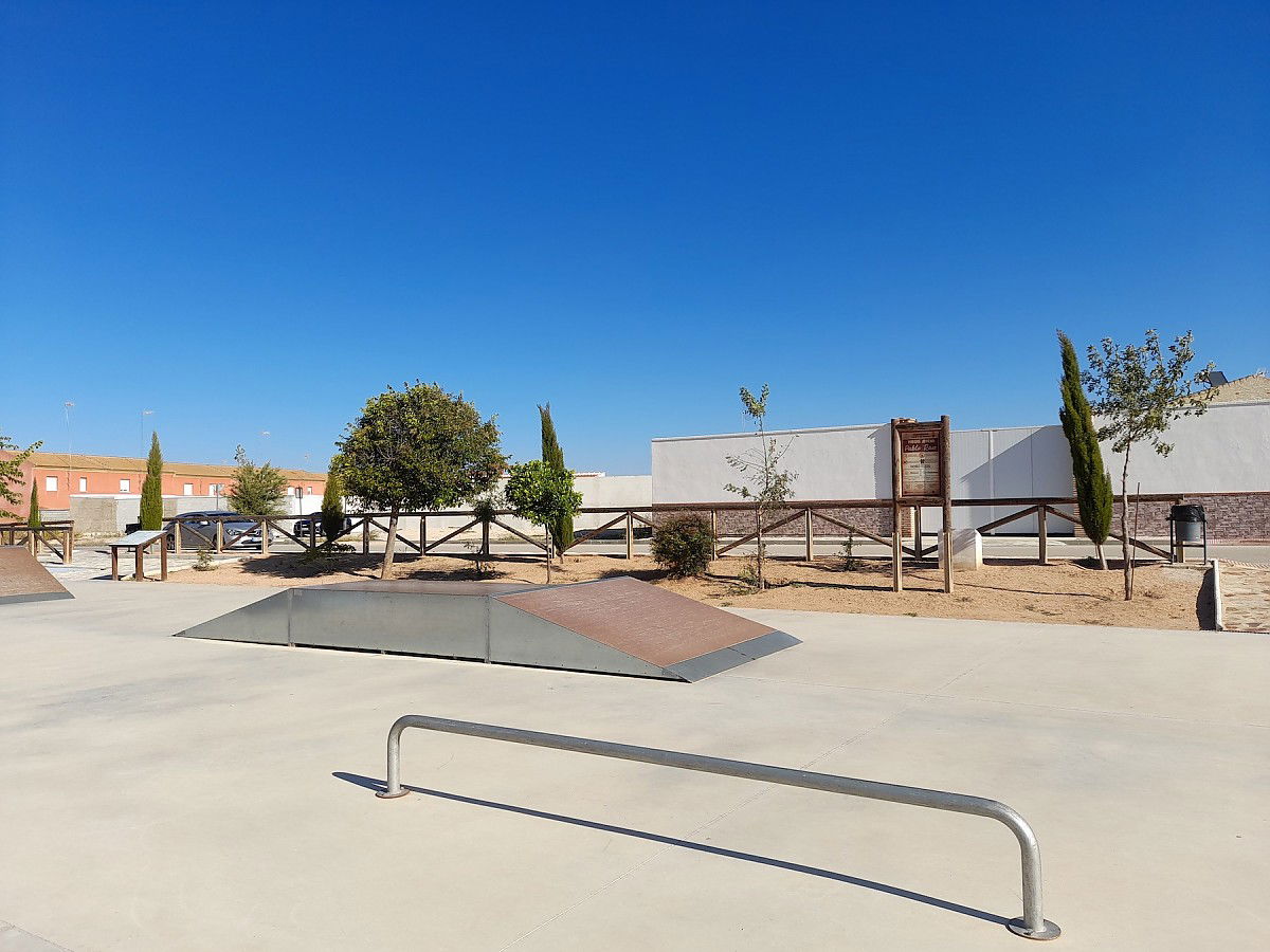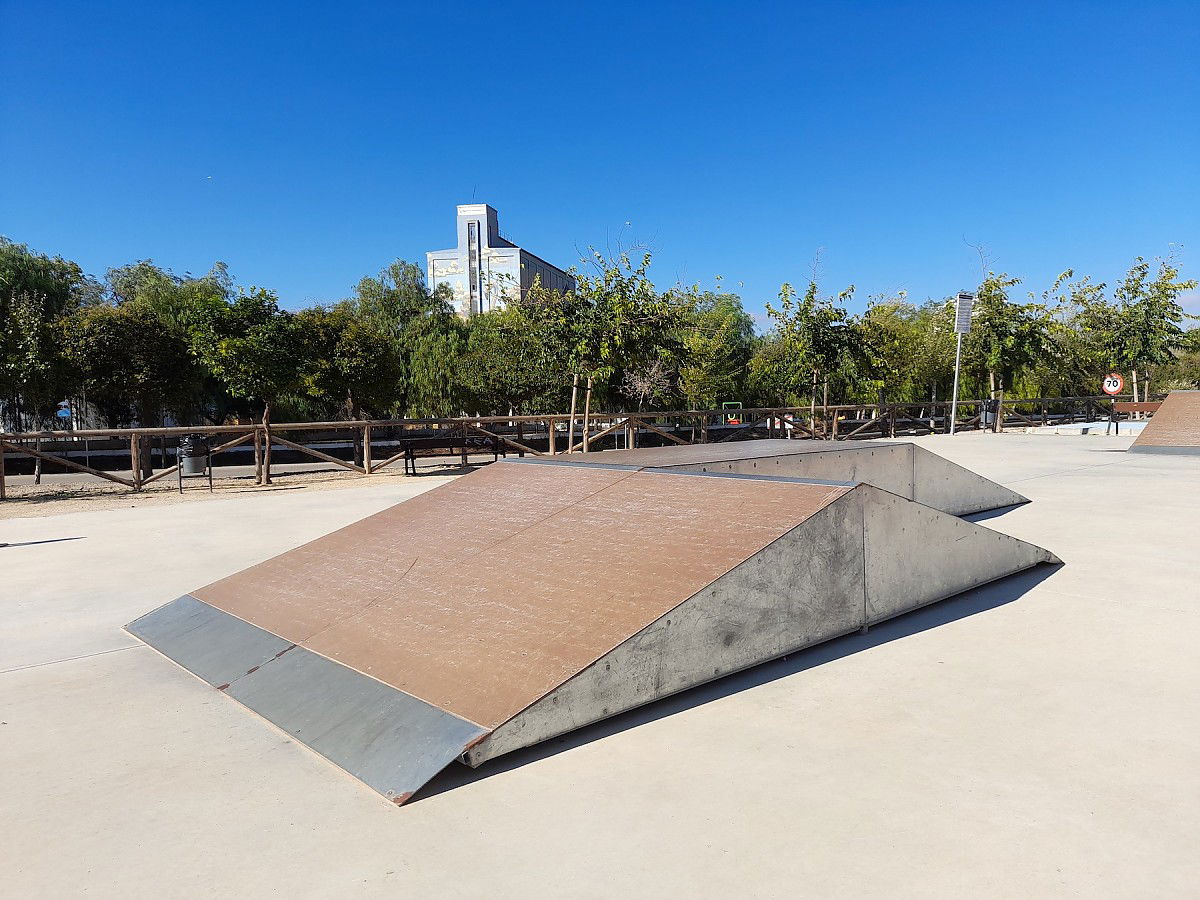 Fuente de Piedra skatepark, also known as Pablo Raez skatepark, is made up of a back and forth run with a quarter pipe and bank on the sides of a funbox.