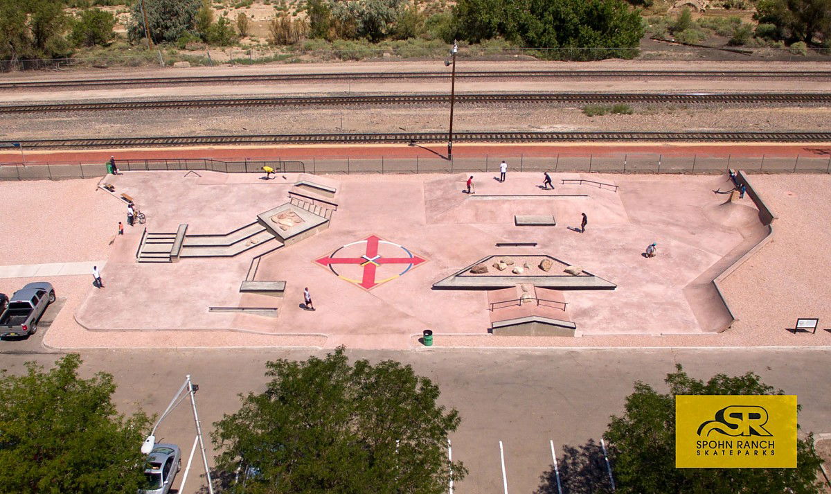 The skatepark's design features a mix of street obstacles such as a quarter pipe, manual pads, a London gap, handrails, flat rails, ledges, stairs, and a funbox. There’s also a long quarter pipe with varying heights, allowing for more creative tricks. A standout feature is a painted medicine wheel in the center of the park, reflecting the cultural heritage of the surrounding Navajo Nation and Zuni Reservation communities.