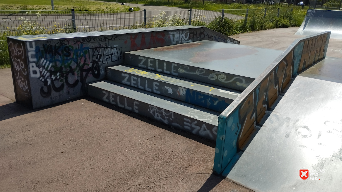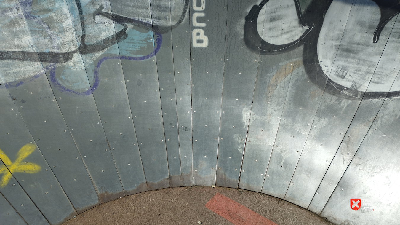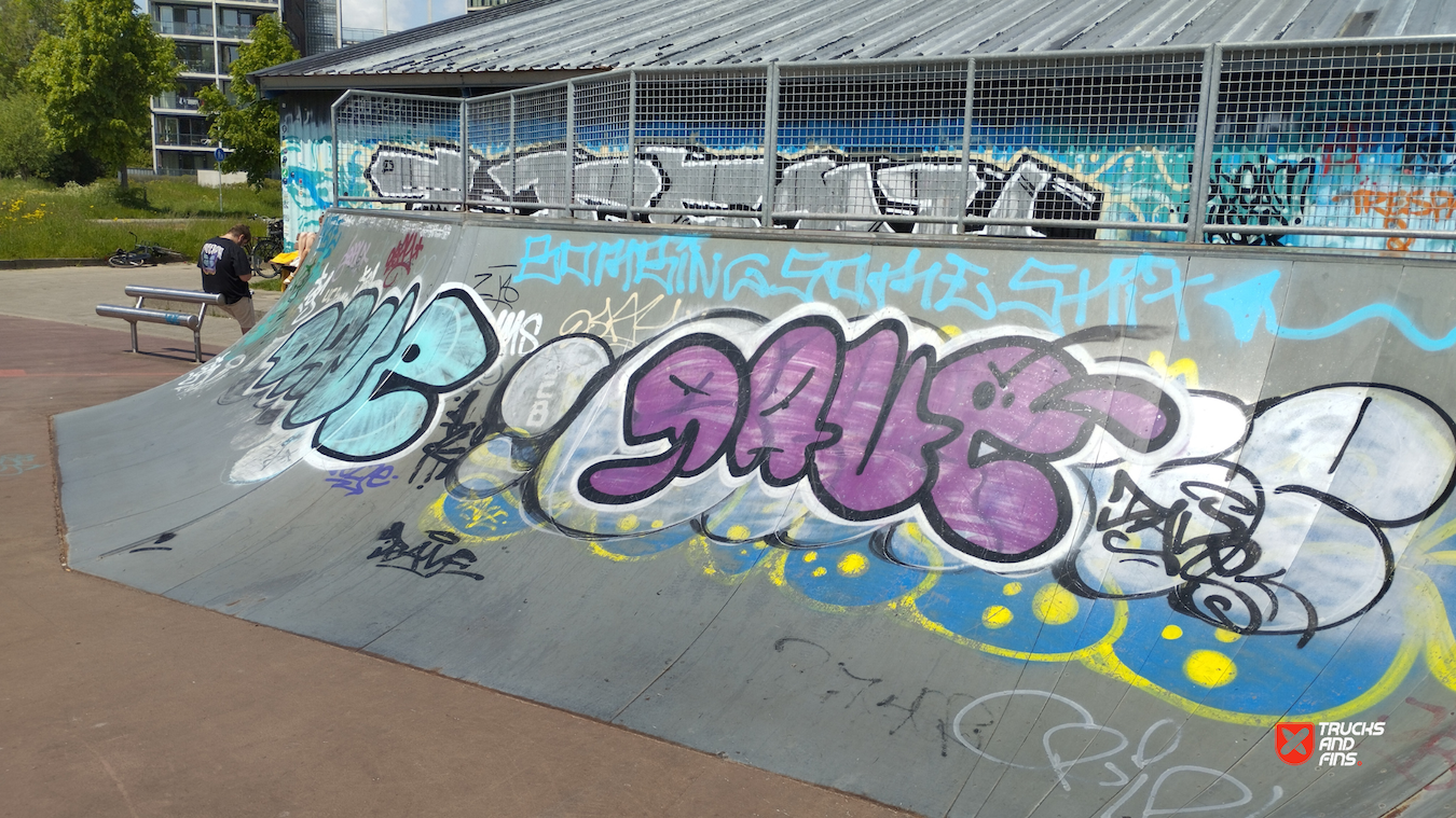 Smooth surface with decent metal obstacles, U-shaped halfpipe has strange construction which isn't easy to skate.