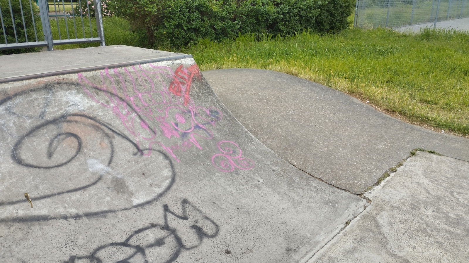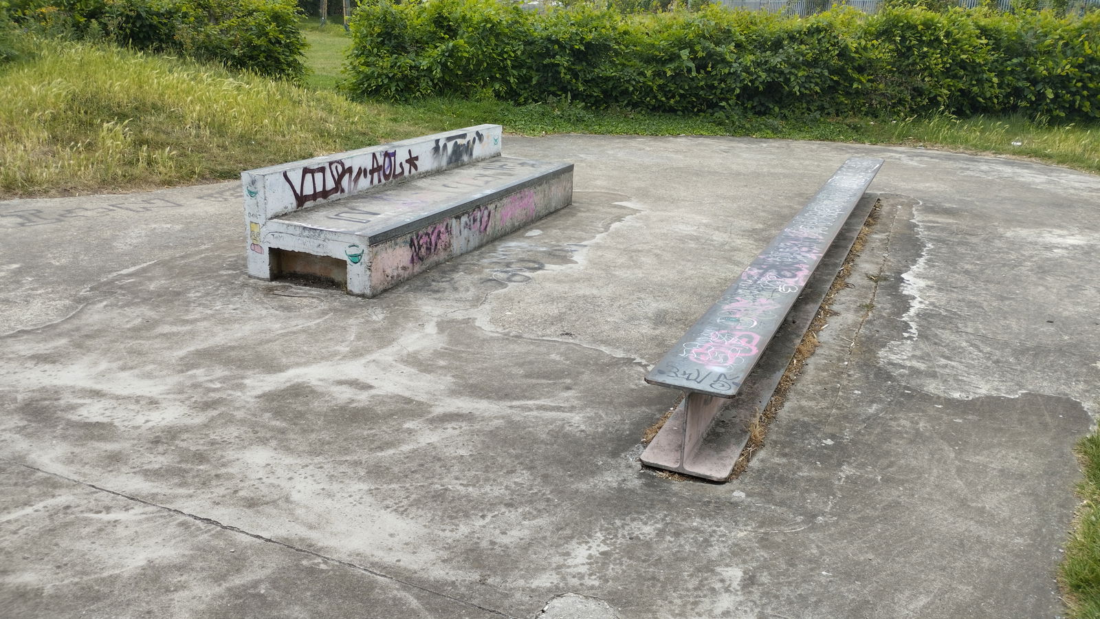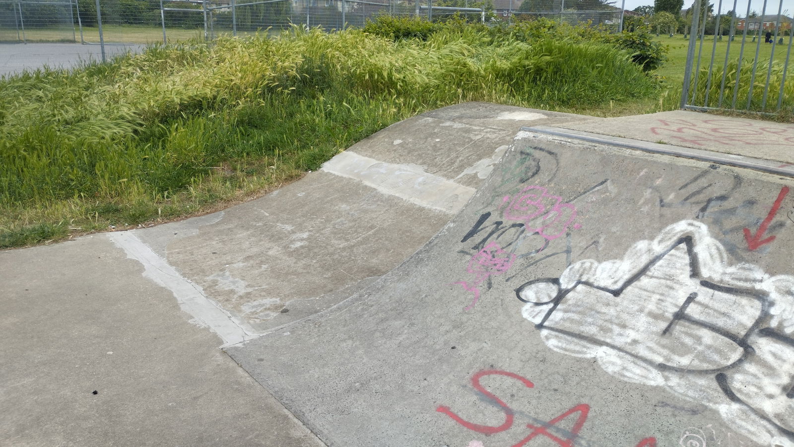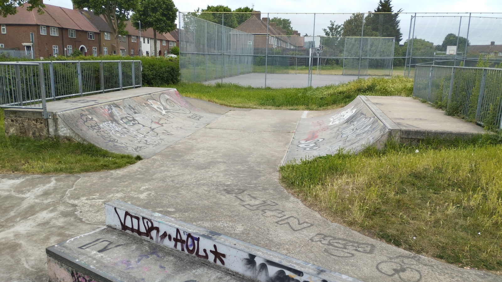 Goresbrook park skatepark features a concrete miniramp and several ledges.