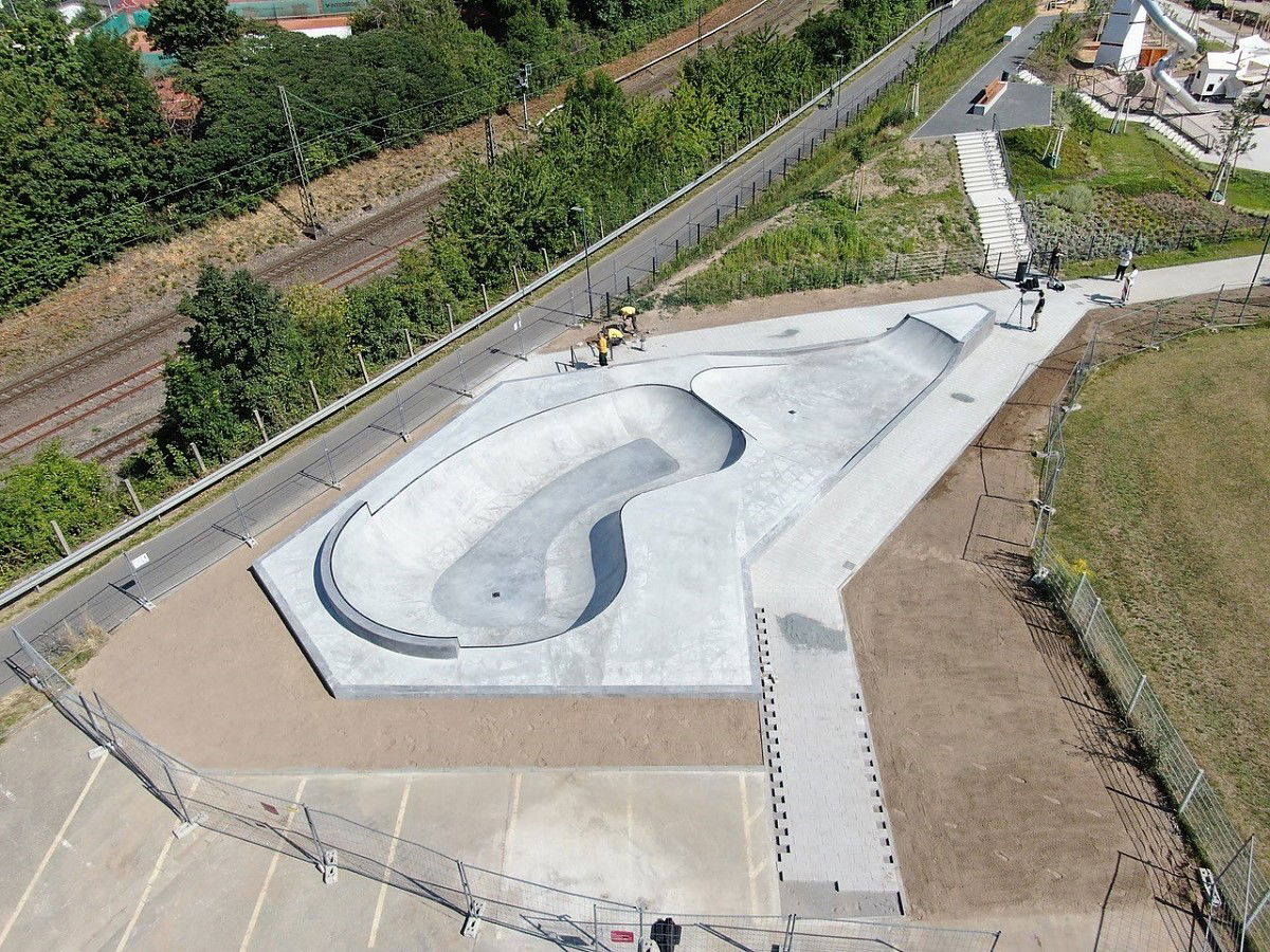Heidelberg Bowl is a concrete, kidney-shaped bowl with an extension on the deep end and a spine on the shallow one, where it is joined by a flat area with some mellow transition. It was designed by endboss and built in 2020 by Yamato Living Ramps.
