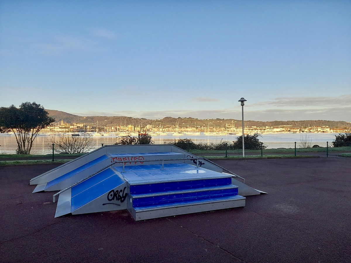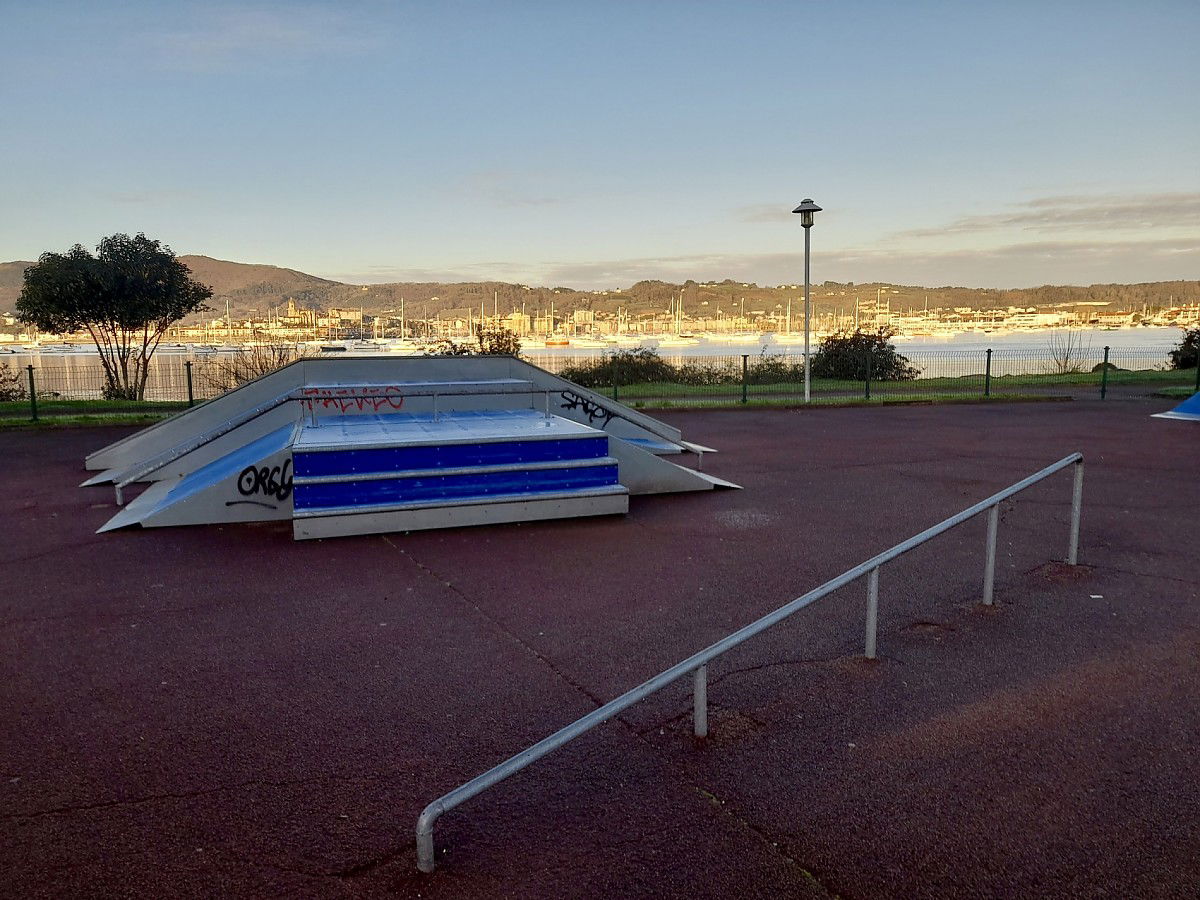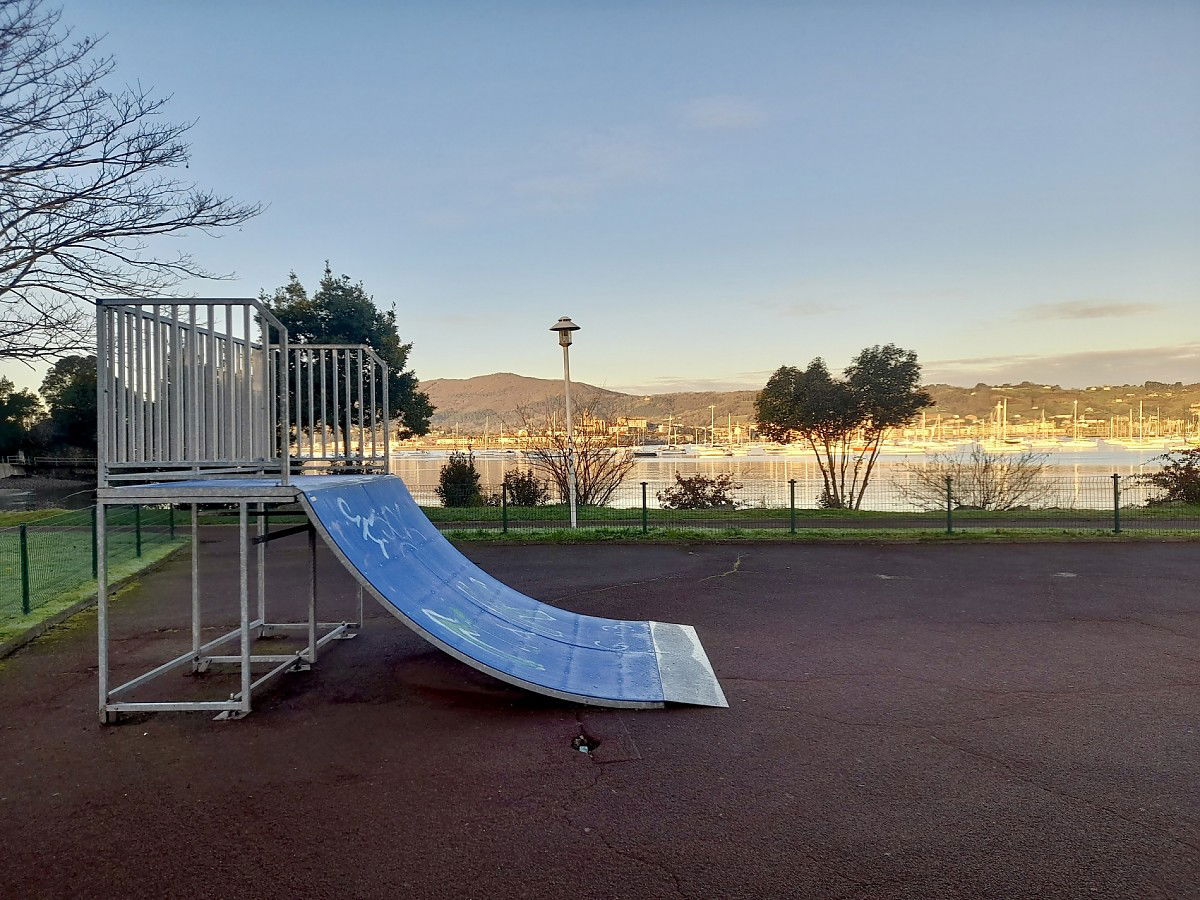 Hendaye skatepark is made up of some metal ramps in a back and forth run with a quarter pipe and bank on the sides of a funbox.